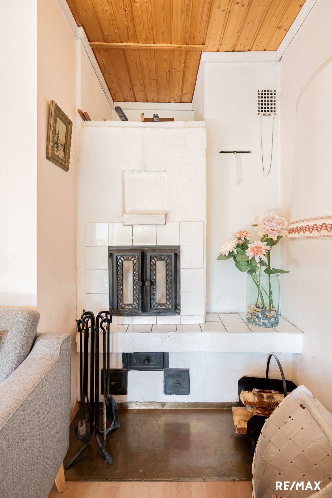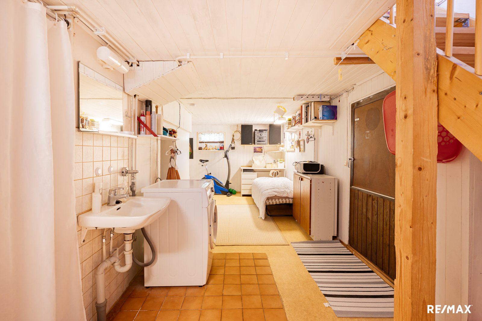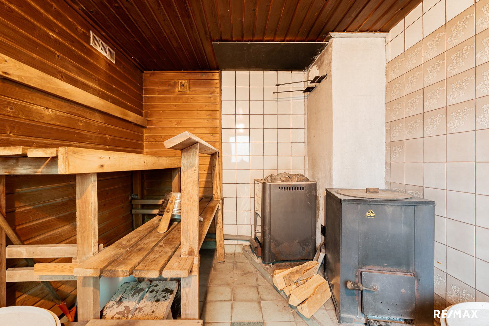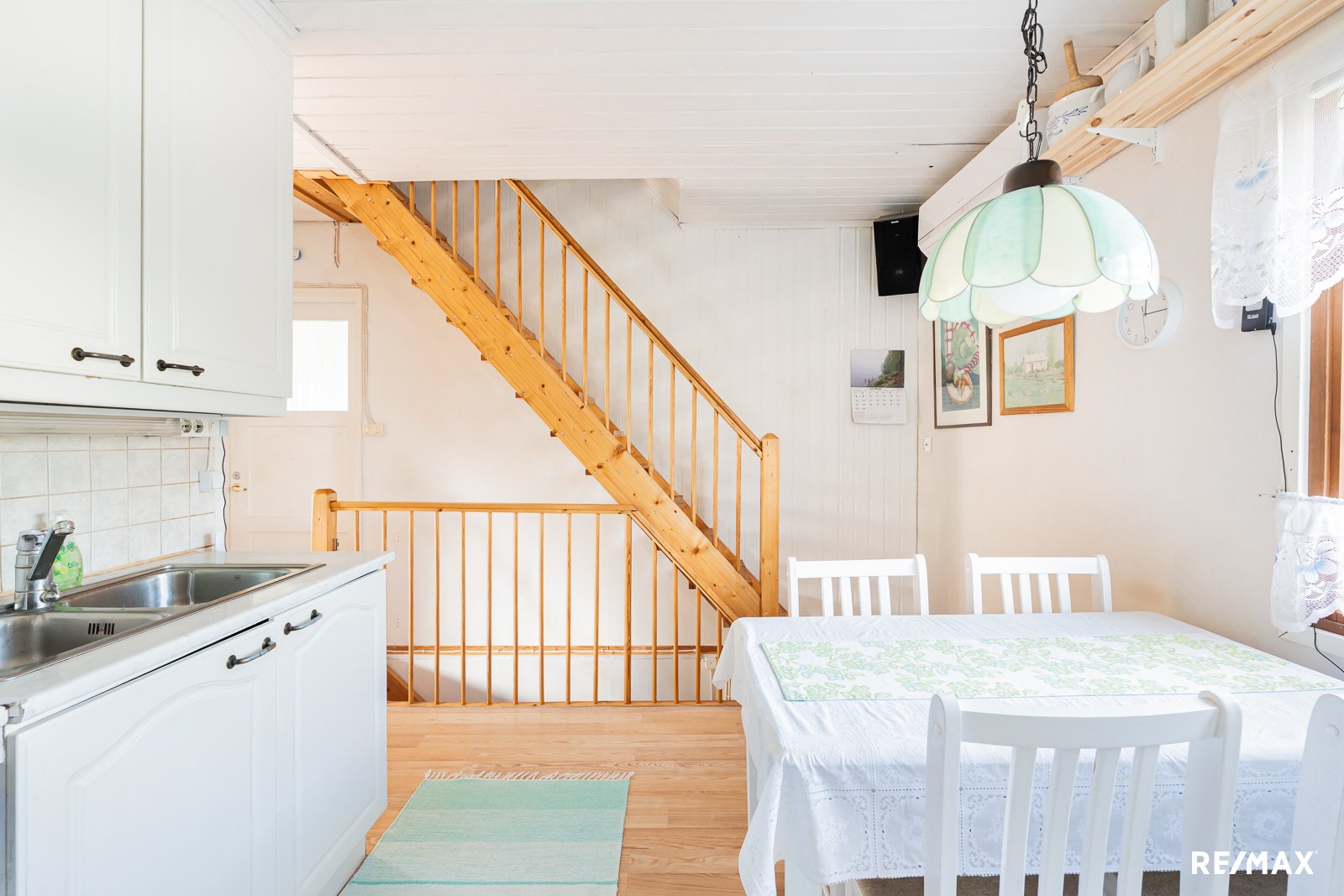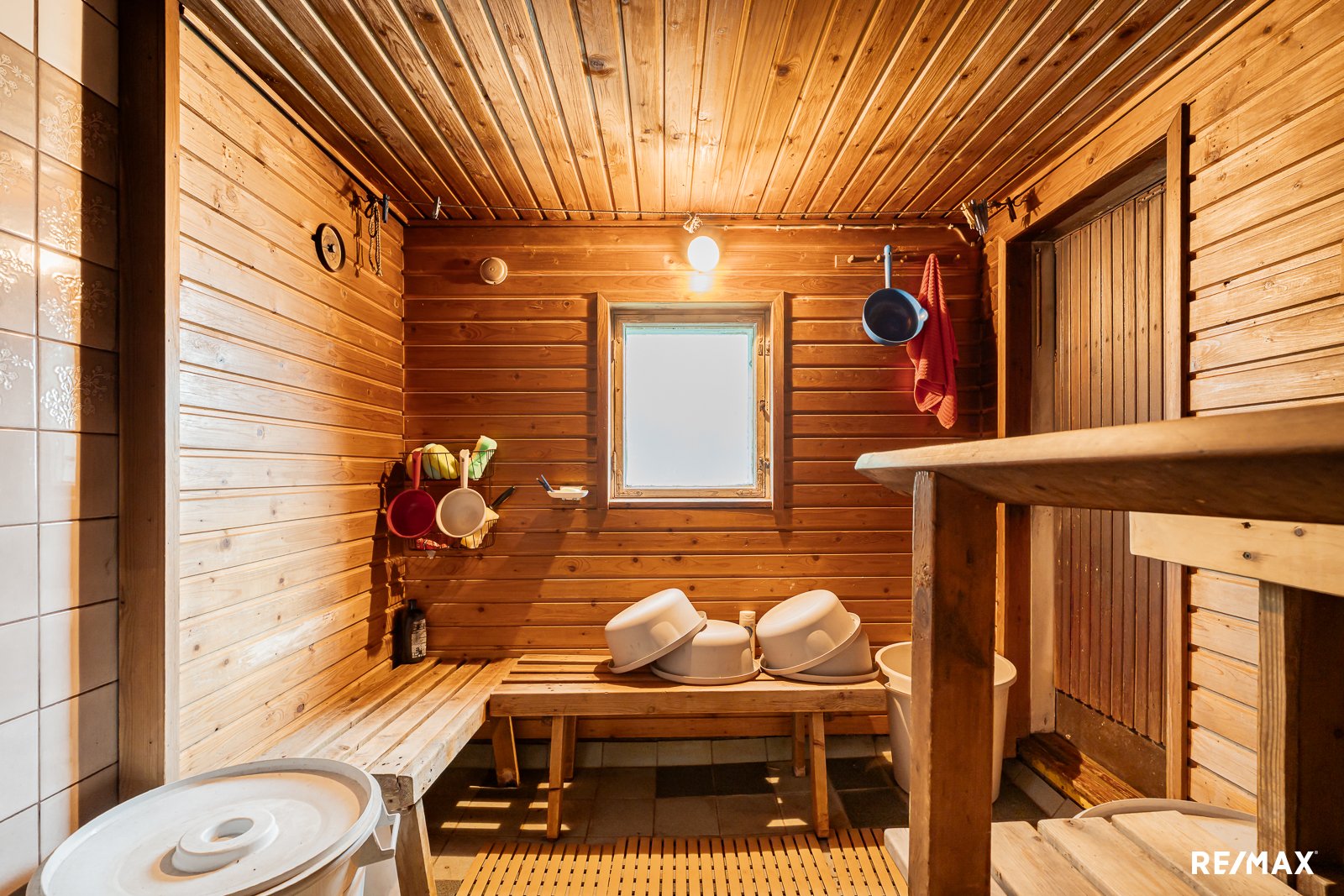 Yläkerrassa sijaitsee makuuhuone, jossa on tilaa rentoutua ja levätä. Pihapiirissä on myös perinteinen puulämmitteinen pihasauna, joka tarjoaa mahdollisuuden rentoutua kiireisen päivän jälkeen. Lisäksi kuisti ja erillinen ulkorakennus tuovat lisää säilytystilaa ja mahdollisuuksia.