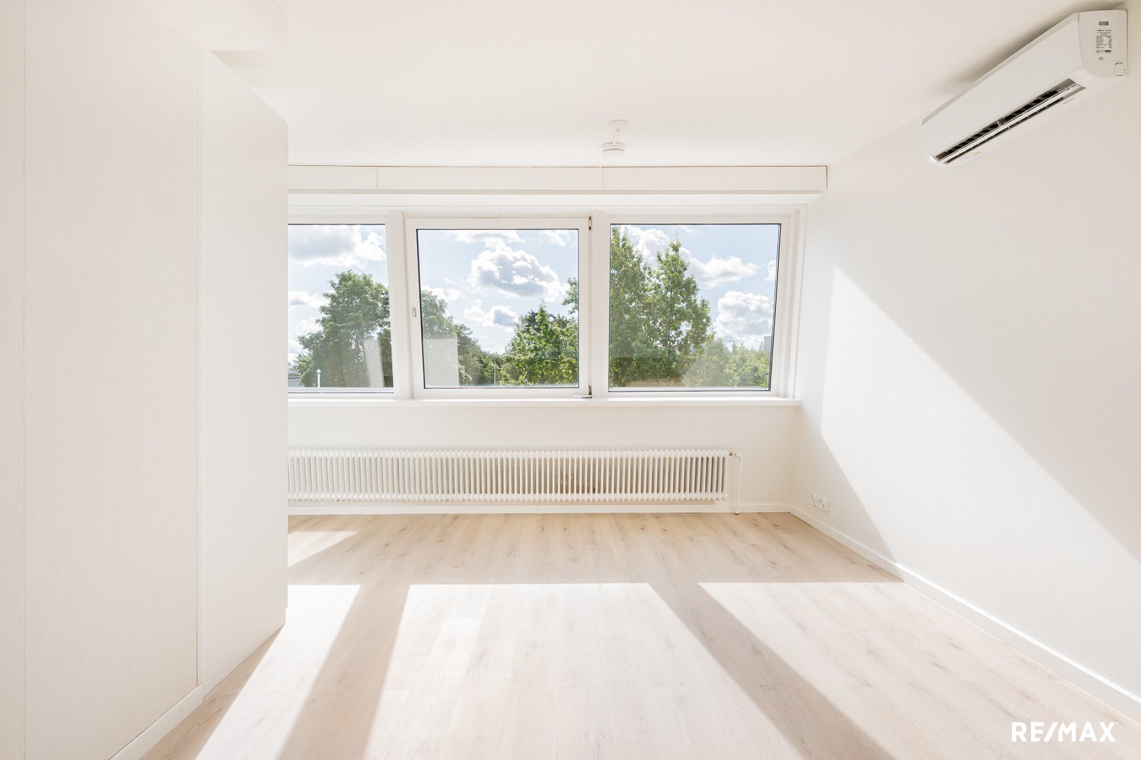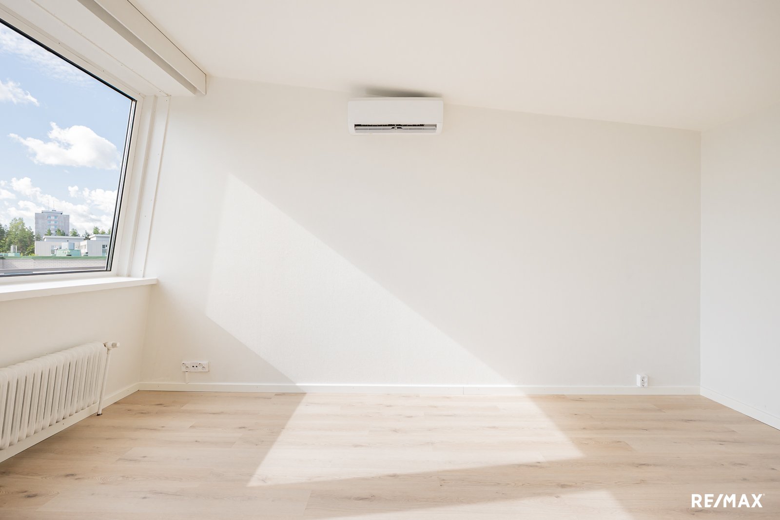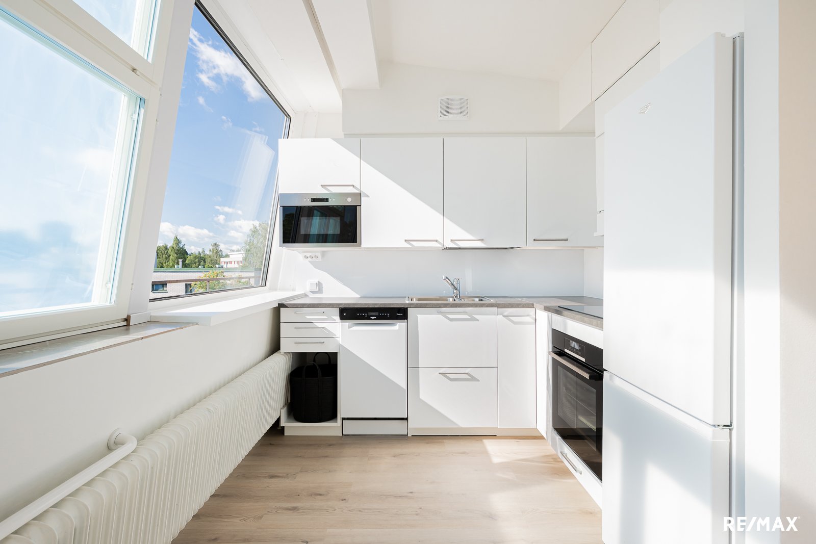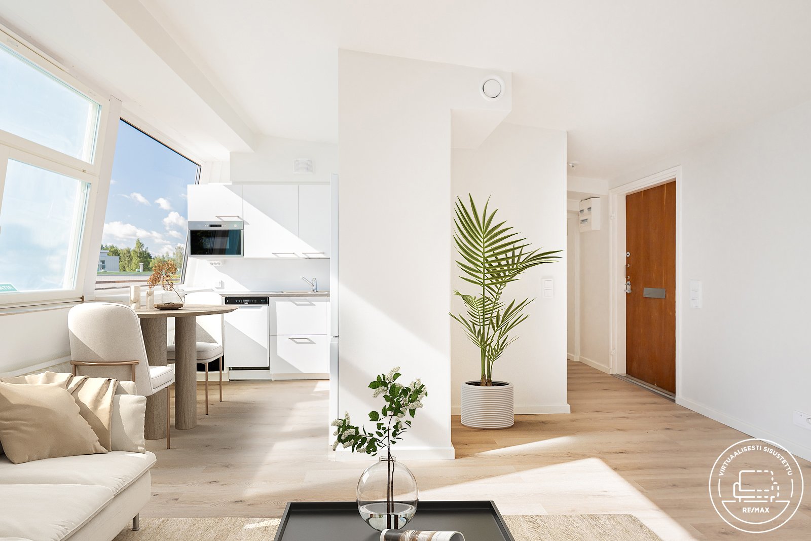 Keittiö ja olohuone löytyvät samasta tilasta ja tilava makuuhuone toiselta puolelta kotia. Molemmissa tiloissa on oma ilmalämpöpumppu viilennykseen. Huoneiston katto nousee kohti ikkunoita luoden upean kokonaisuuden ja ikkunatkin jäävät tyylikkäästä vinoon tuoden kauniisti luonnonvaloa asuntoon. Wc ja suihku ovat toimivasti omissa tiloissaan.