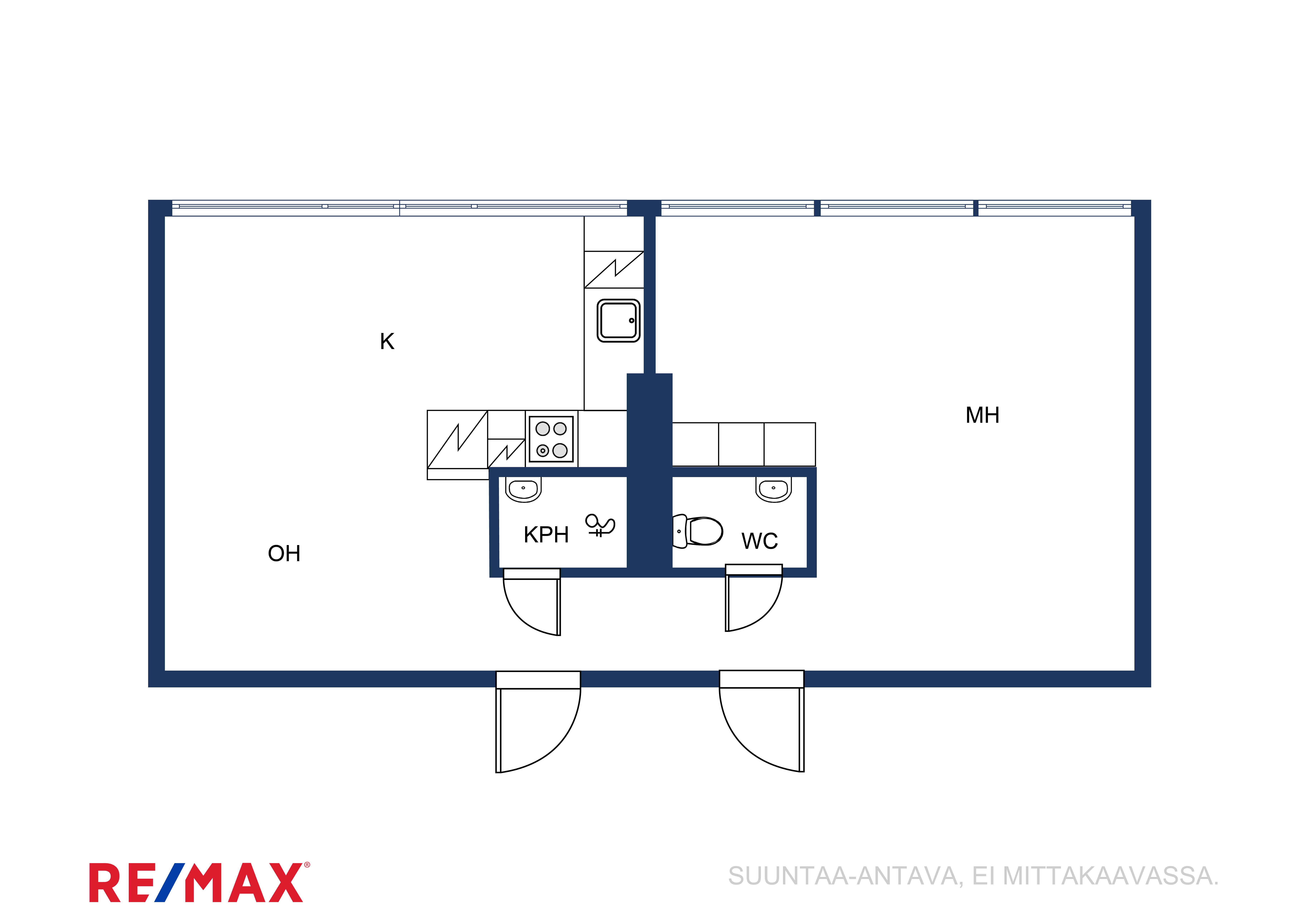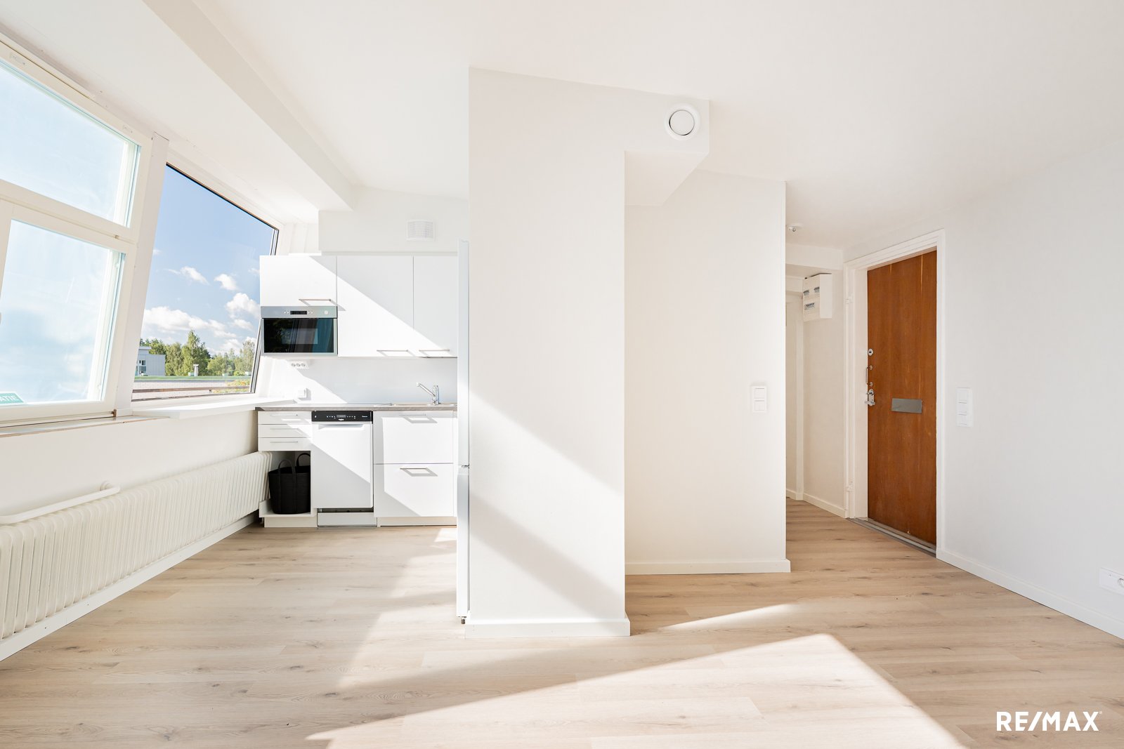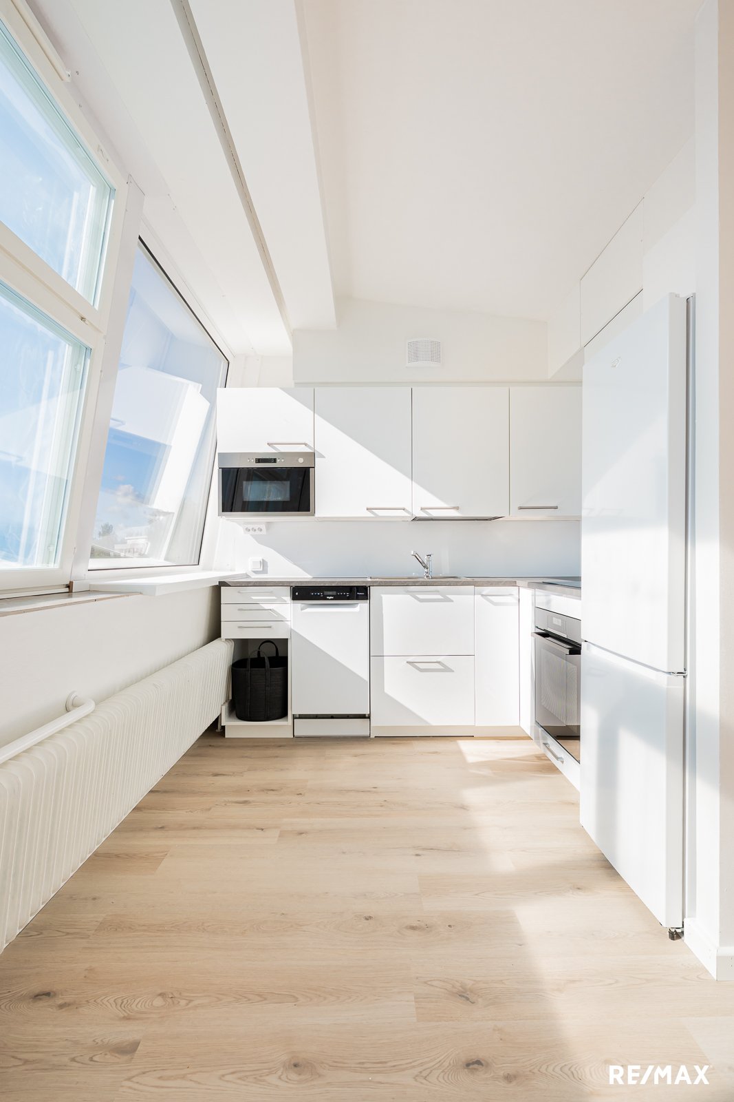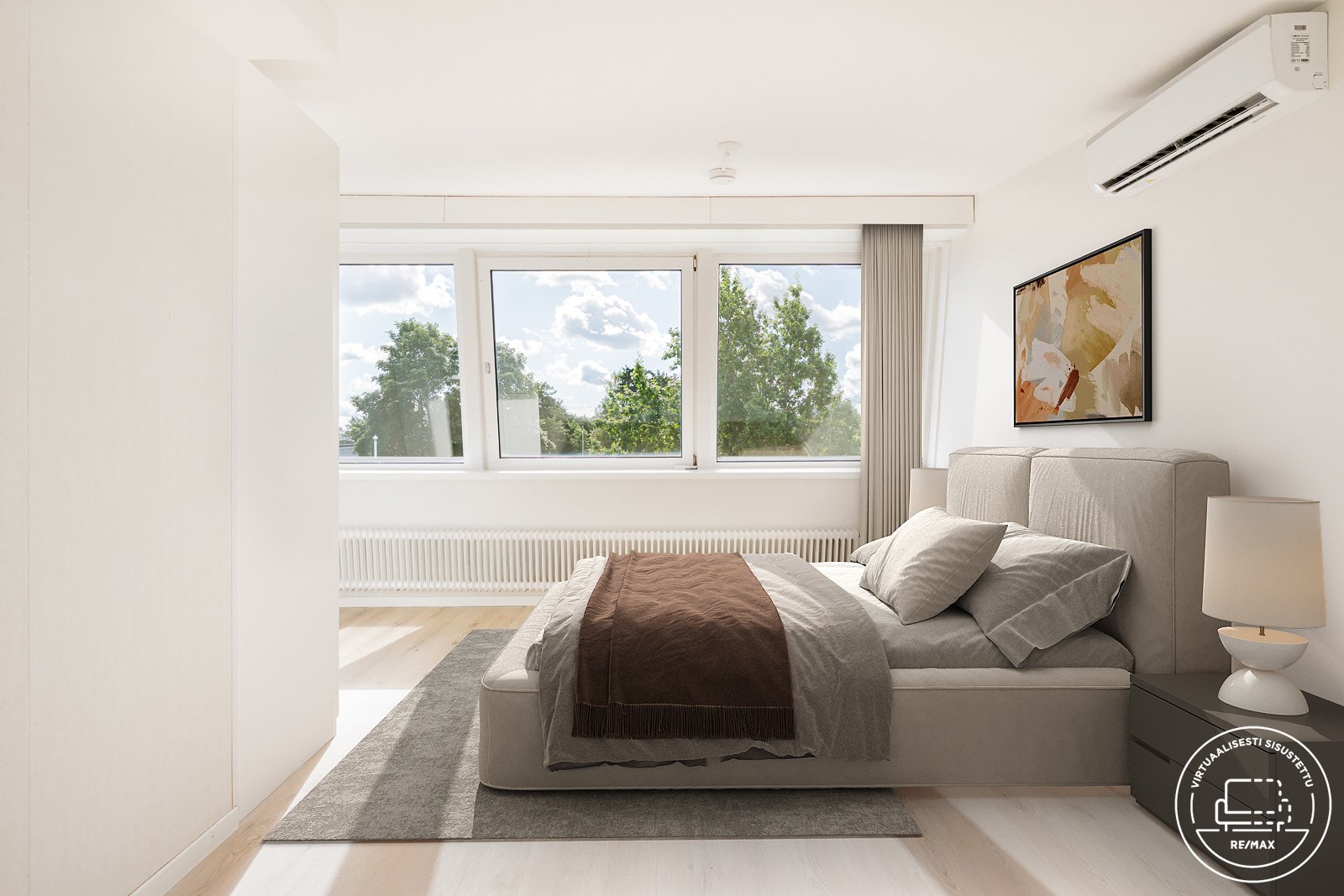 Keittiö ja olohuone löytyvät samasta tilasta ja tilava makuuhuone toiselta puolelta kotia. Molemmissa tiloissa on oma ilmalämpöpumppu viilennykseen. Huoneiston katto nousee kohti ikkunoita luoden upean kokonaisuuden ja ikkunatkin jäävät tyylikkäästä vinoon tuoden kauniisti luonnonvaloa asuntoon. Wc ja suihku ovat toimivasti omissa tiloissaan.