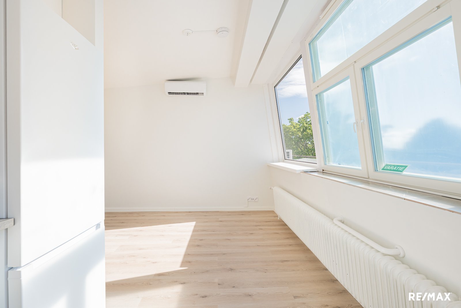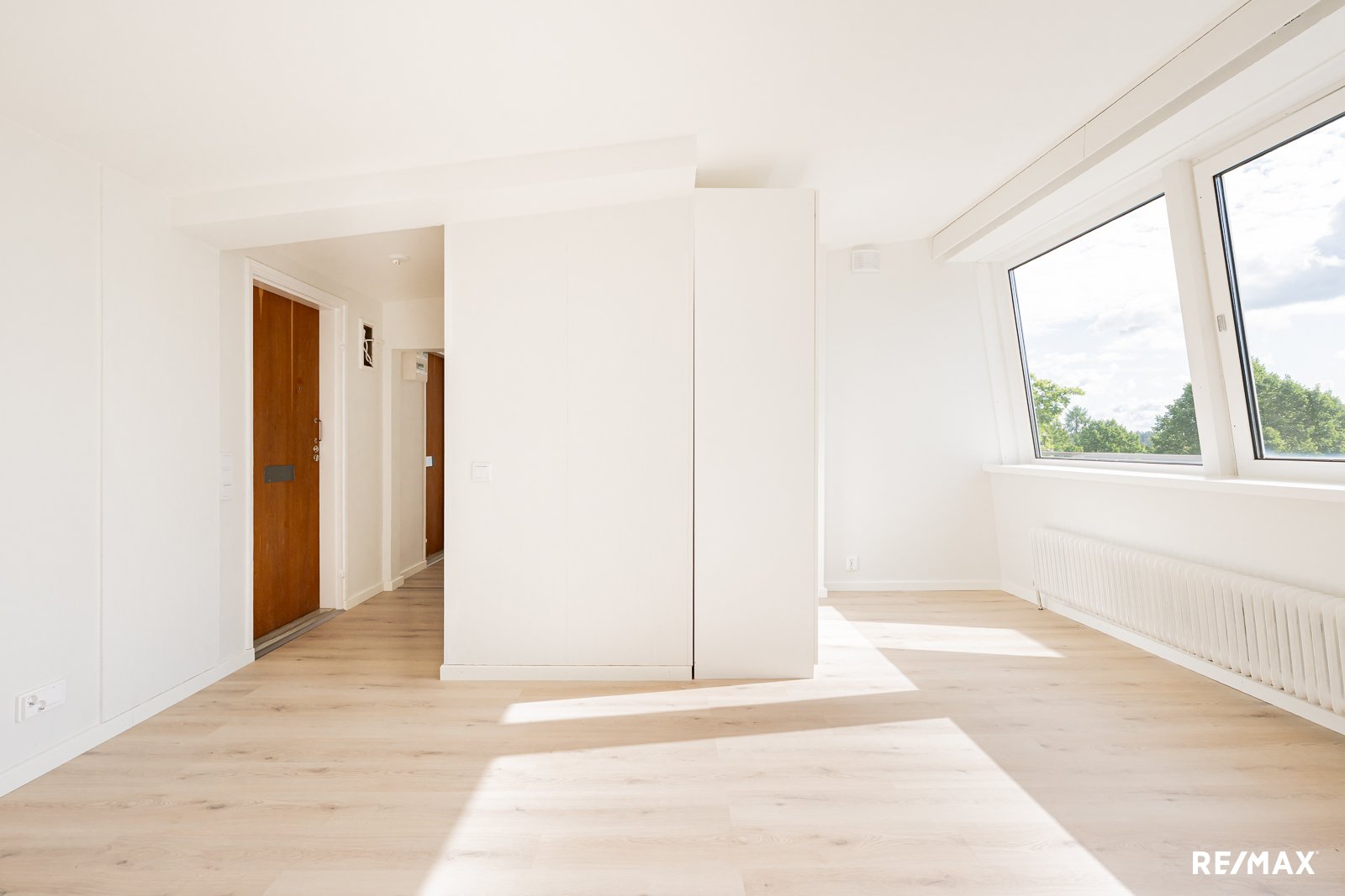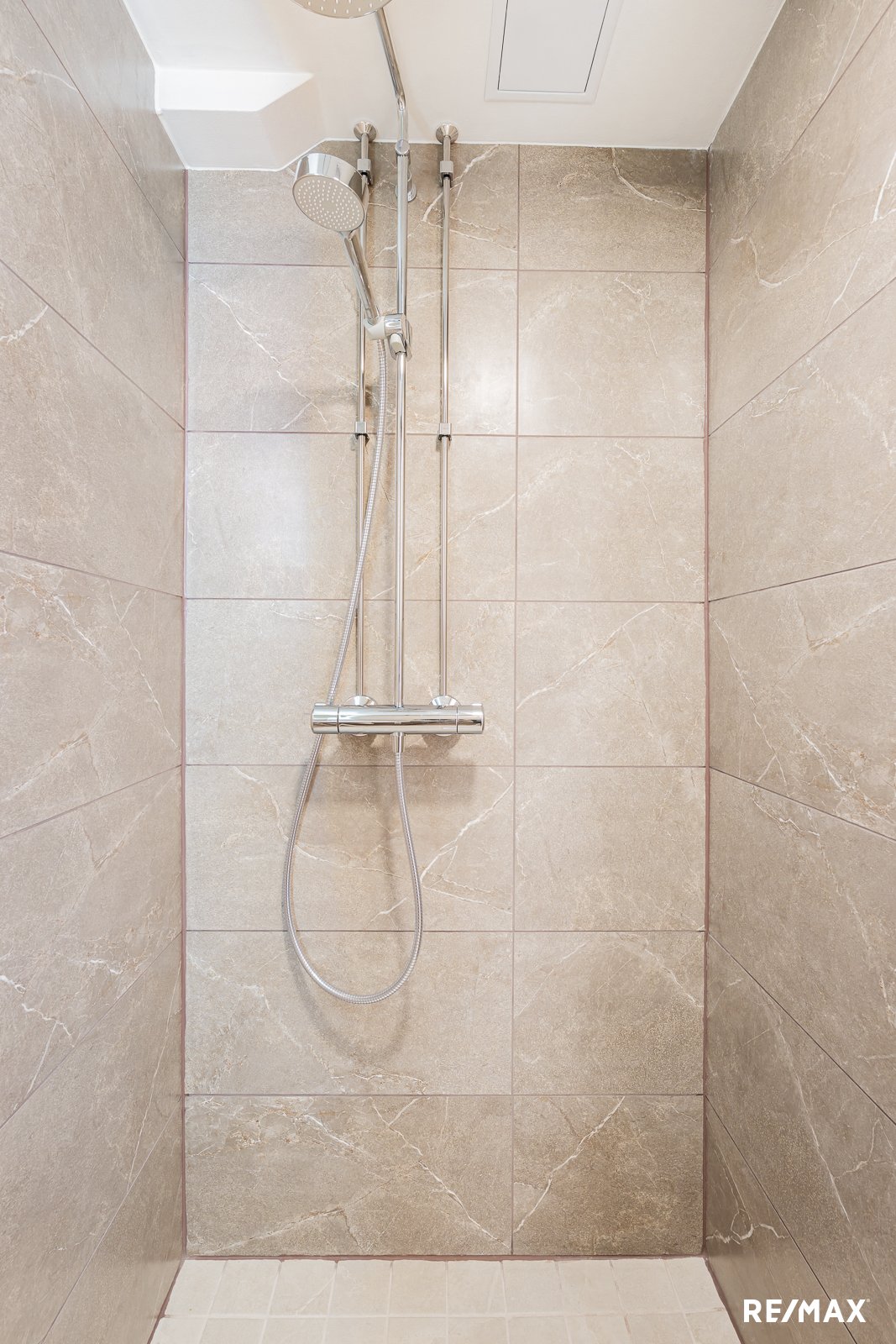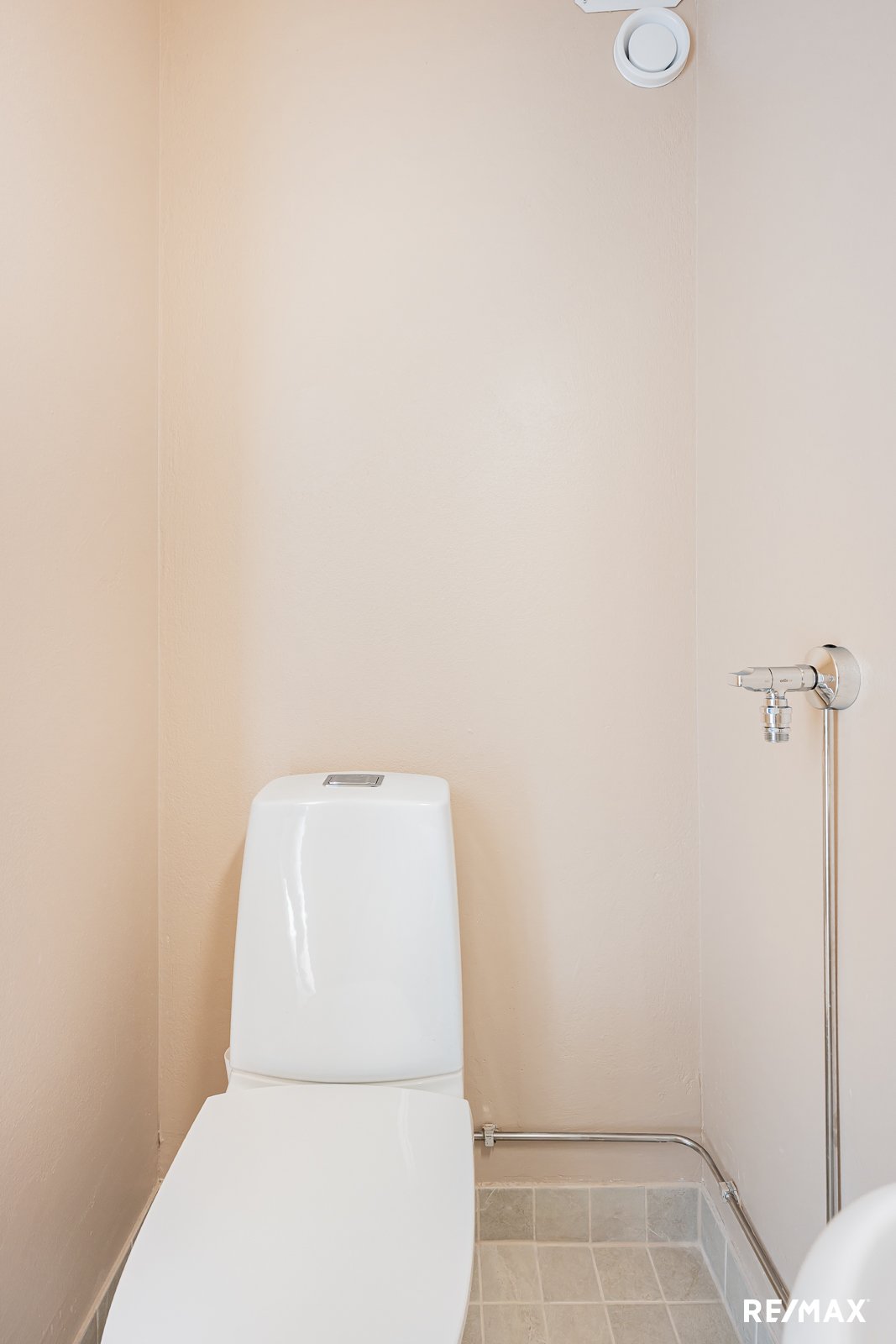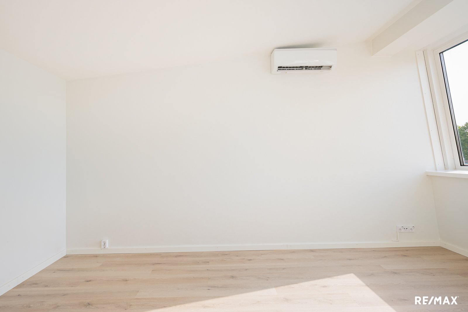 Keittiö ja olohuone löytyvät samasta tilasta ja tilava makuuhuone toiselta puolelta kotia. Molemmissa tiloissa on oma ilmalämpöpumppu viilennykseen. Huoneiston katto nousee kohti ikkunoita luoden upean kokonaisuuden ja ikkunatkin jäävät tyylikkäästä vinoon tuoden kauniisti luonnonvaloa asuntoon. Wc ja suihku ovat toimivasti omissa tiloissaan.