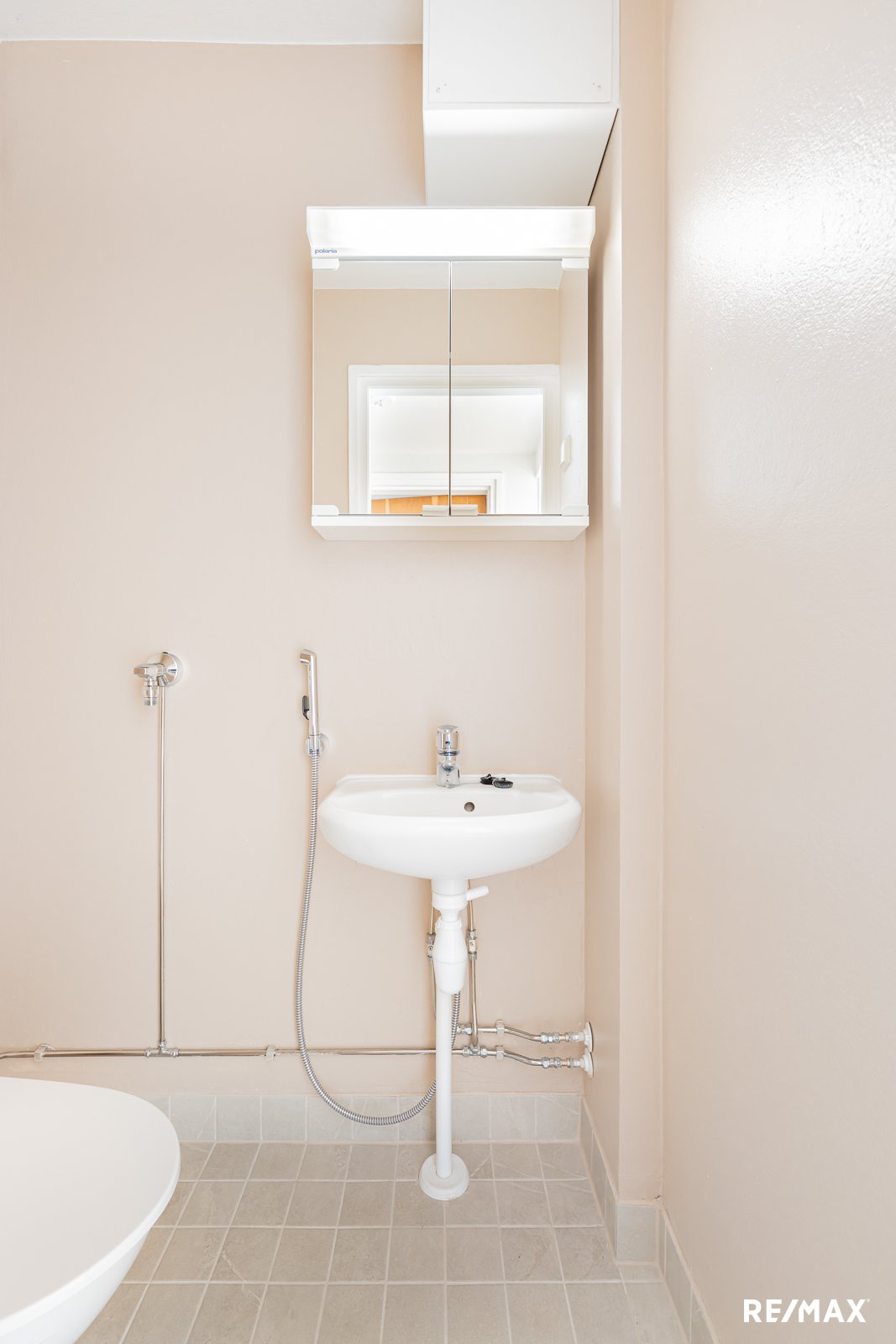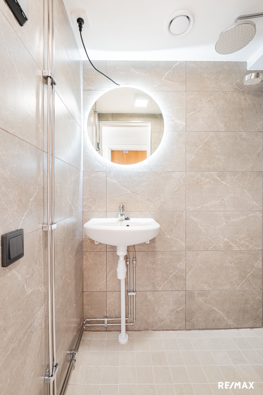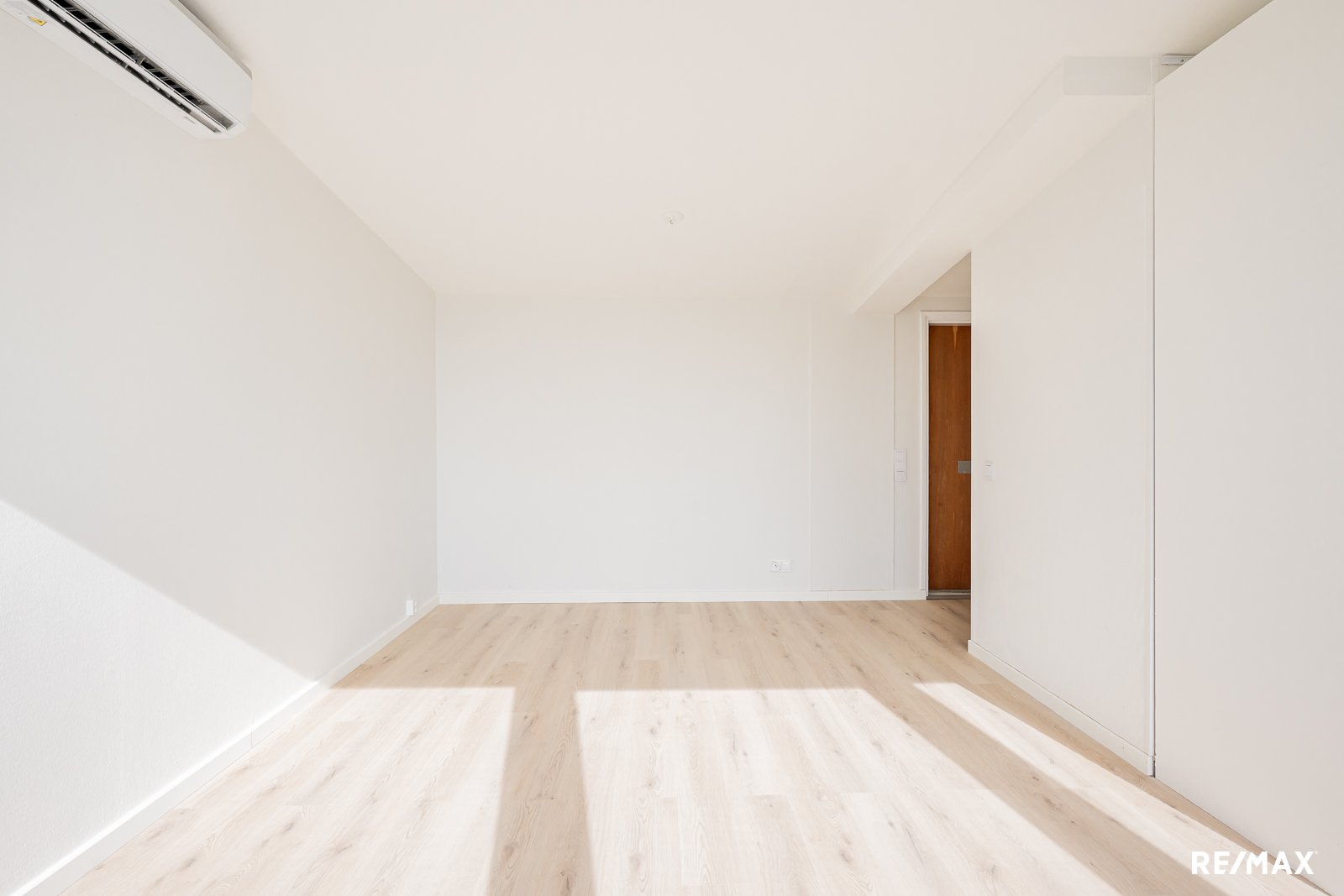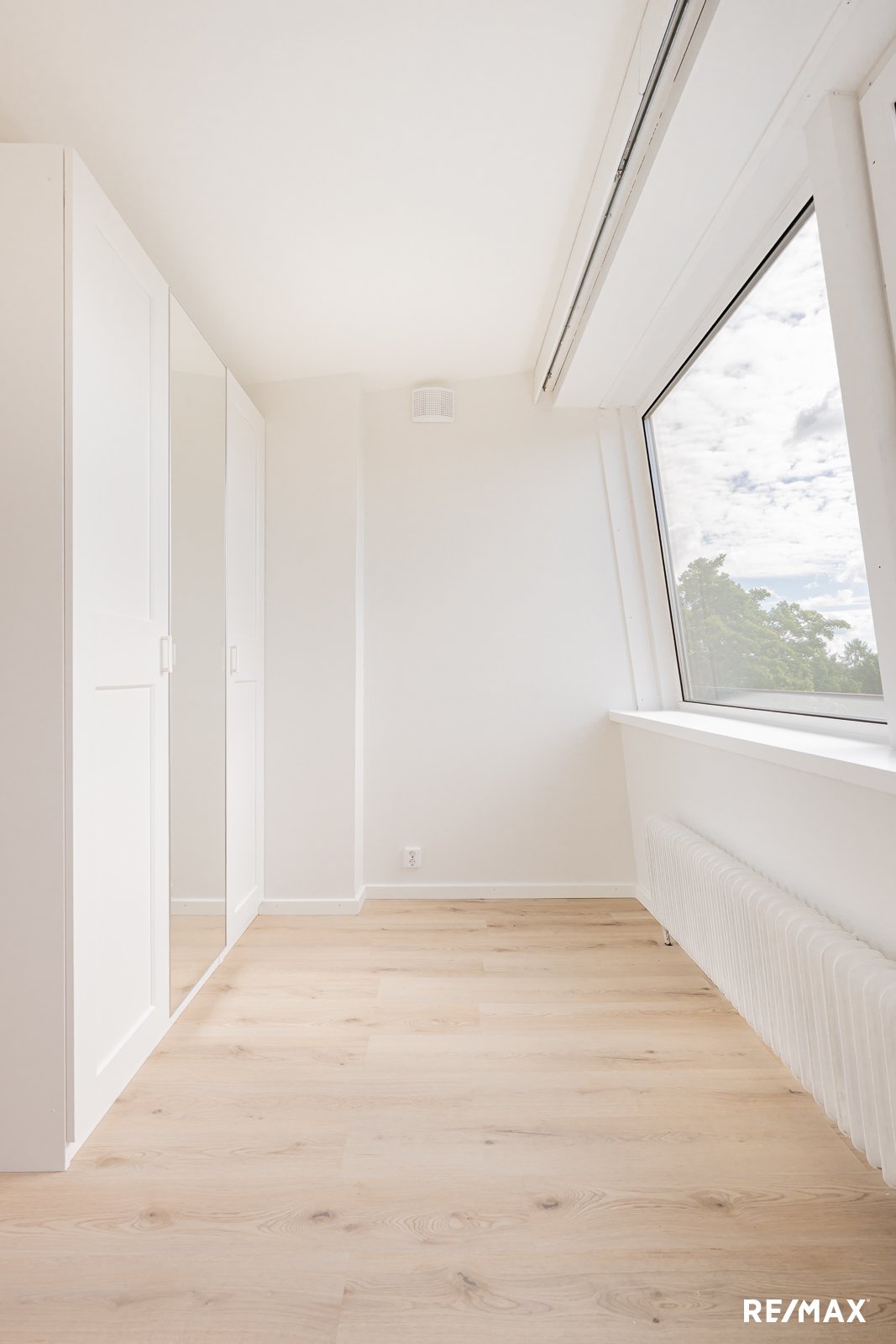 Keittiö ja olohuone löytyvät samasta tilasta ja tilava makuuhuone toiselta puolelta kotia. Molemmissa tiloissa on oma ilmalämpöpumppu viilennykseen. Huoneiston katto nousee kohti ikkunoita luoden upean kokonaisuuden ja ikkunatkin jäävät tyylikkäästä vinoon tuoden kauniisti luonnonvaloa asuntoon. Wc ja suihku ovat toimivasti omissa tiloissaan.