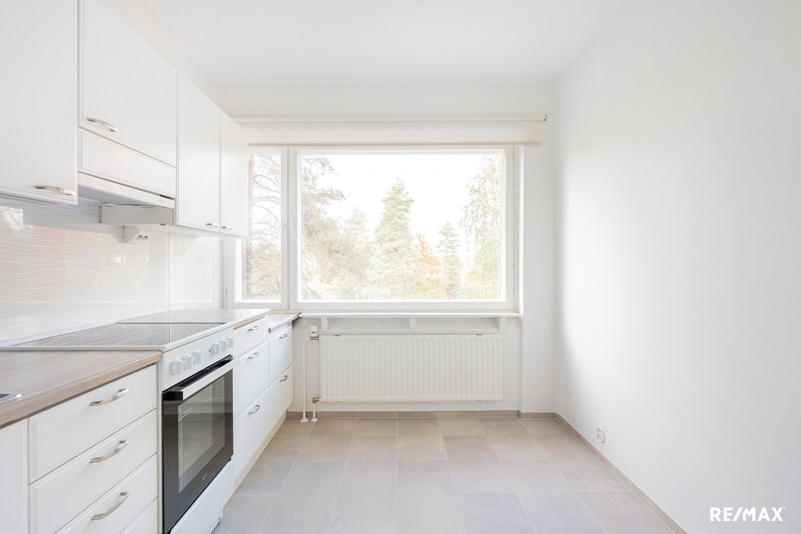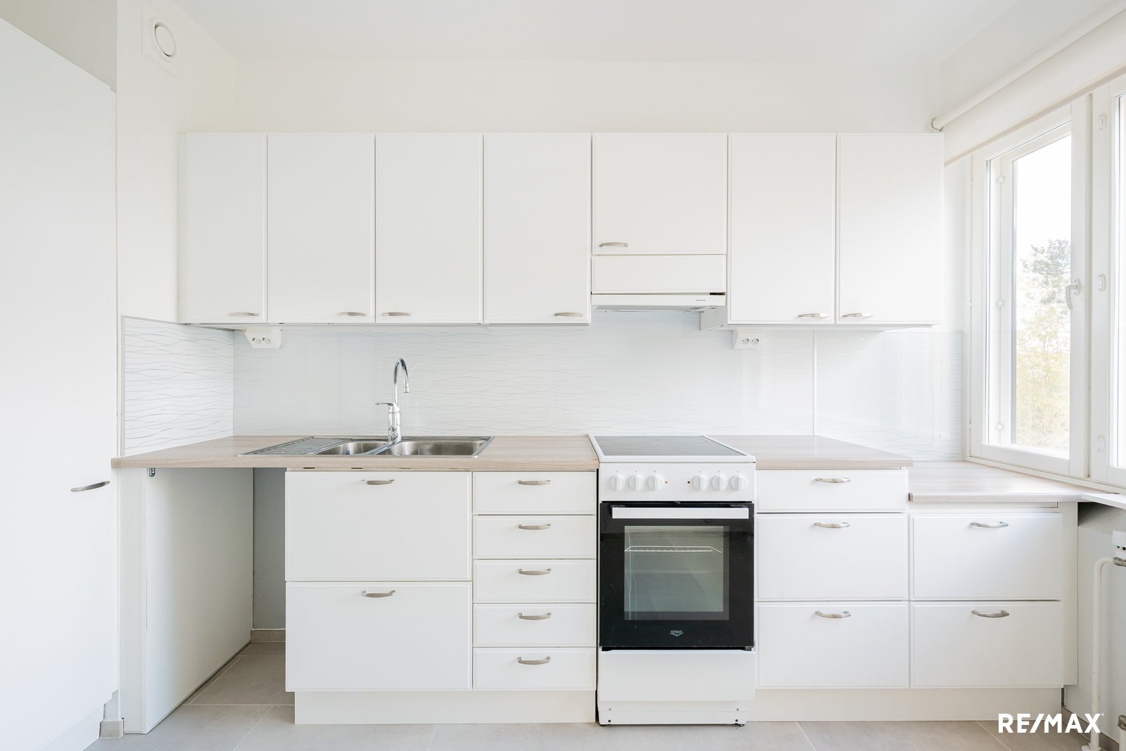 Keittiössä on kaikki tarvittavat varusteet, siistit pinnat ja tila on valoisa. Asunnon parveke tarjoaa mukavan paikan nauttia ulkoilmasta.
