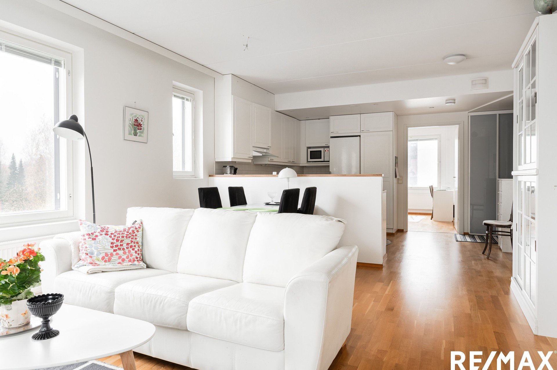 Tupakeittiö on jaettu tyylikkäällä puoliseinällä. Olohuoneen perältä pääsy suojaisalle, lasitetulle parvekkeelle. Suuret ikkunat tuovat tilaan valoa ja avaruutta.