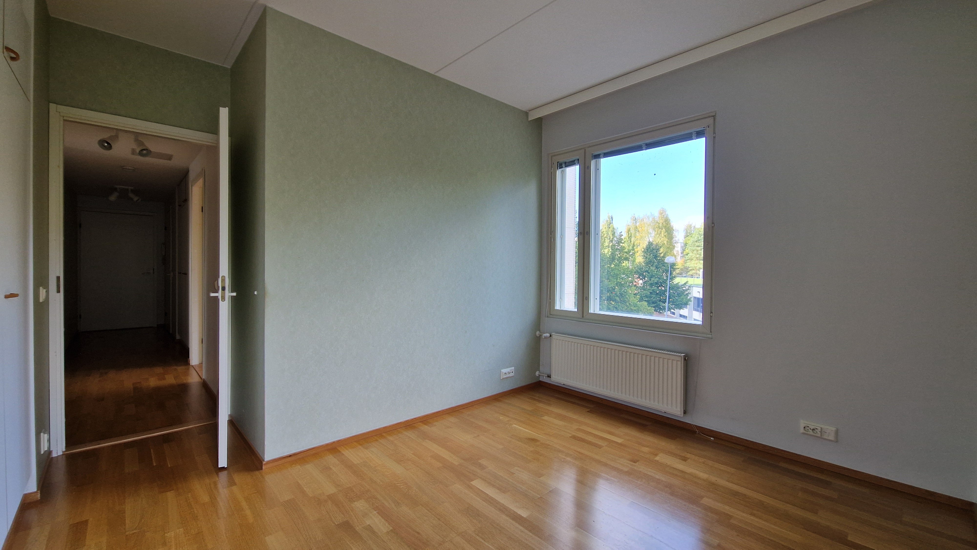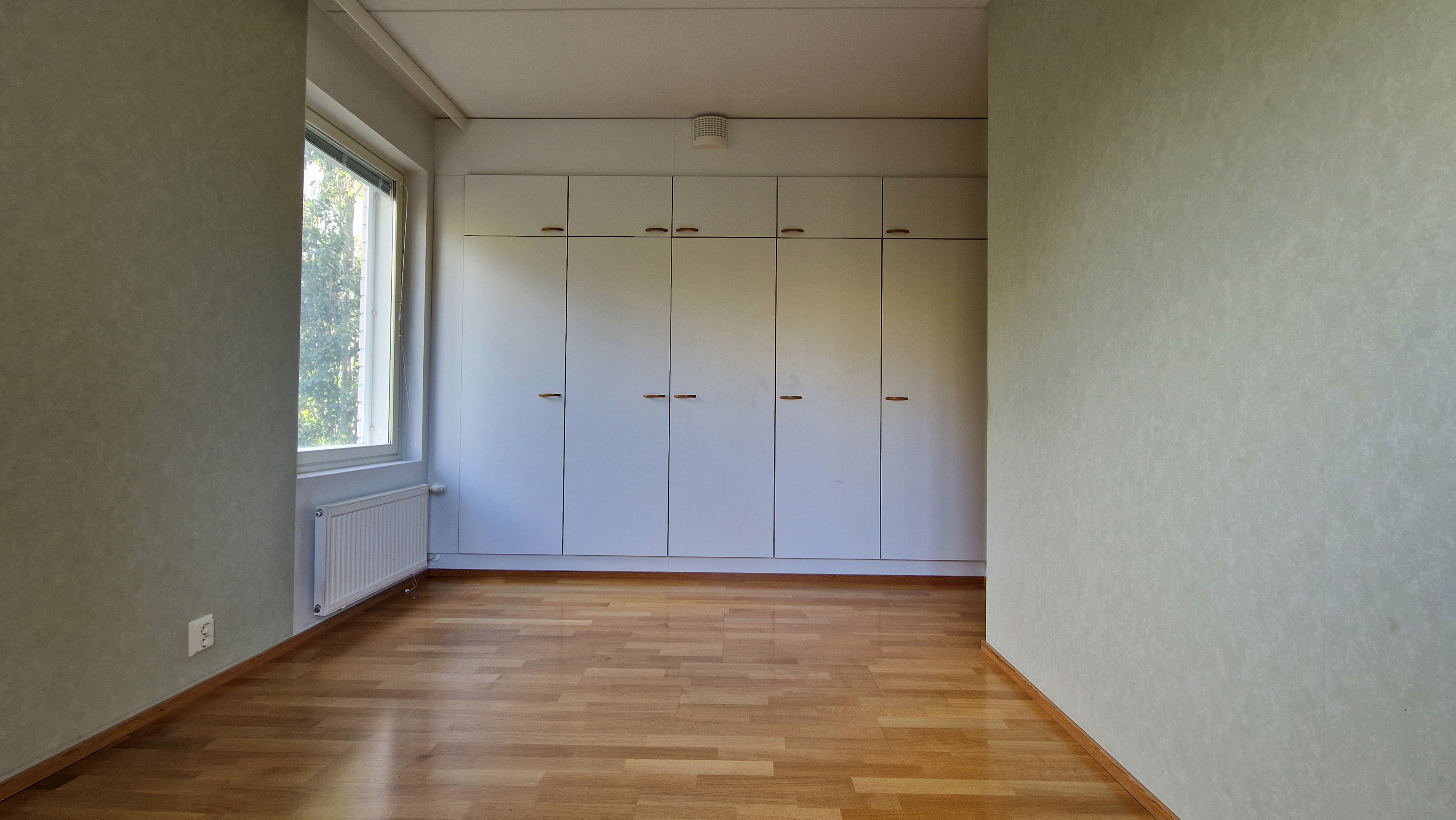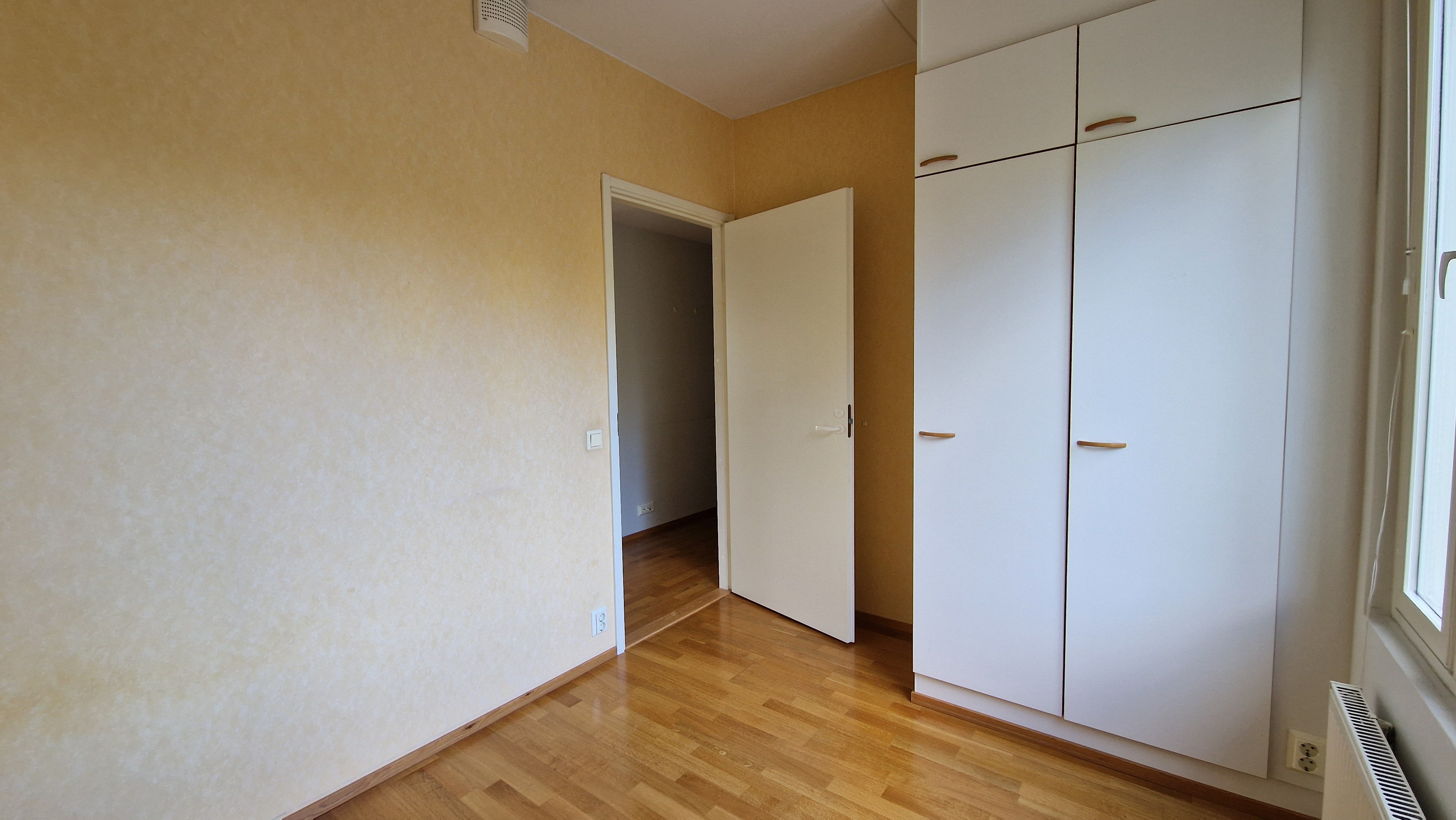 Makuuhuoneissa on parkettilattiat ja kiinteät kaapistot, mikä tekee säilytyksestä helppoa. Pienempi makuuhuone palvelee loistavasti myös työhuoneena.