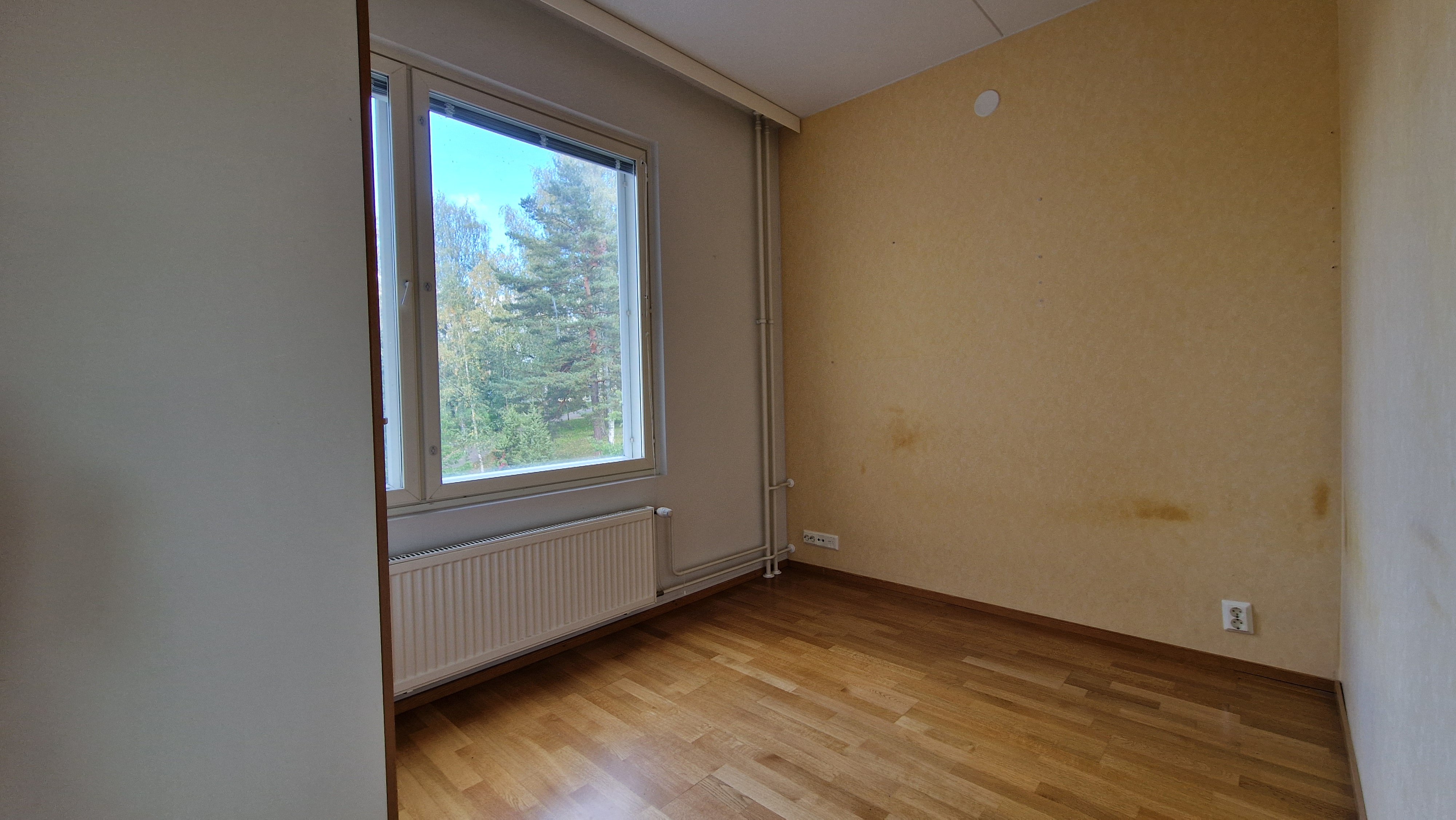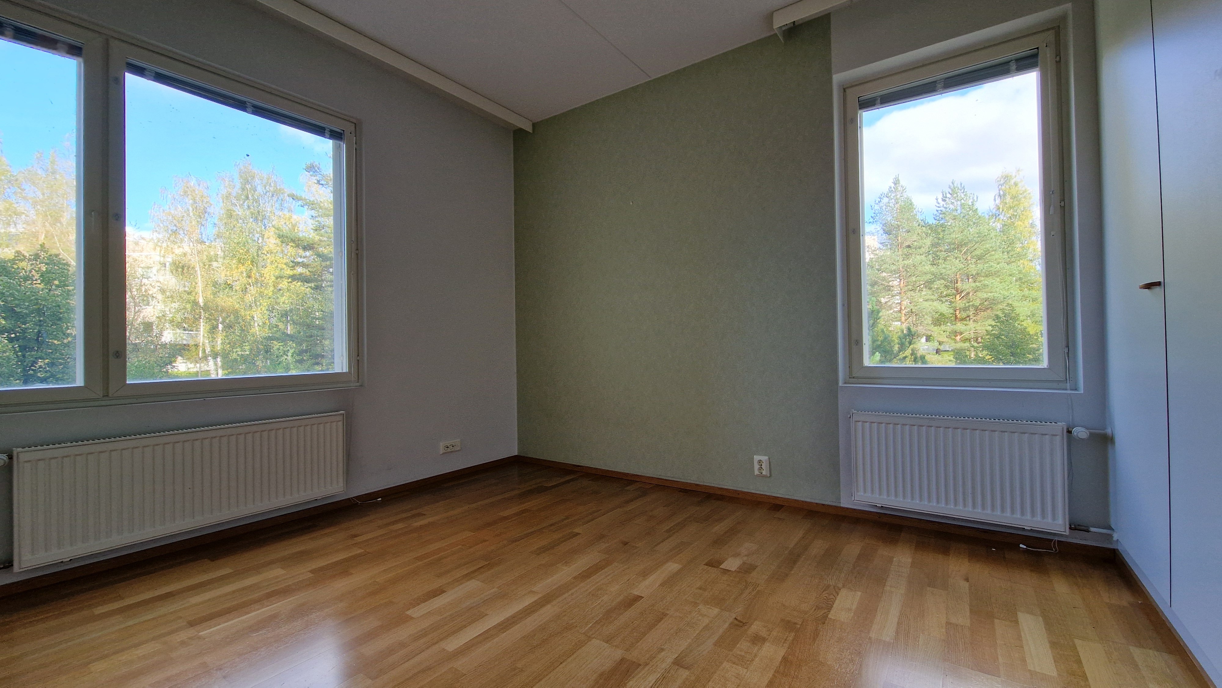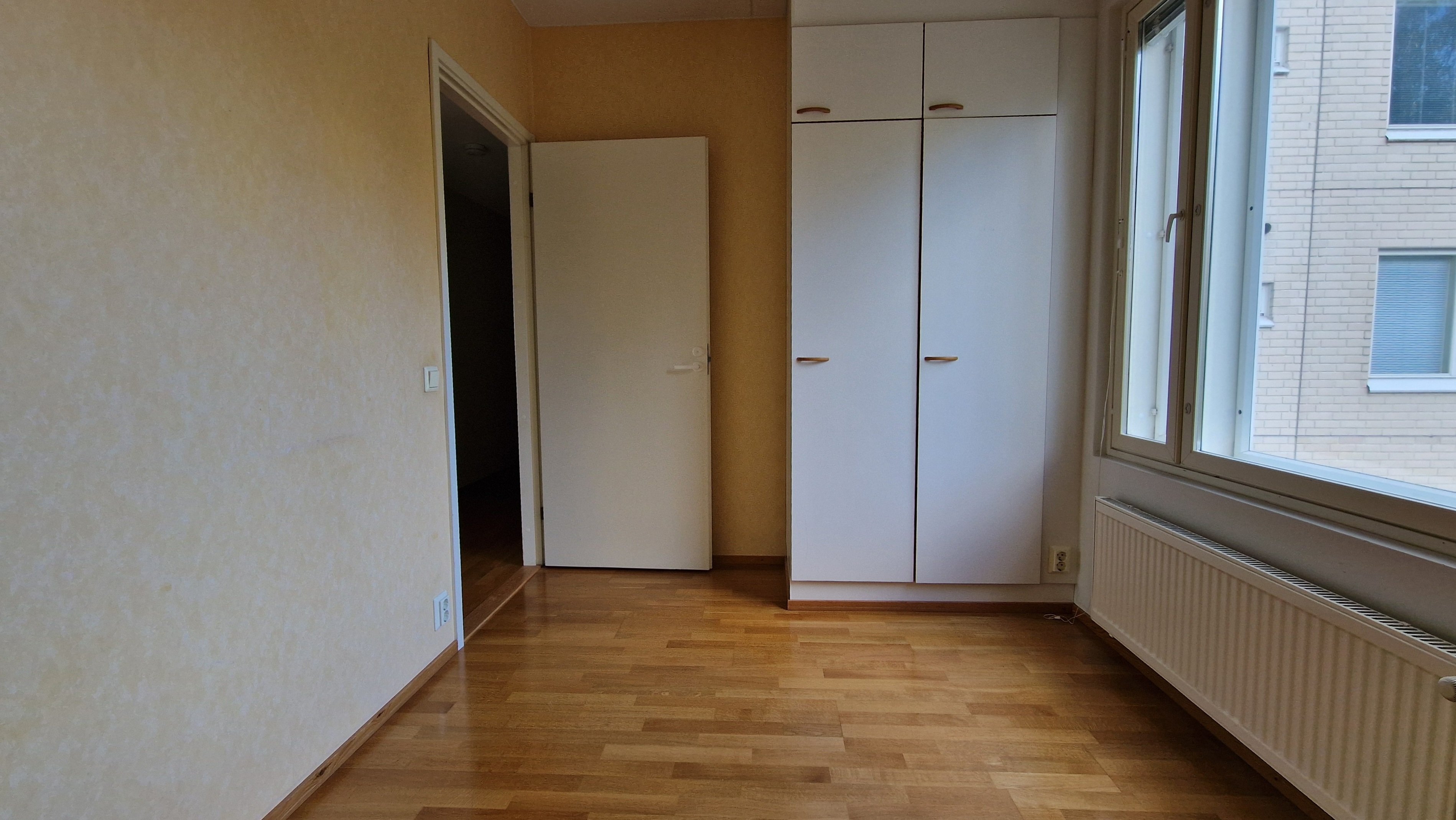 Makuuhuoneissa on parkettilattiat ja kiinteät kaapistot, mikä tekee säilytyksestä helppoa. Pienempi makuuhuone palvelee loistavasti myös työhuoneena.