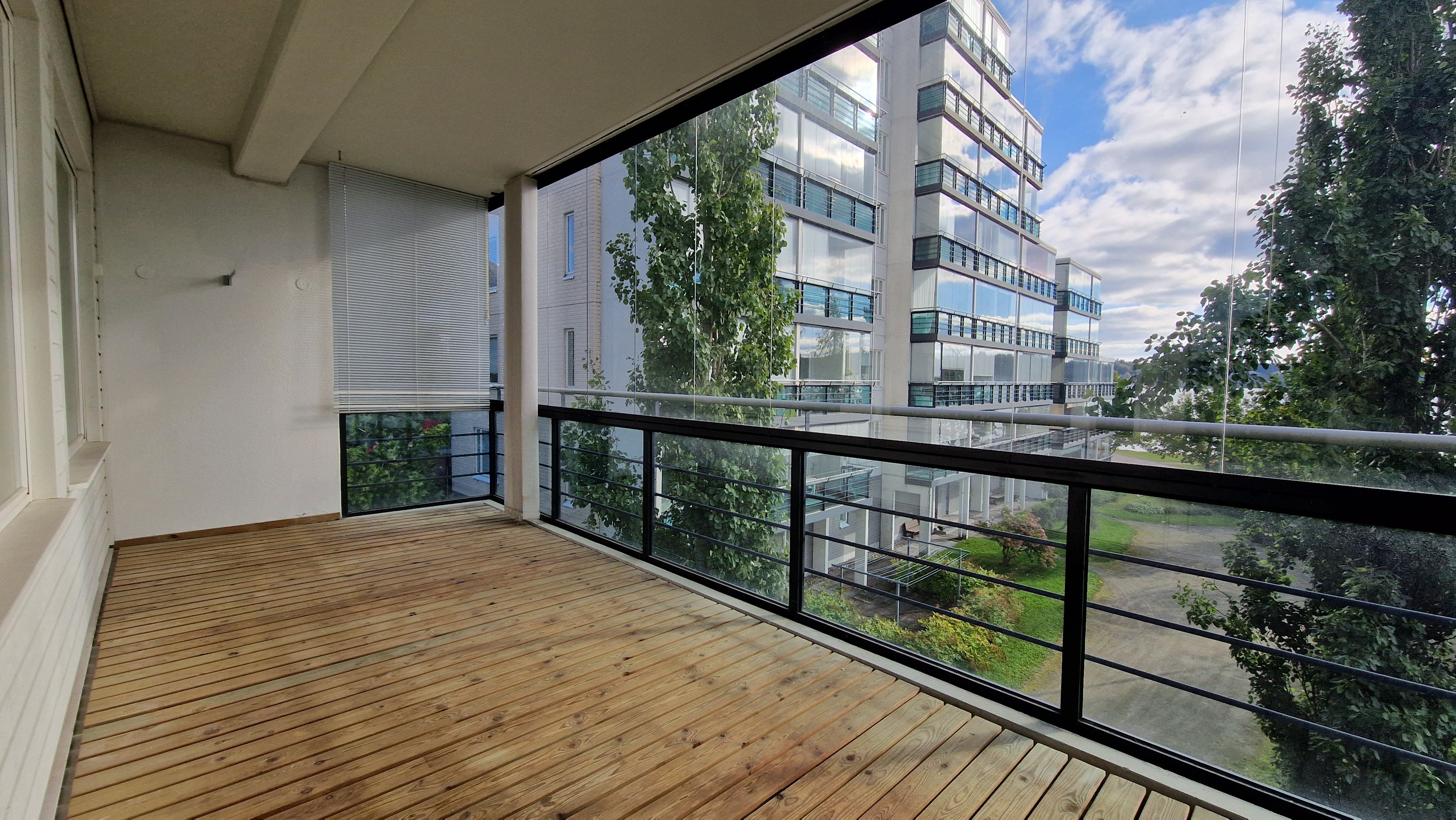 Parveke on poikkeuksellisen suuri, joten sinne saa sisustettua loistavan oleskelutilan. Parvekkeella on myös kaihtimet, jolla voit säädellä tilan lämpötilaa.