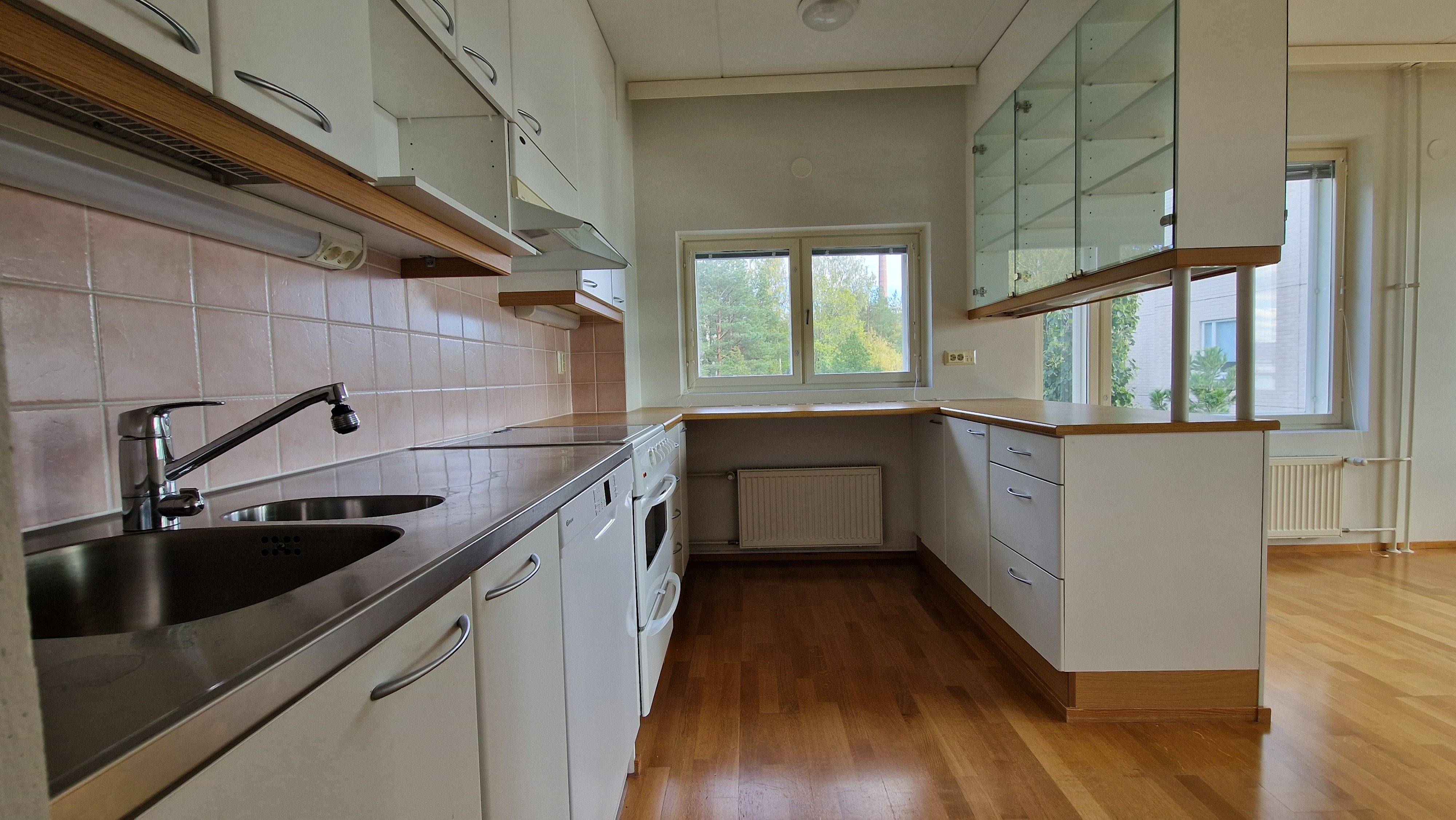 Keittiö on hyvin suunniteltu ja varustettu käytännöllisillä kodinkoneilla. Arkea helpottavat täysikokoinen jääkaappi sekä pakastin.