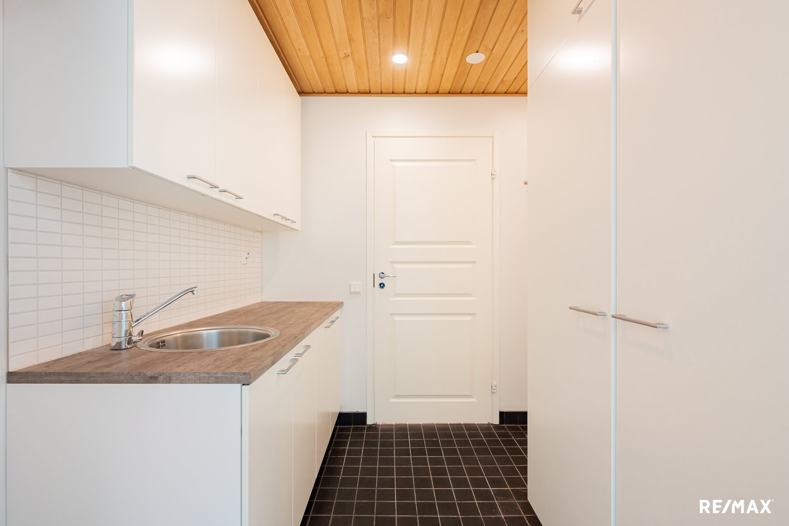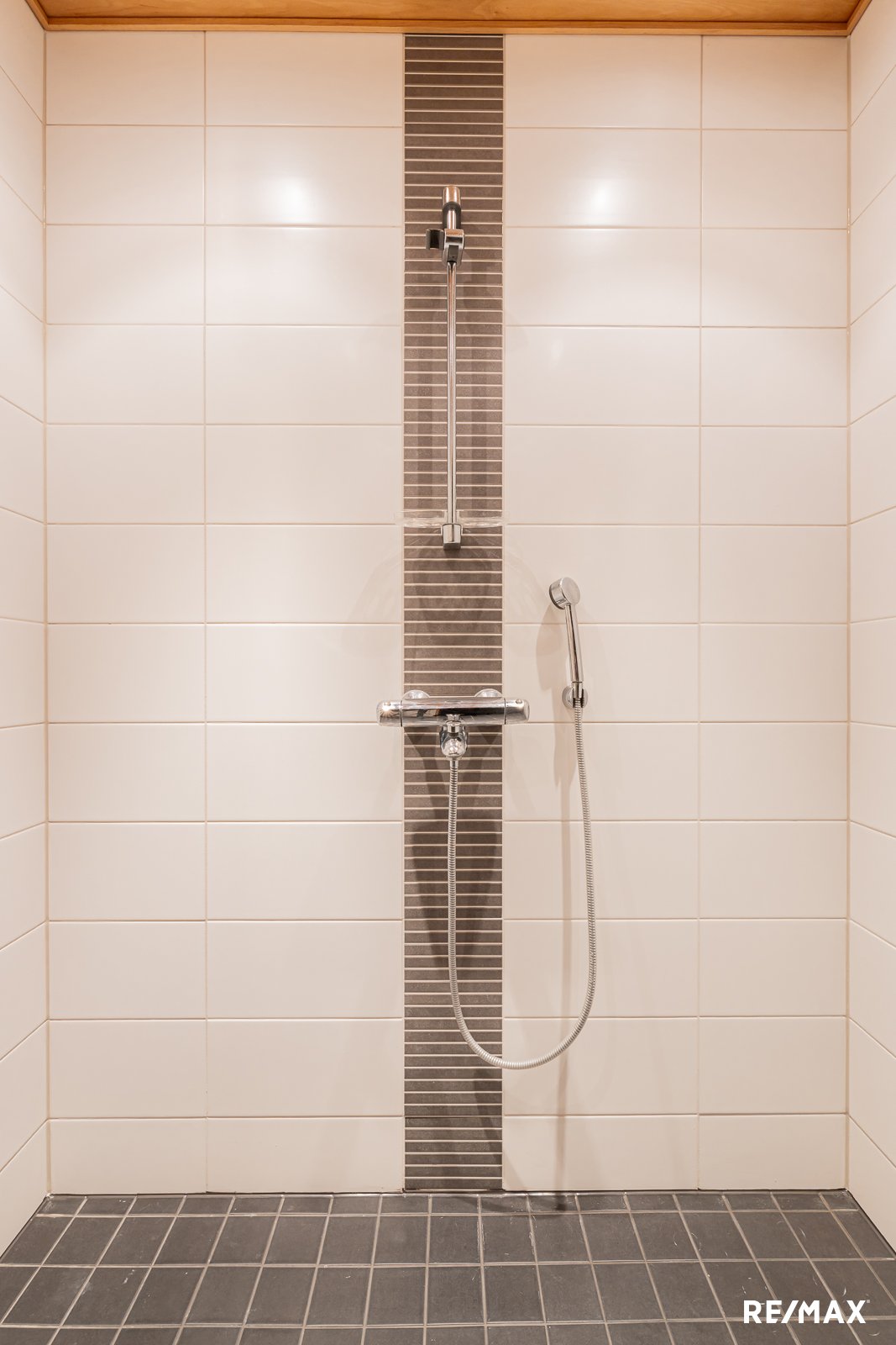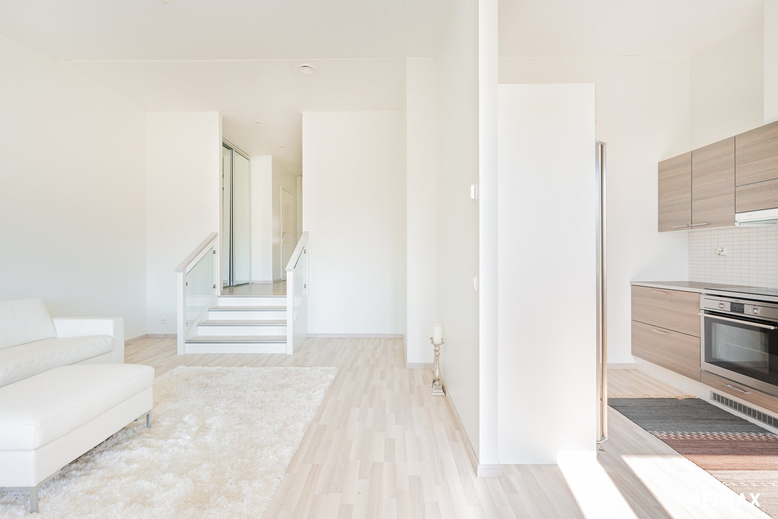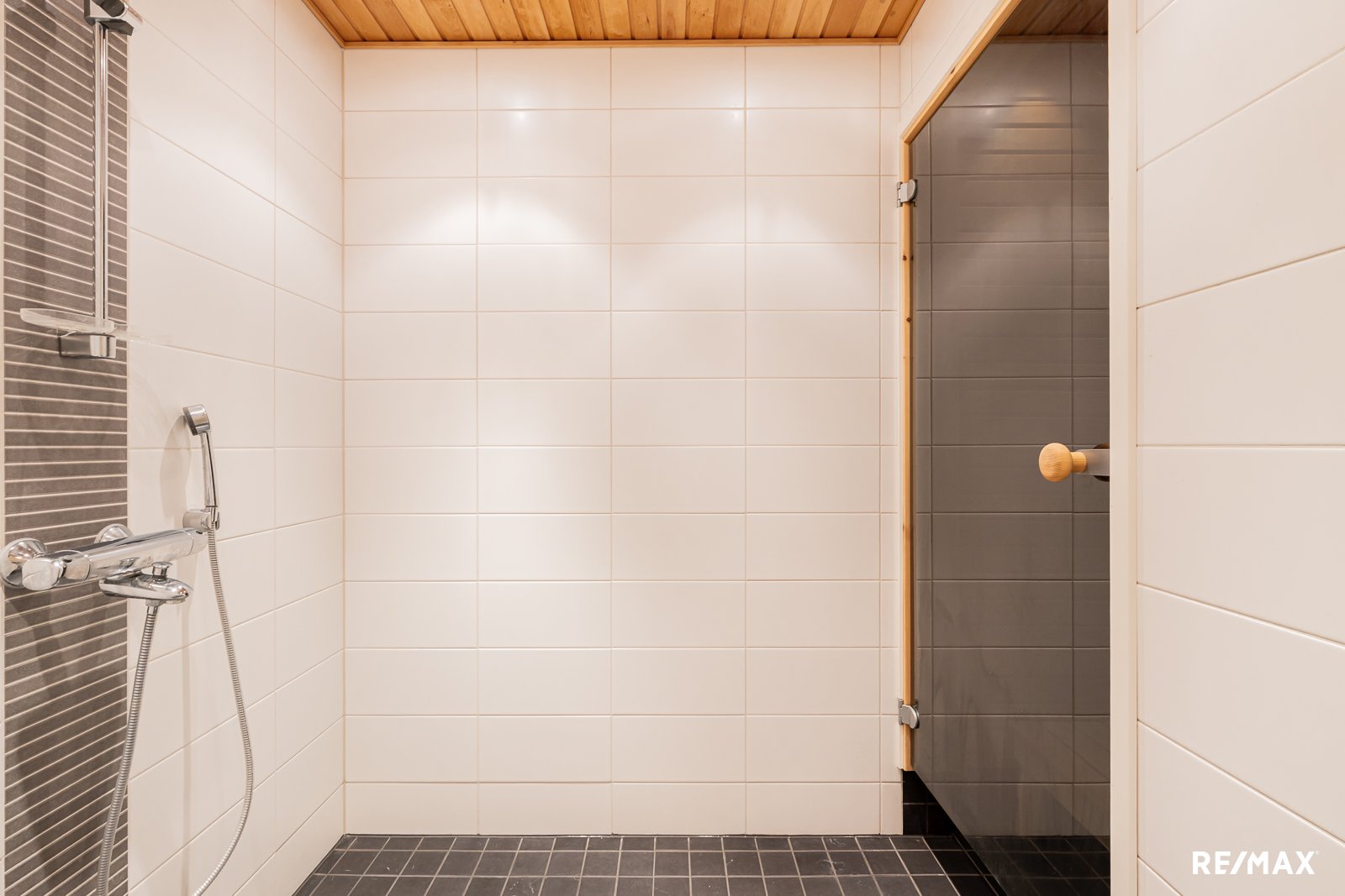 Tämä koti omaa erinomaisen pohjaratkaisun ja tarjoilee mukavaa asumista uudelle omistajalleen. Sisään tullessasi saavut tilavaan ja valoisaan eteiseen josta aukeavat ensin makuuhuone, erillinen wc, kodinhoitohuone jossa toinen wc-istuin sekä sen takana kph- ja saunatilat. Muutama porras erottaa eteisen ja erittäin tilavan olohuoneen, jonka huonekorkeus tekee tilasta ylvään. Olohuone on kauniisti yhtenäistä tilaa avautuvan keittiön kanssa luoden tilasta upean harmonisen kokonaisuuden. Olohuoneesta kulku omalle suojaisalle katetulle terassille.