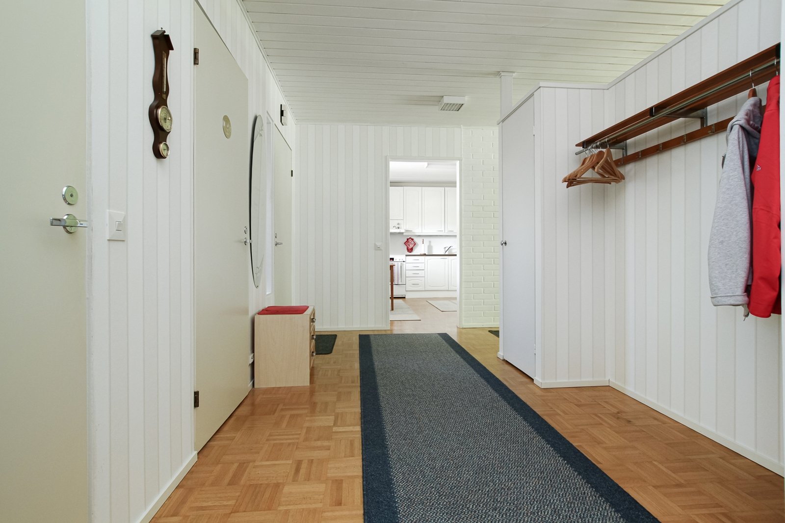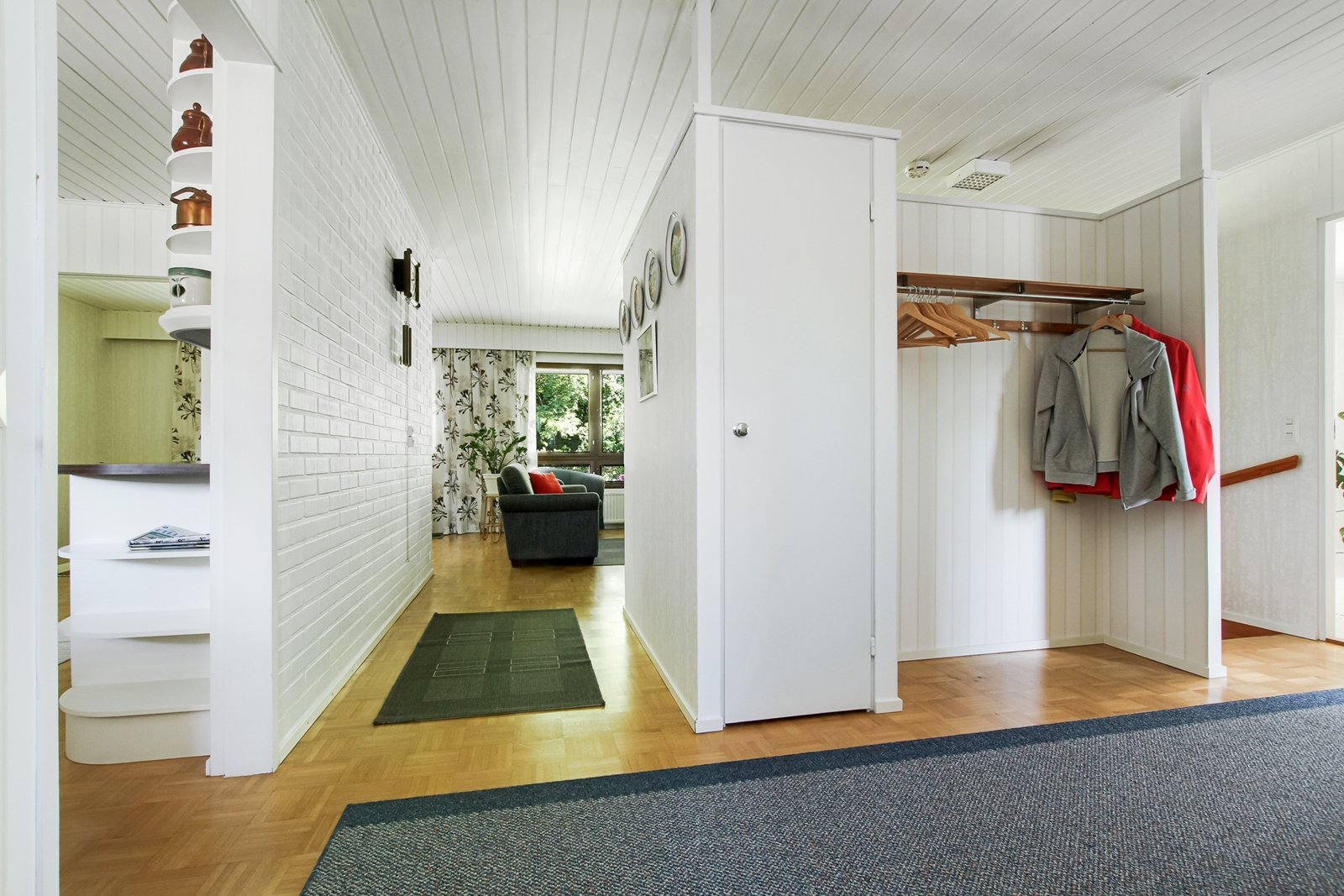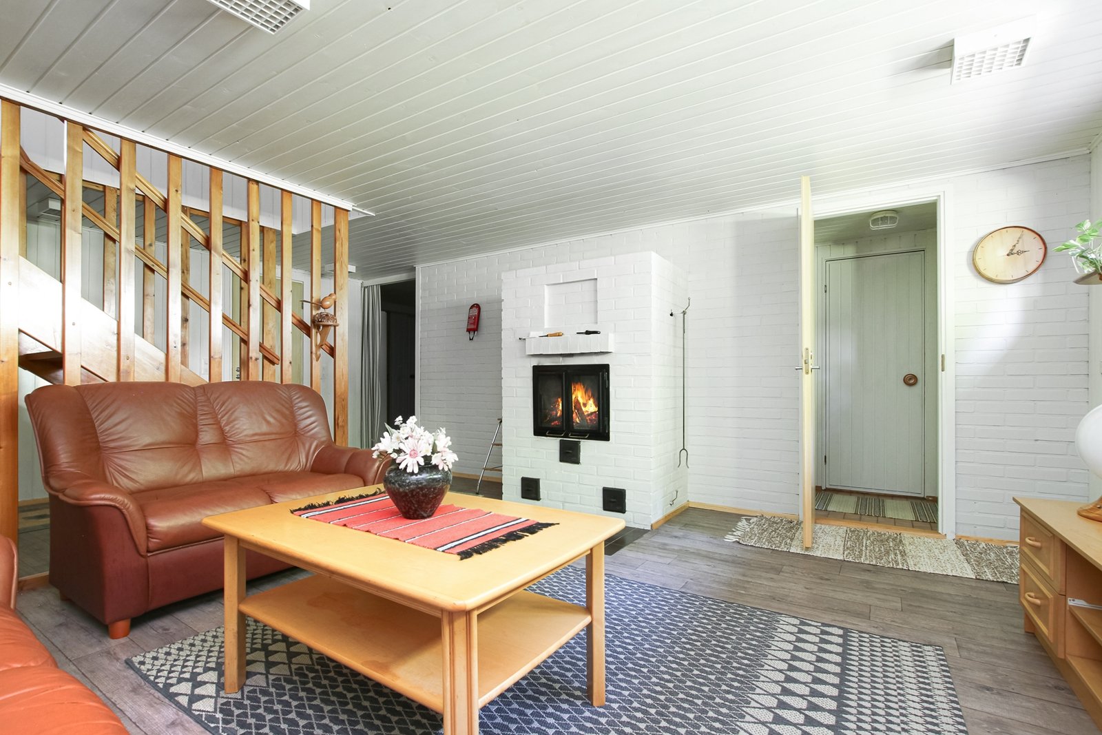 Katutason kerroksesta löytyy olohuoneen, keittiö ja ruokailutilan lisäksi kolme makuuhuonetta.