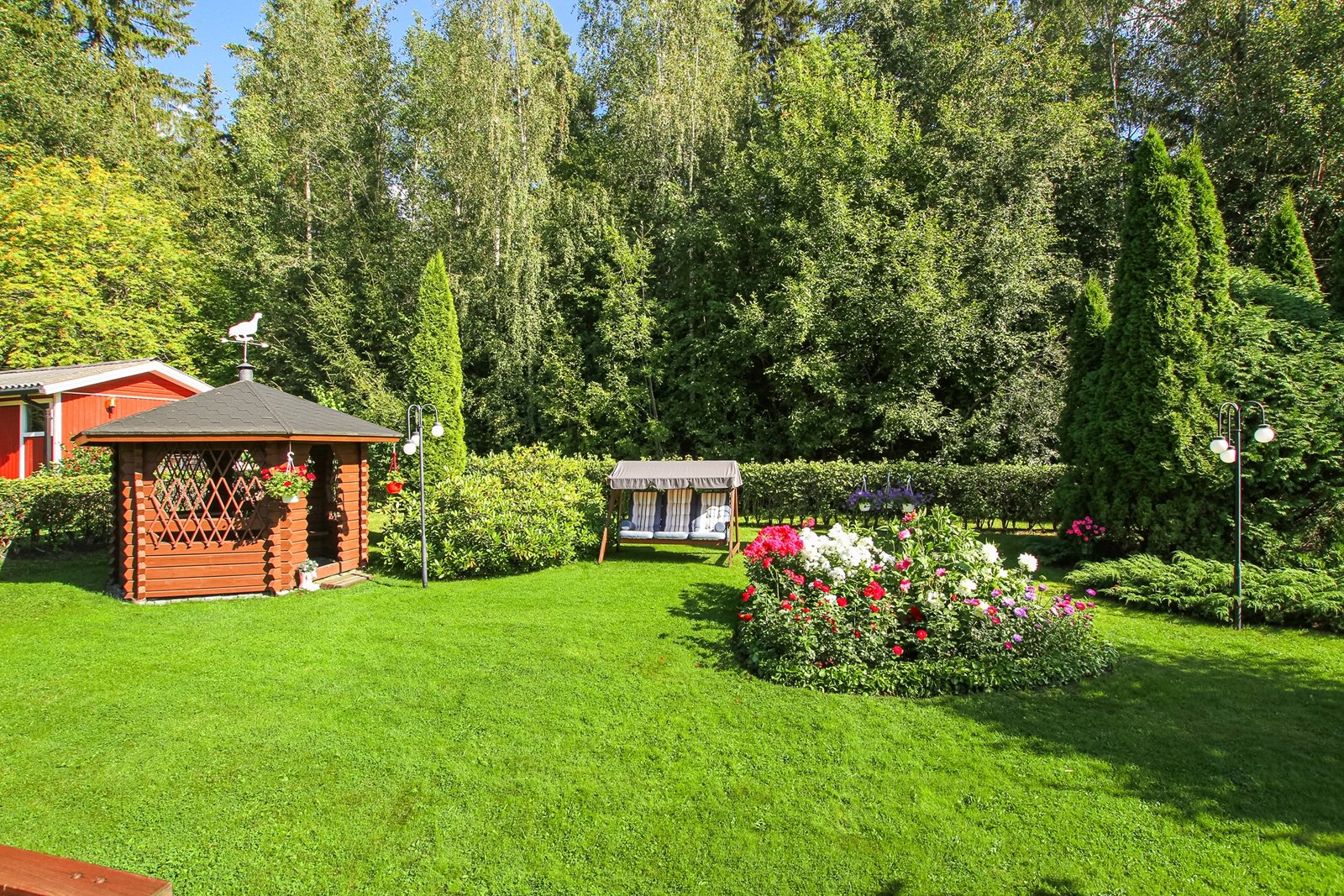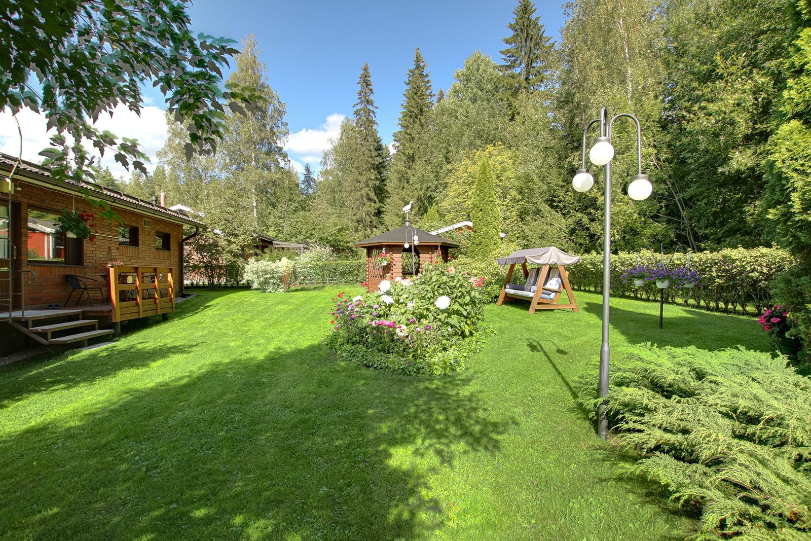 Kokonaisuuden kruunaa lämmin autotalli ja kaunis puutarhamainen puistoalueeseen rajoittuva tontti.