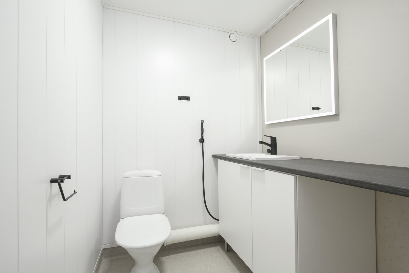 WC-istuin, pesuallas, peili, allaskaappi ja bidee-suihku