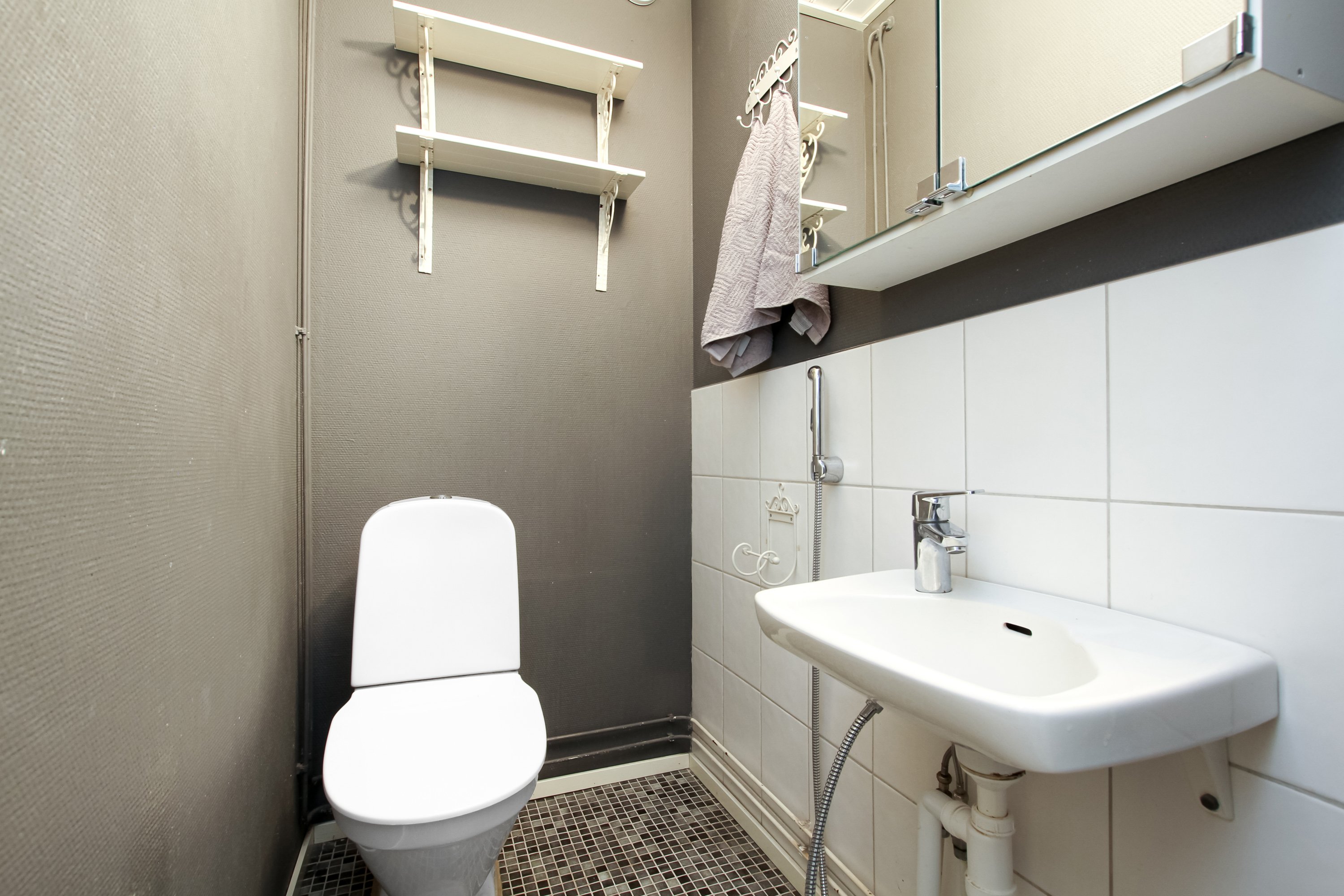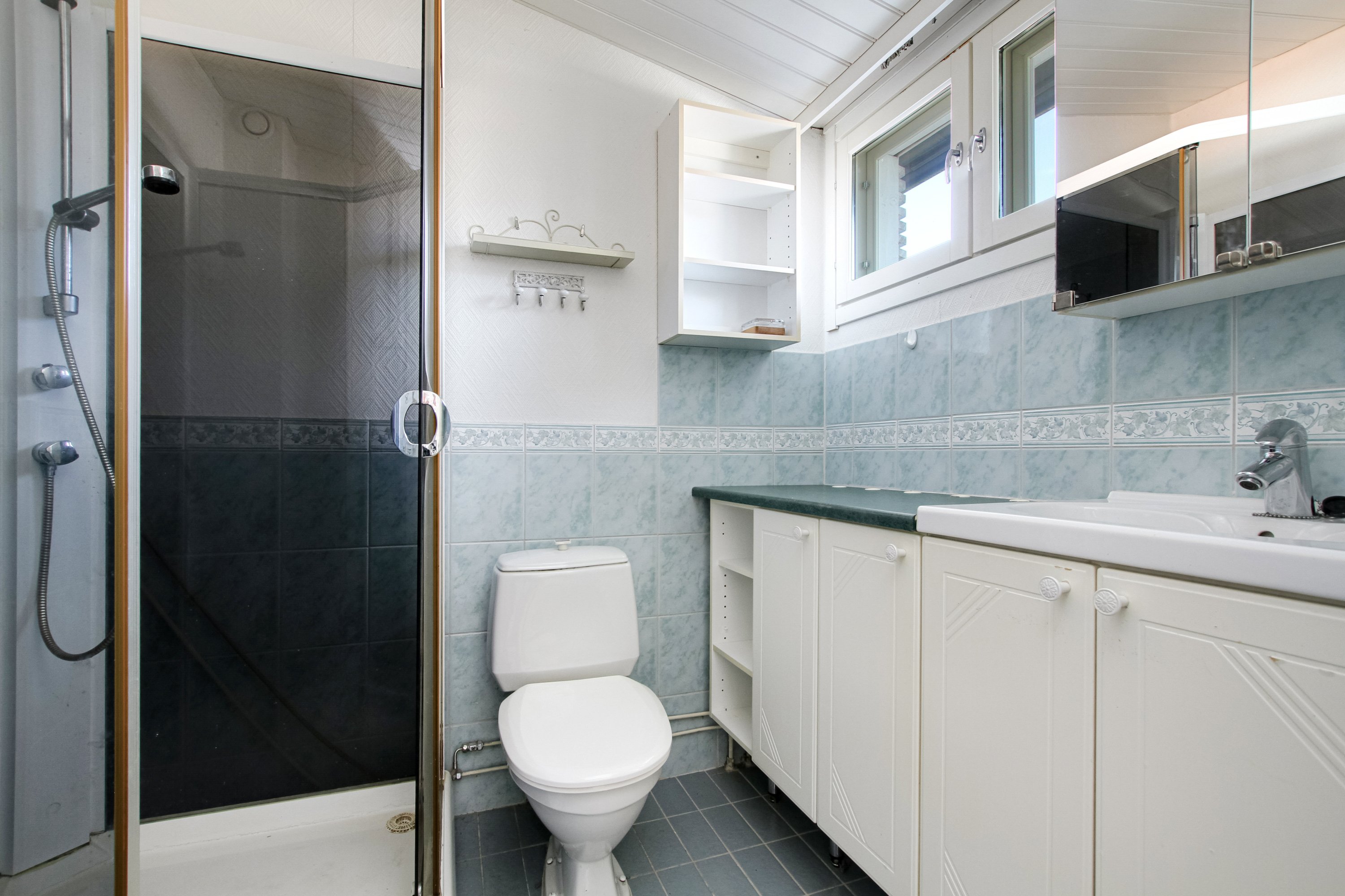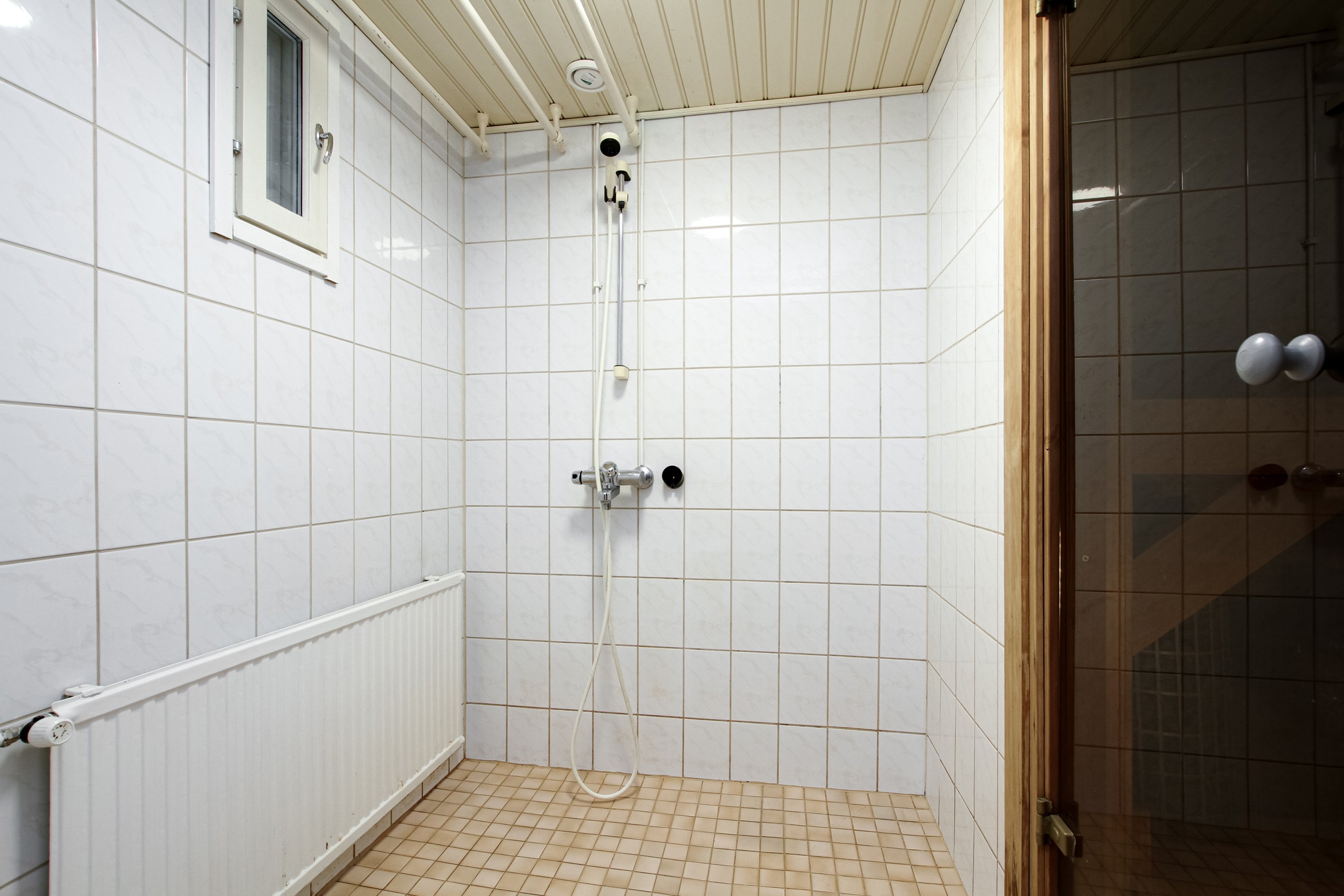 WC-istuin, suihkukaappi, lattialämmitys, peilikaappi, pesuallas, allaskaappi, lattiakaivo ja bidee-suihku