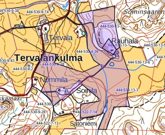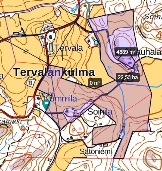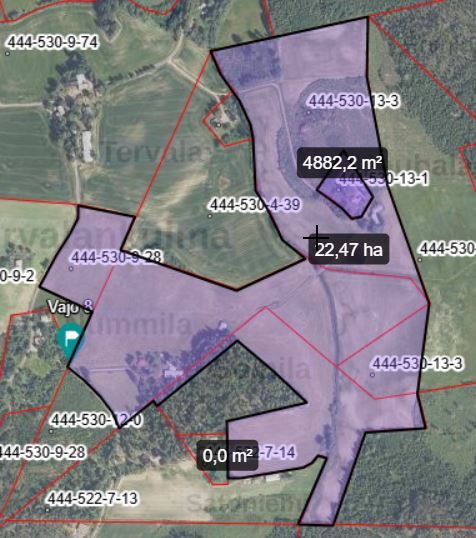Salaojitettua rinnepeltoa pihan välittömässä läheisyydessä n. 17,5 ha. Pelto ollut luomu-viljelyssä. Metsää n. 3 ha. Oma lampi. Kiinteistöjen metsiä omistaja pidättää itsellään. Mahdollisuus ostaa myös pelkkä kiva pihapiiri rakennuksineen.