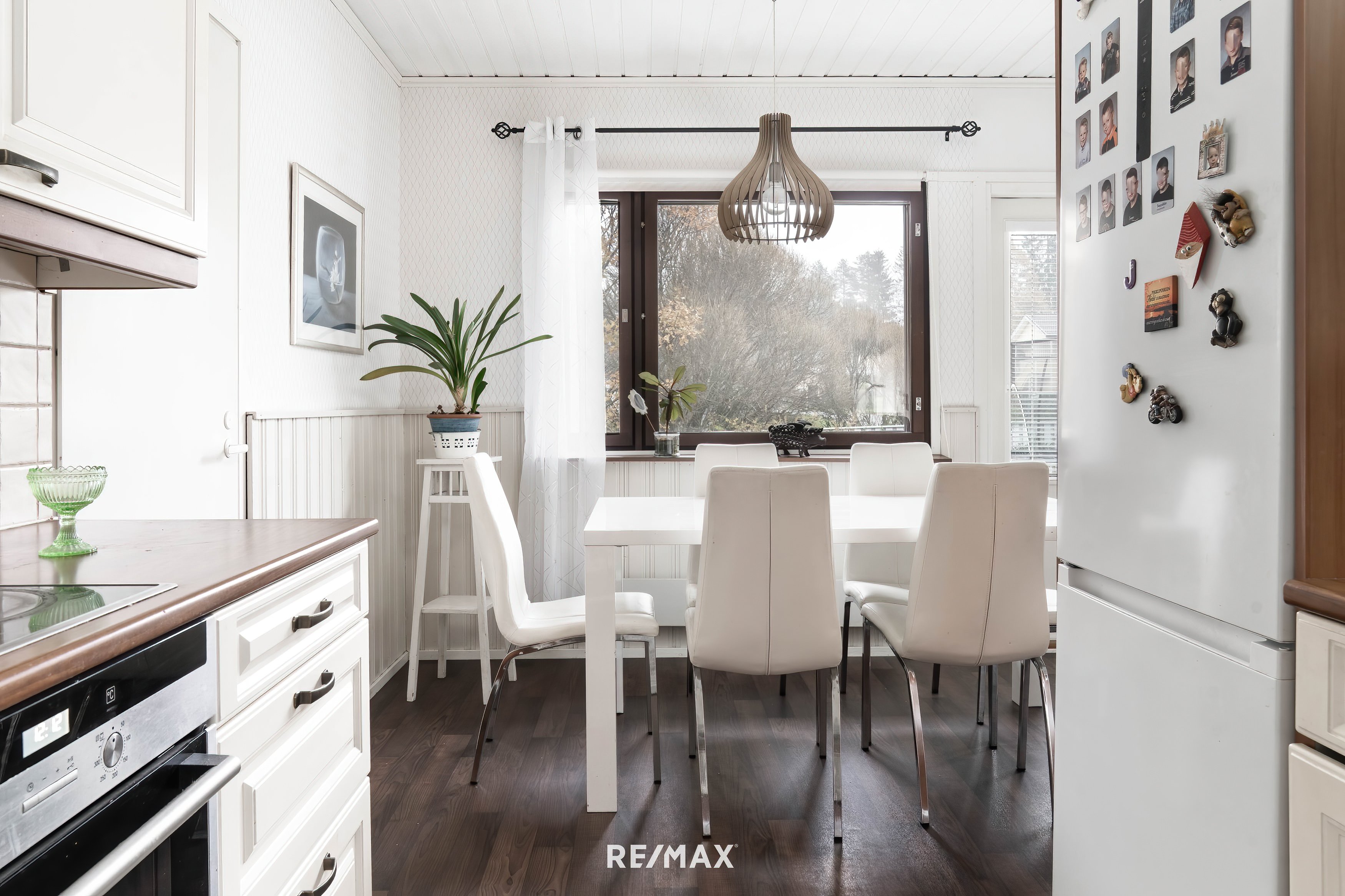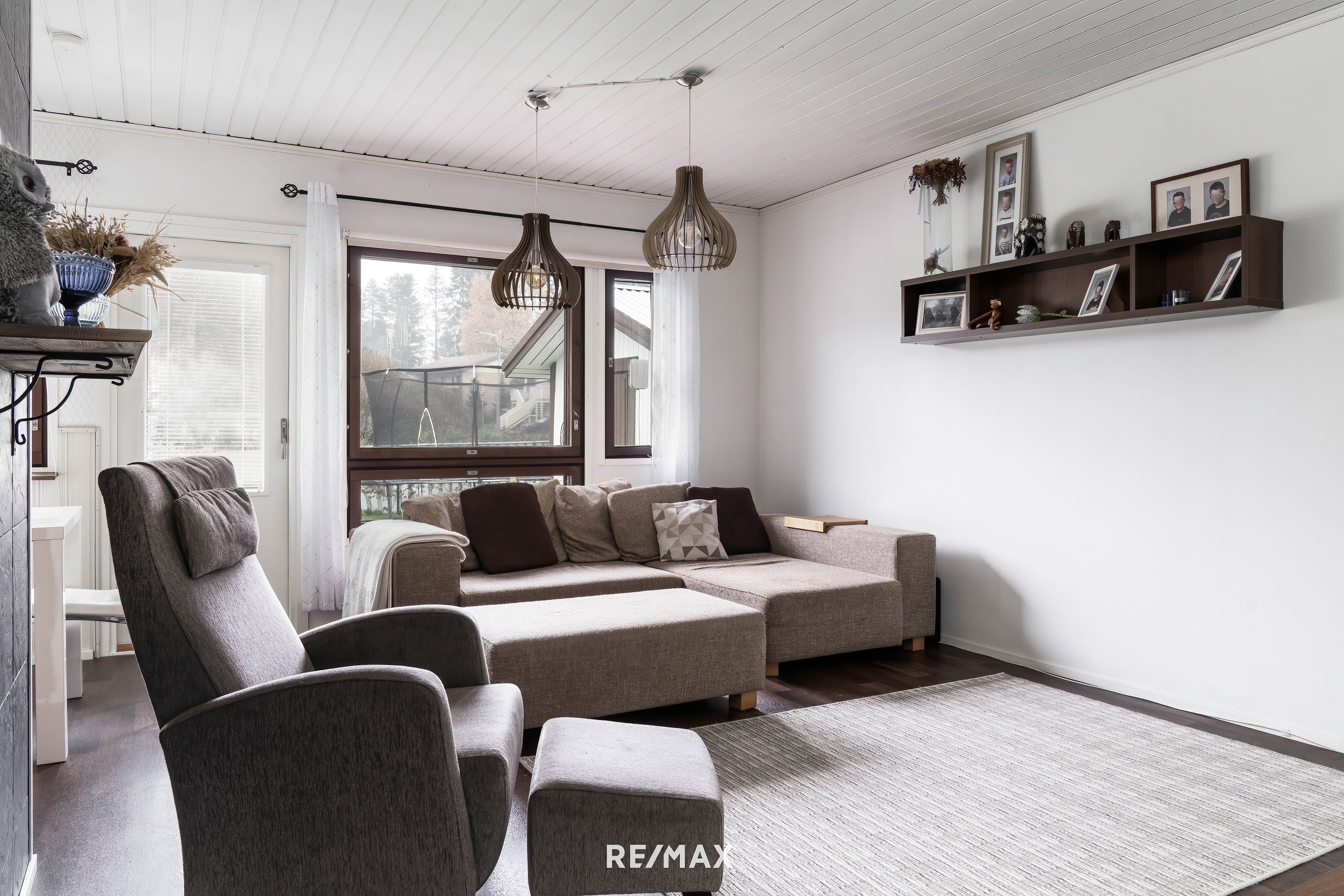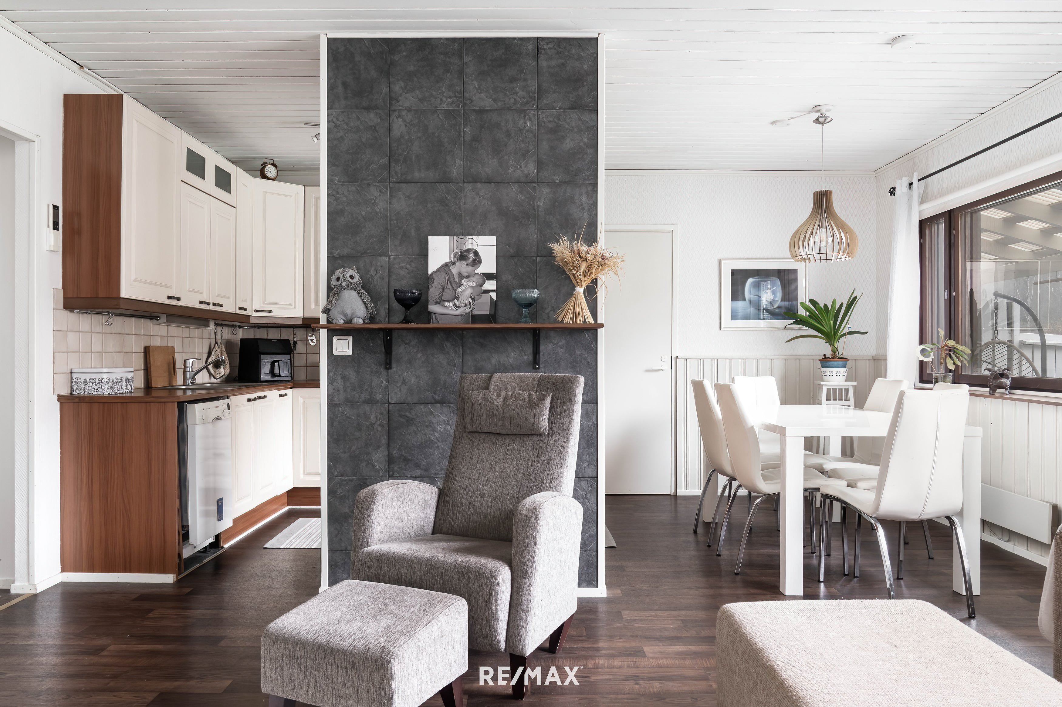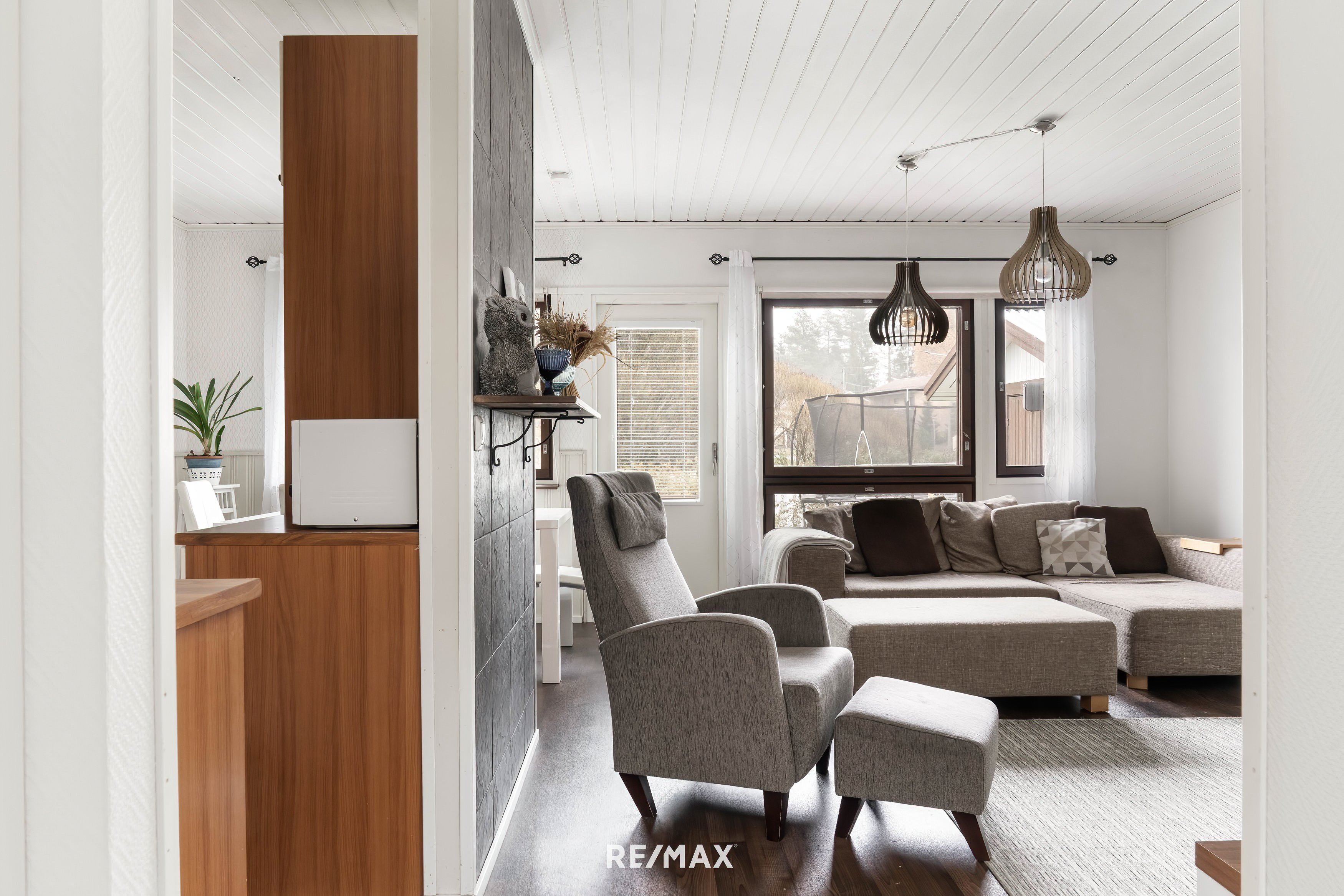 Ensivaikutelma tästä kodista on seesteinen ja lämmin. Suuret ikkunat päästävät valon sisään lähes joka suunnasta, ja vaaleat seinäpinnat korostavat tilan avaruutta ja joustovinyylimatto lattiapintana takaa kestävyyden vuosien päähän.