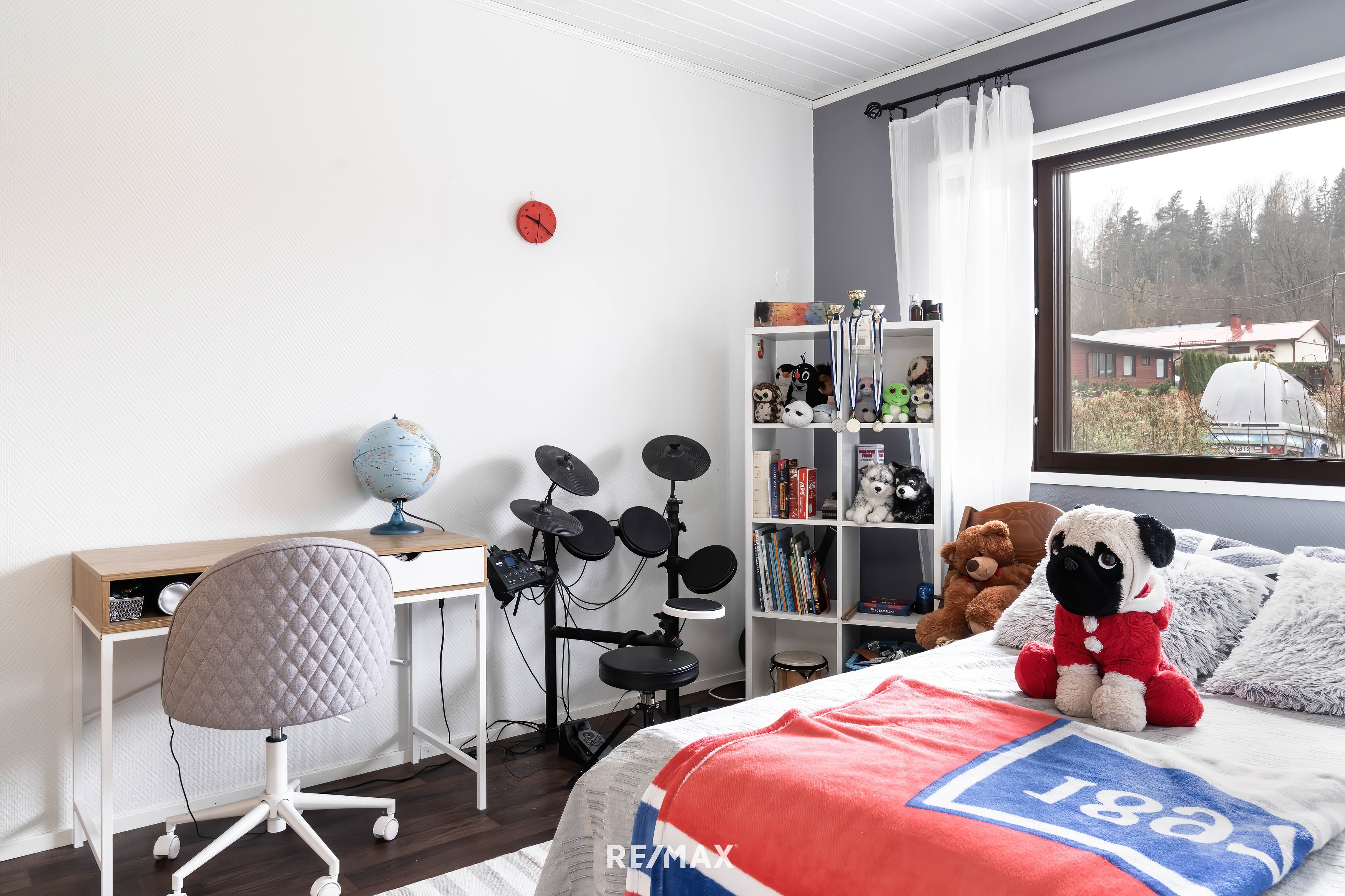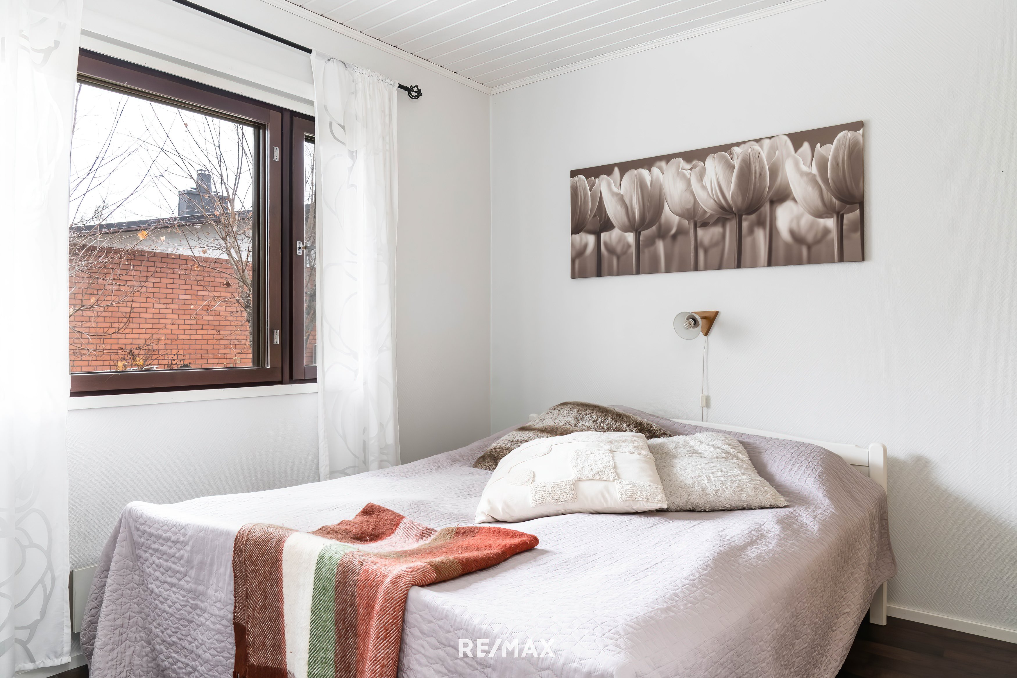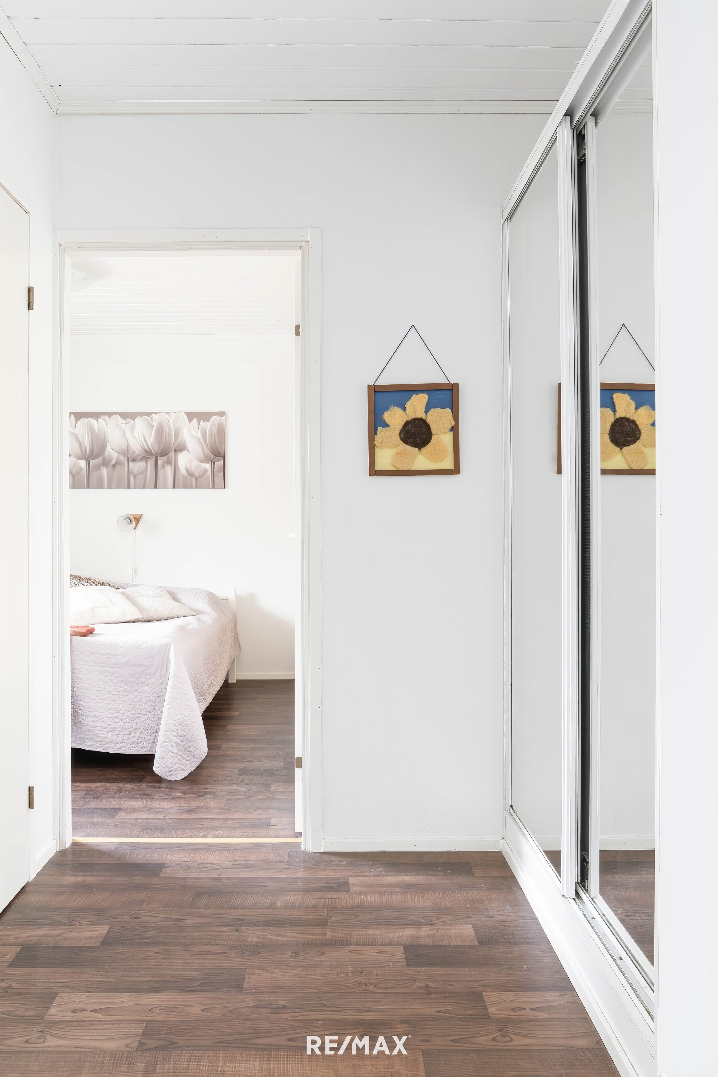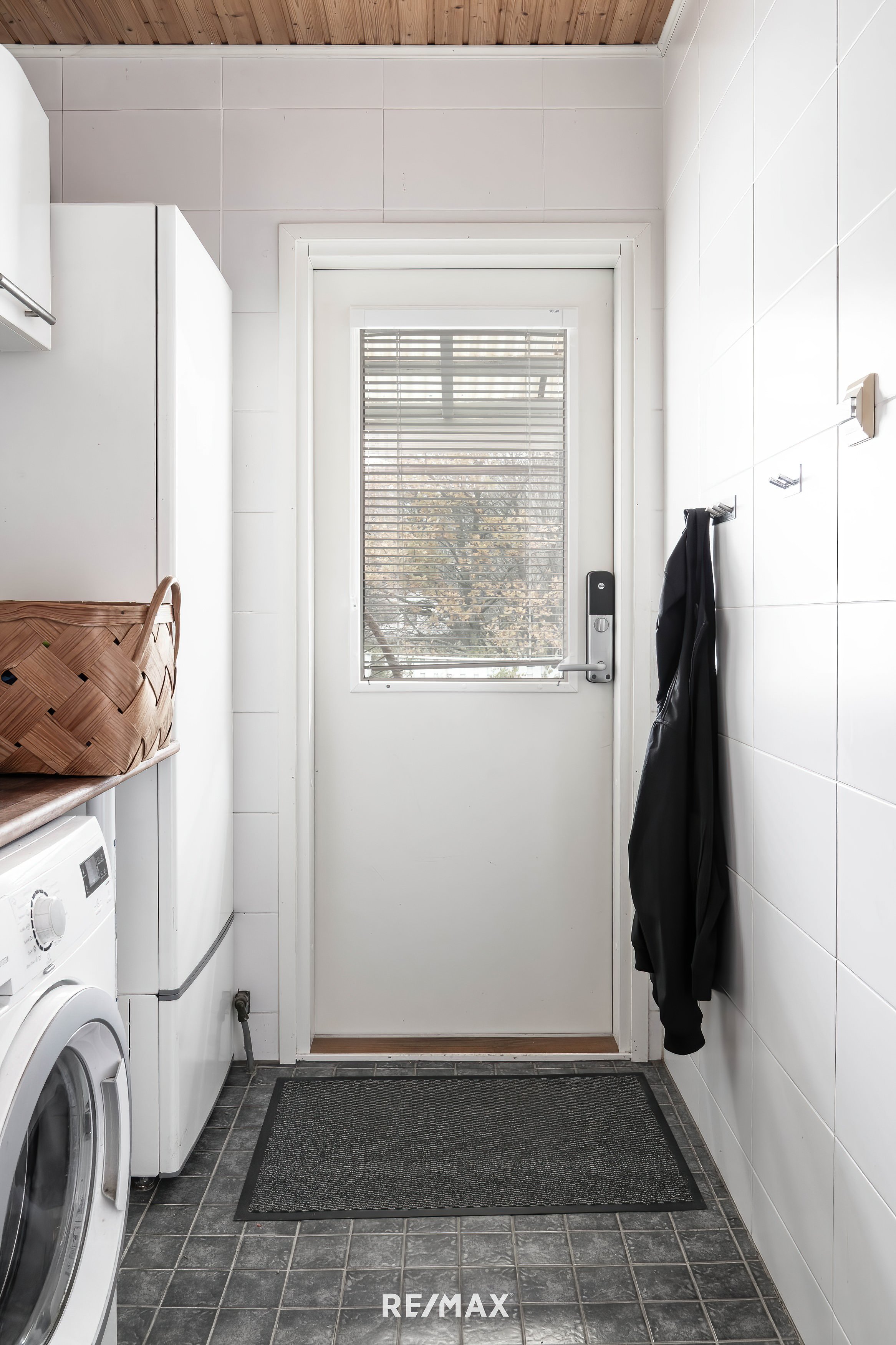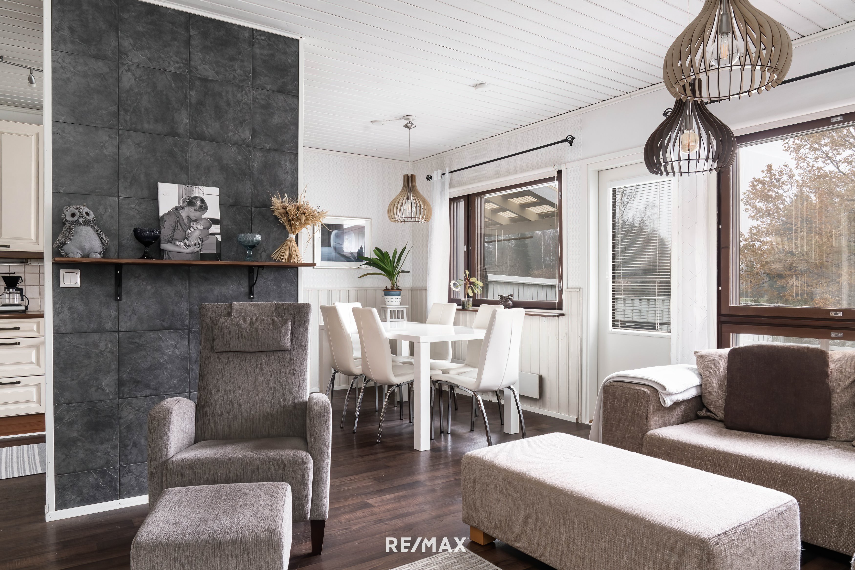 Ensivaikutelma tästä kodista on seesteinen ja lämmin. Suuret ikkunat päästävät valon sisään lähes joka suunnasta, ja vaaleat seinäpinnat korostavat tilan avaruutta ja joustovinyylimatto lattiapintana takaa kestävyyden vuosien päähän.