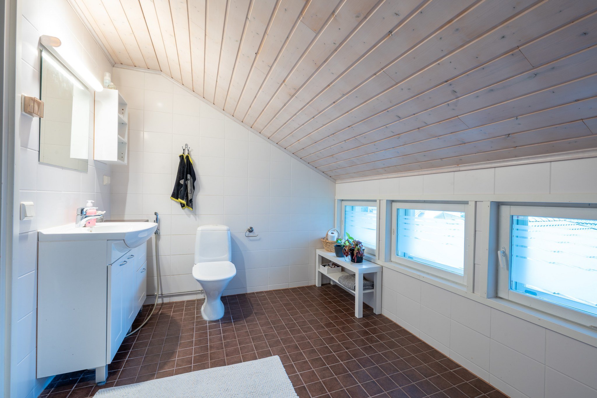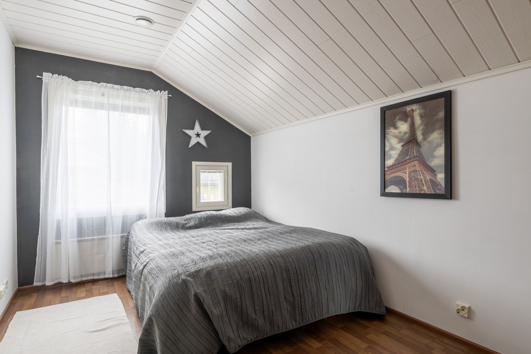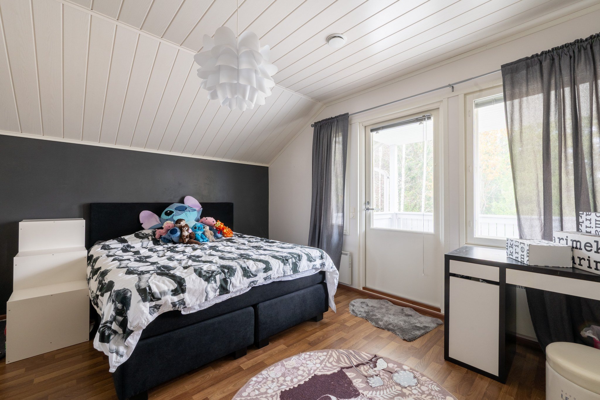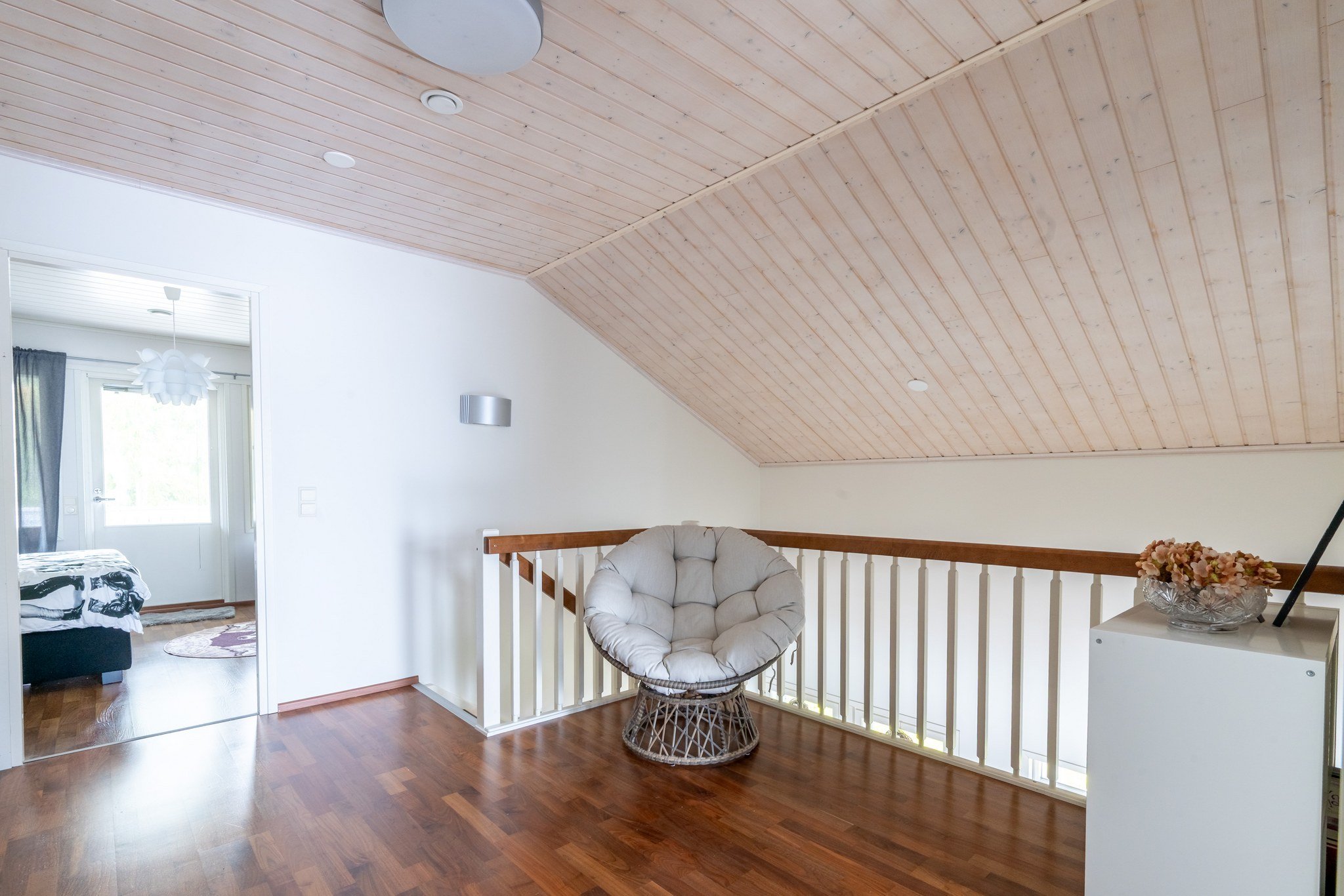Neljä makuuhuonetta tarjoavat runsaasti tilaa ja säilytysratkaisuja. Päämakuuhuoneessa on oma vaatehuone sekä käynti länteen avautuvalle parvekkeelle. Saunaosasto ja tilava kodinhoitohuone tekevät arjesta sujuvaa, ja kaksi kylpyhuonetta sekä erillinen wc tuovat käytännöllisyyttä. Lisäksi talossa on autotalli, joka lisää asumisen mukavuutta, sekä asfaltoitu sisääntulopiha.