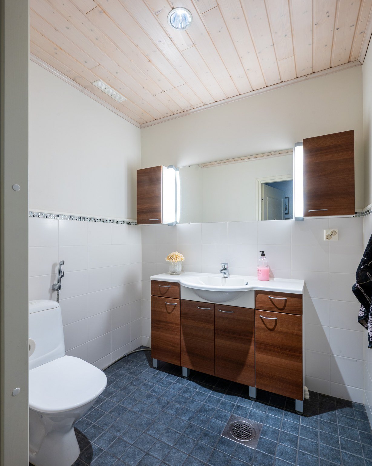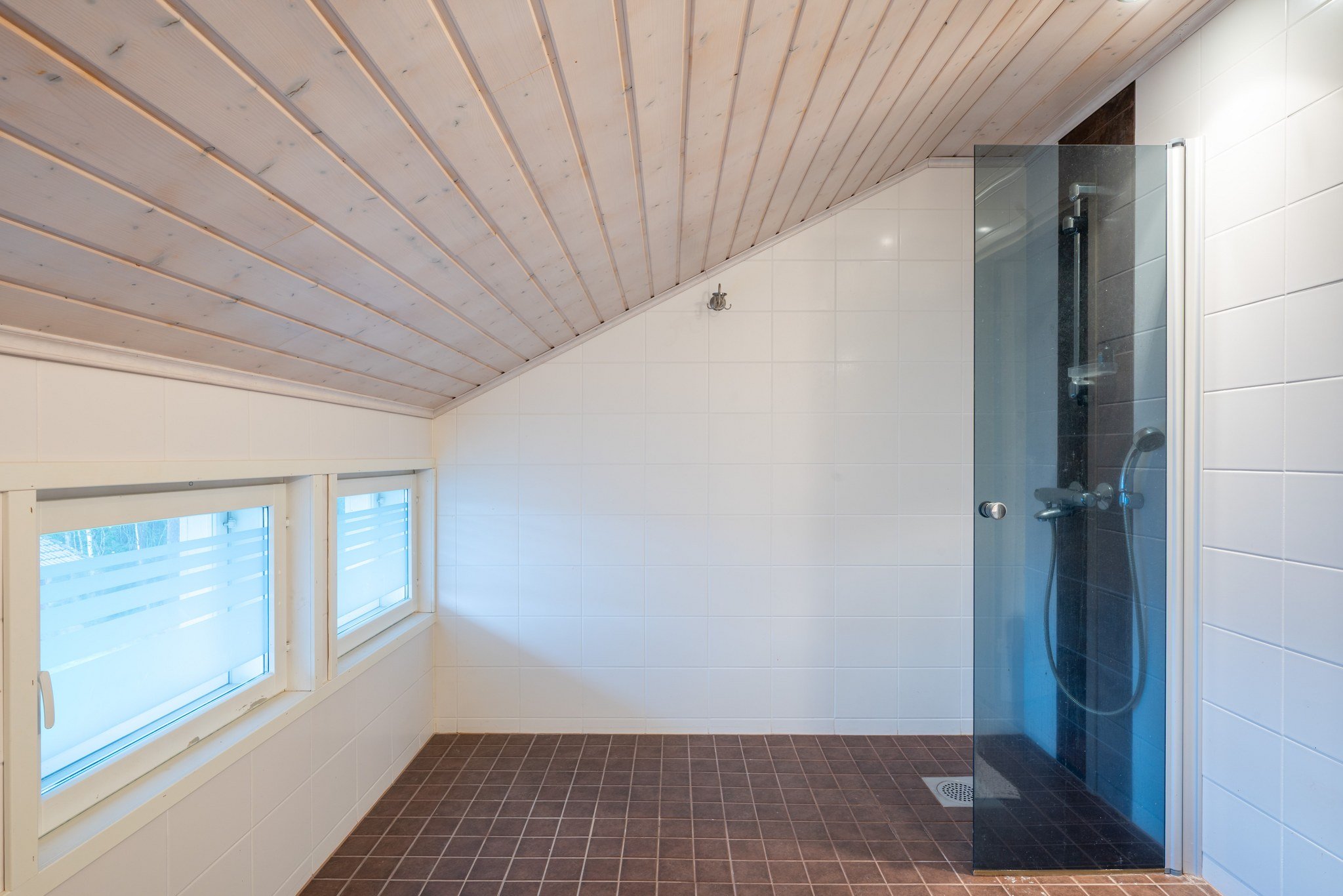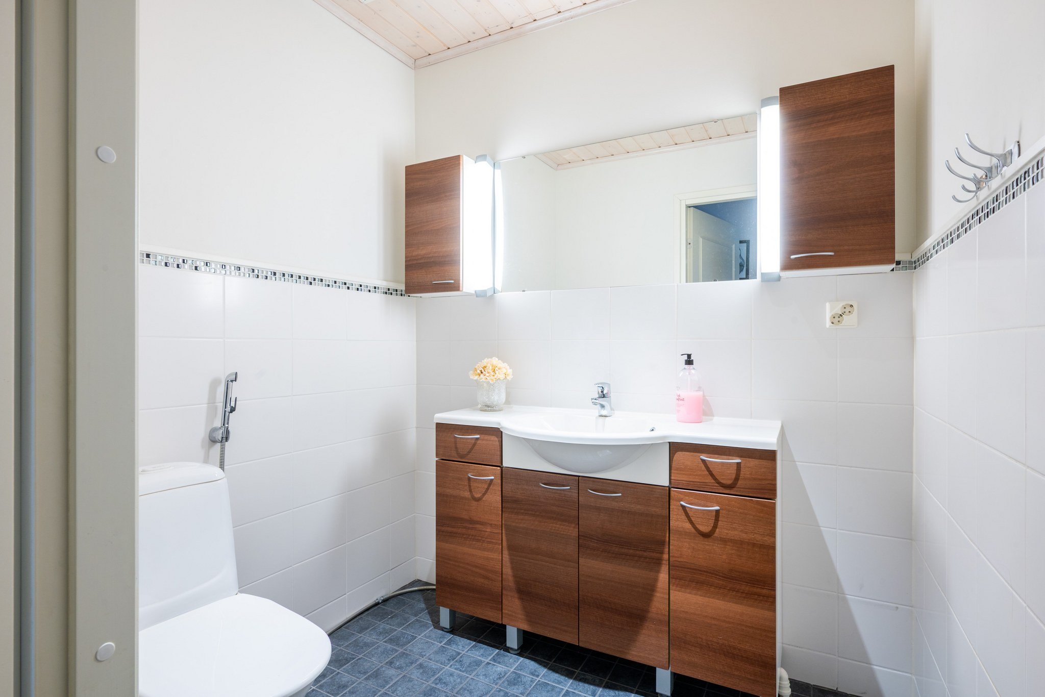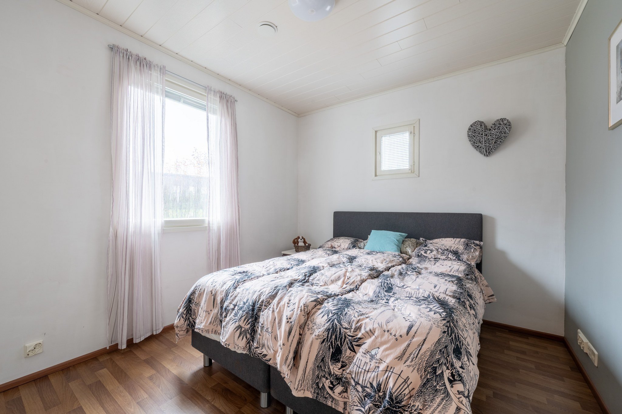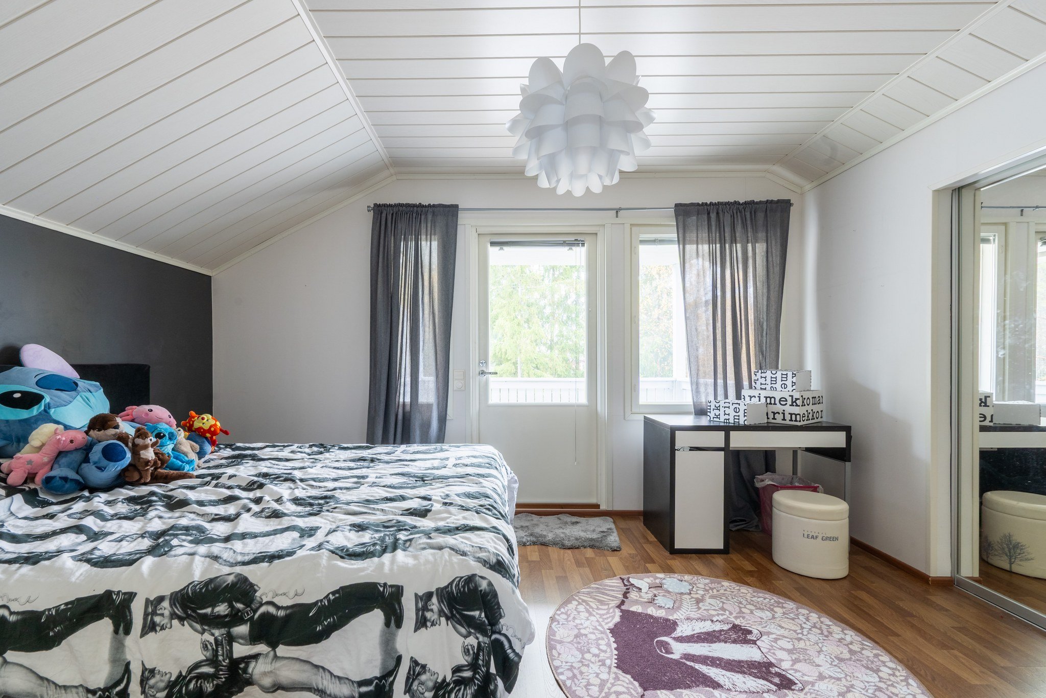 Neljä makuuhuonetta tarjoavat runsaasti tilaa ja säilytysratkaisuja. Päämakuuhuoneessa on oma vaatehuone sekä käynti länteen avautuvalle parvekkeelle. Saunaosasto ja tilava kodinhoitohuone tekevät arjesta sujuvaa, ja kaksi kylpyhuonetta sekä erillinen wc tuovat käytännöllisyyttä. Lisäksi talossa on autotalli, joka lisää asumisen mukavuutta, sekä asfaltoitu sisääntulopiha.