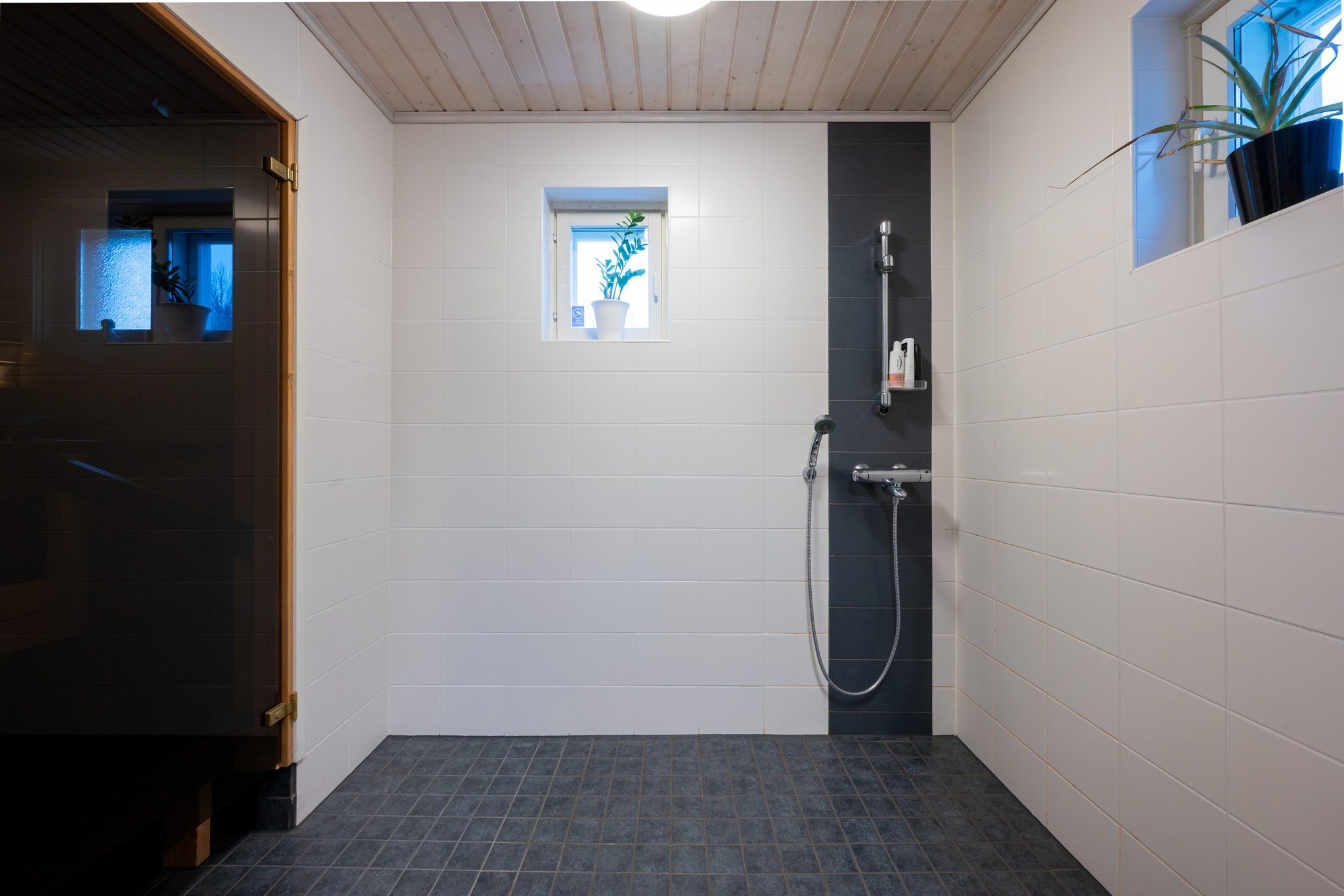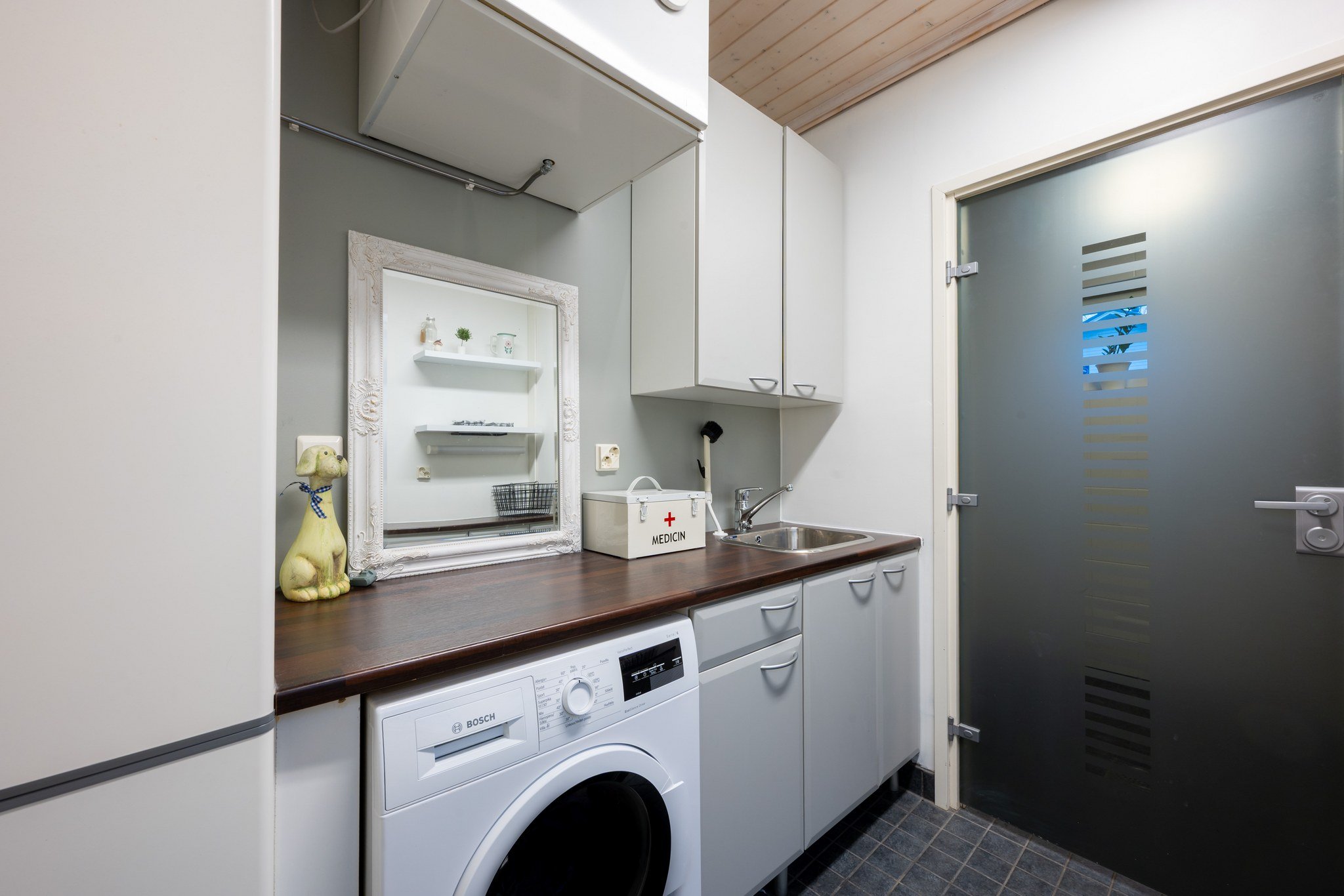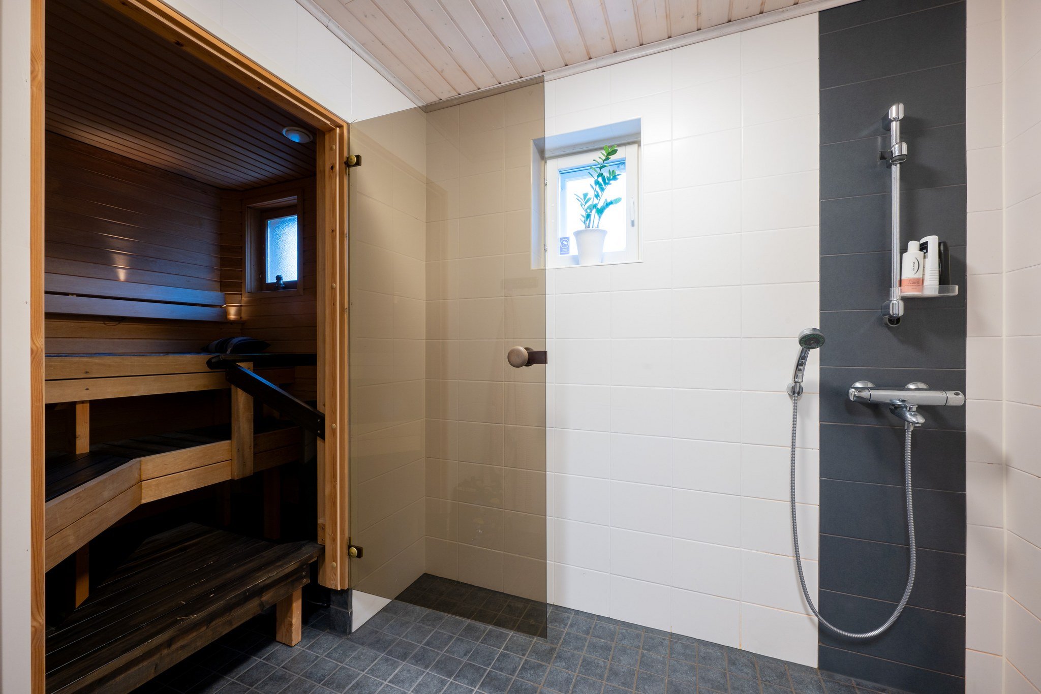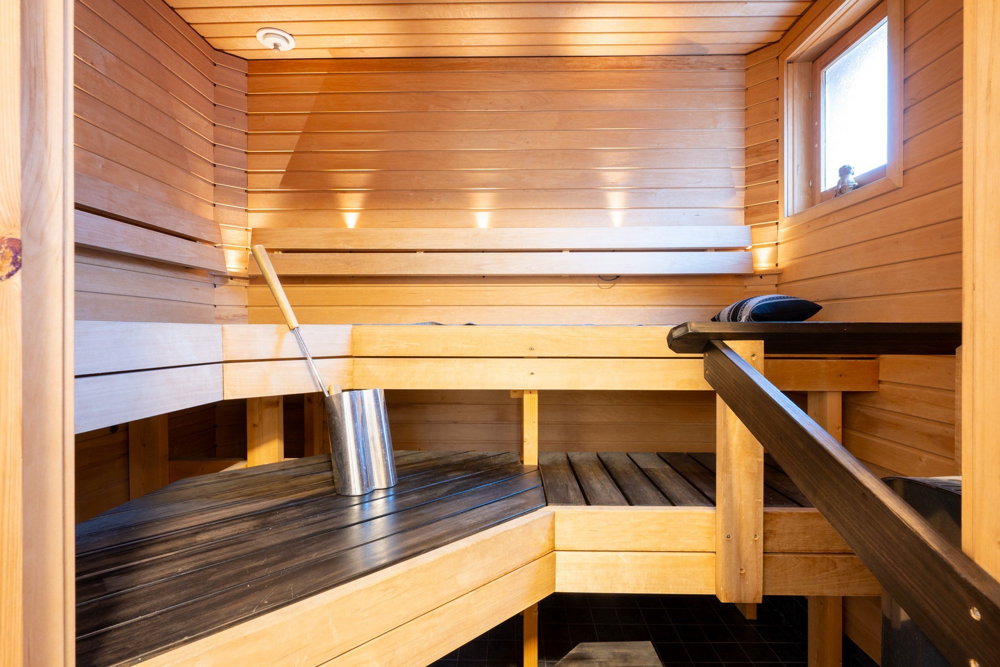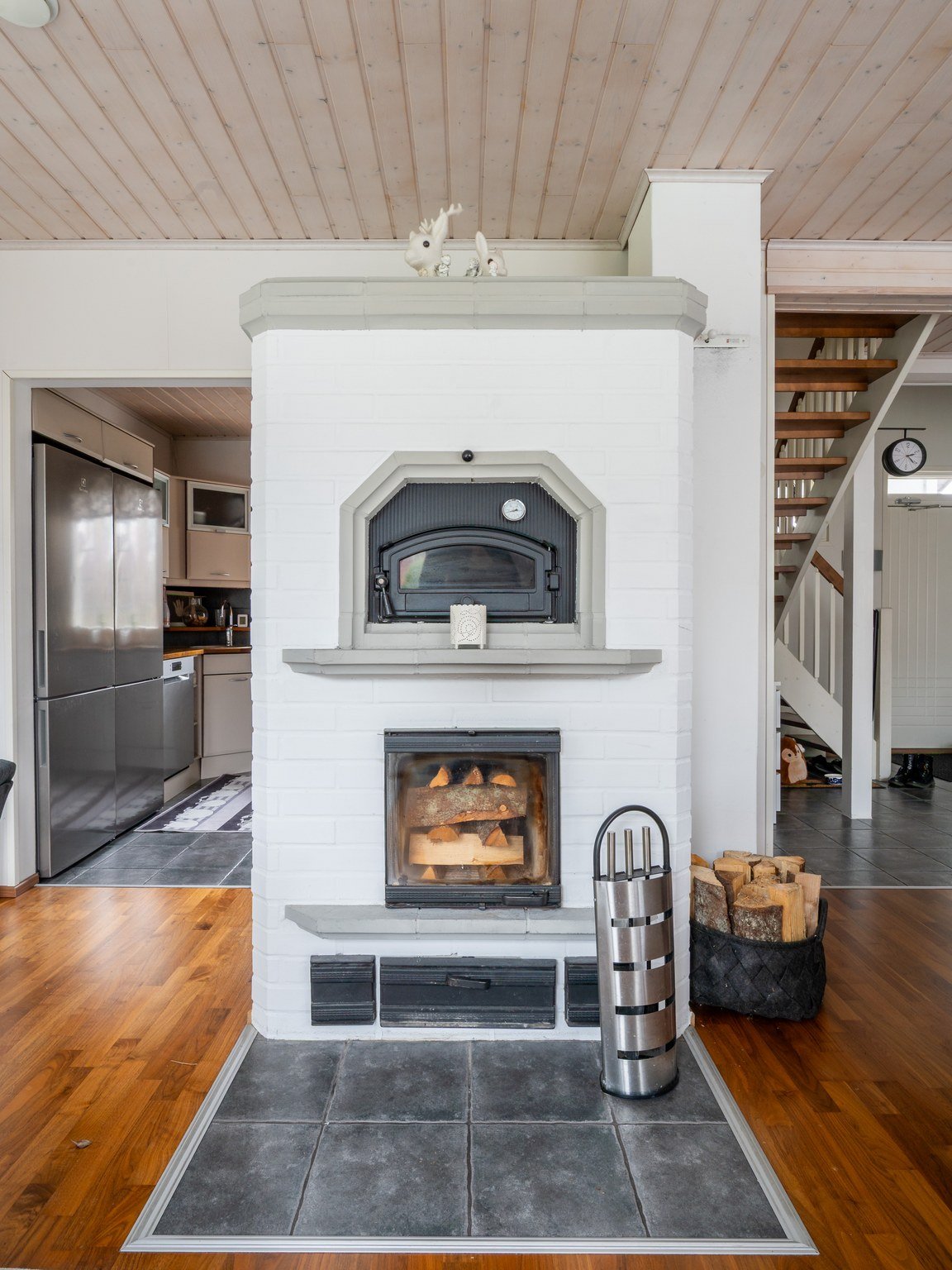 Olohuone on avara ja valoisa, ja varaava takka tuo siihen lämpöä ja viihtyisyyttä. Olohuoneesta on käynti talon päädyssä sijaitsevalle suurelle terassille, jossa voi rentoutua paljussa. Keittiö on hyvin varusteltu, ja siellä on muun muassa kaksi jääkaappipakastinta sekä astianpesukone – kaikki uusittu äskettäin.
