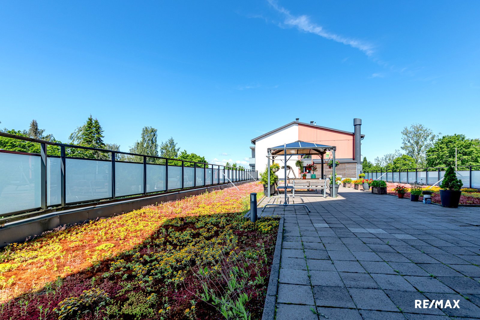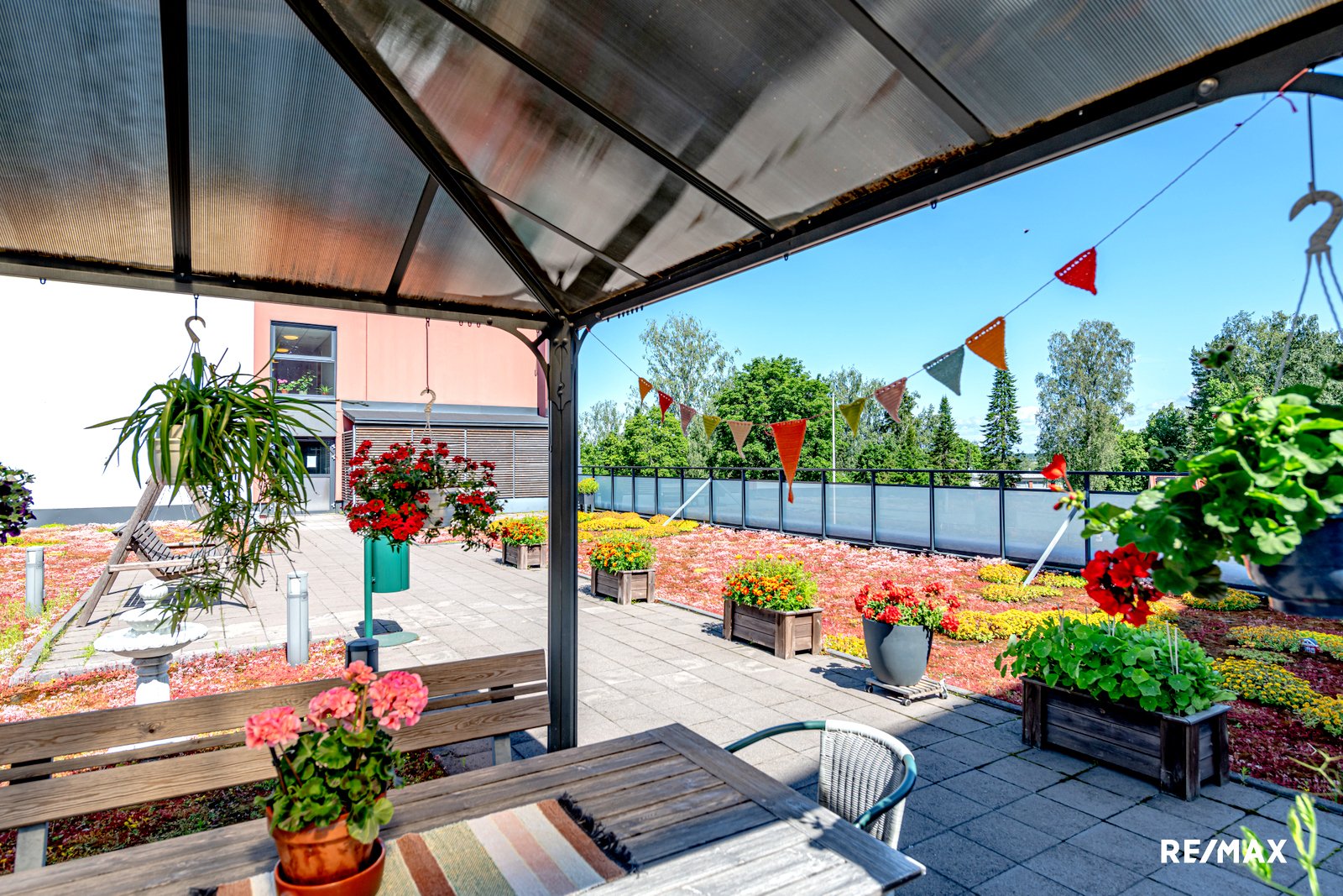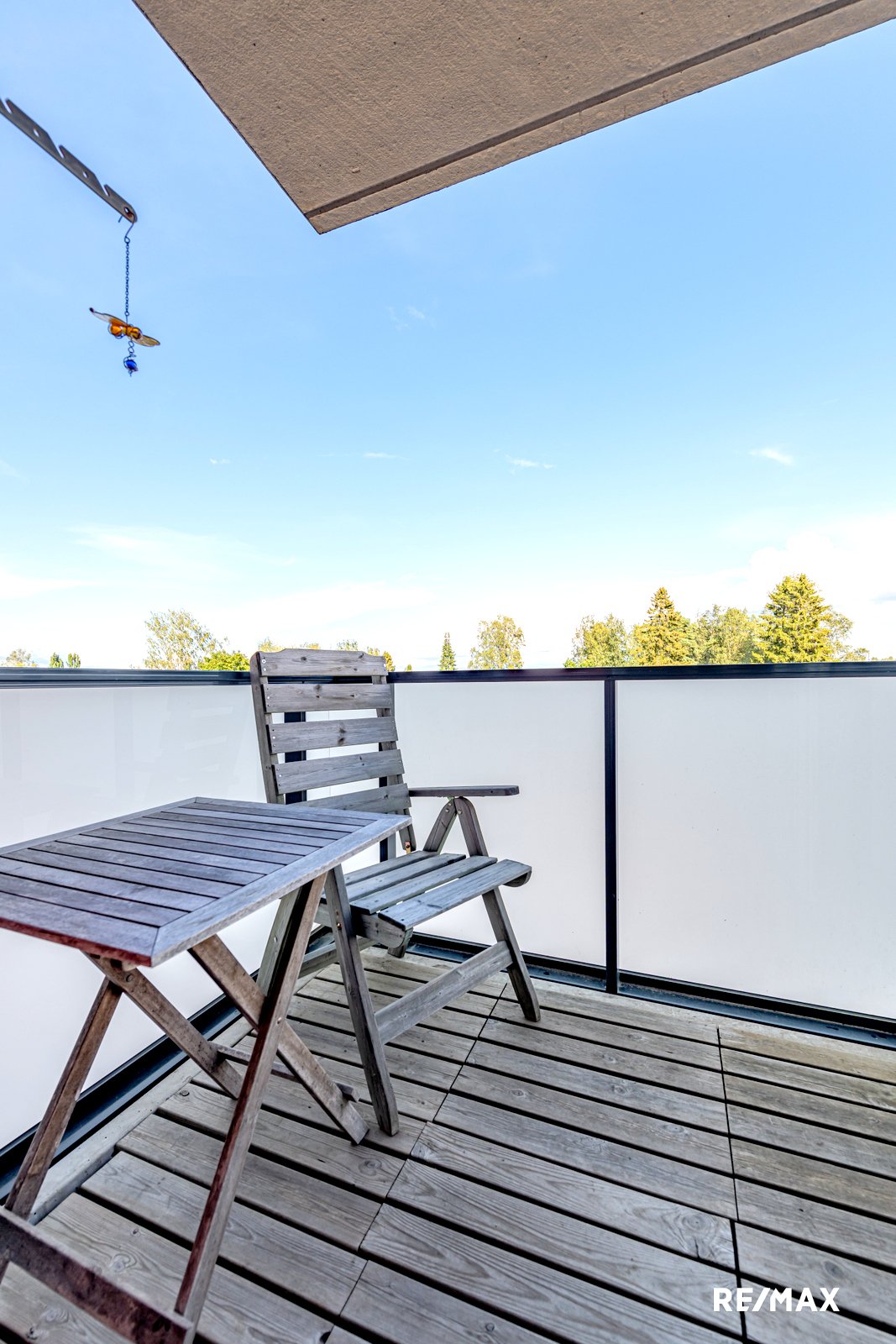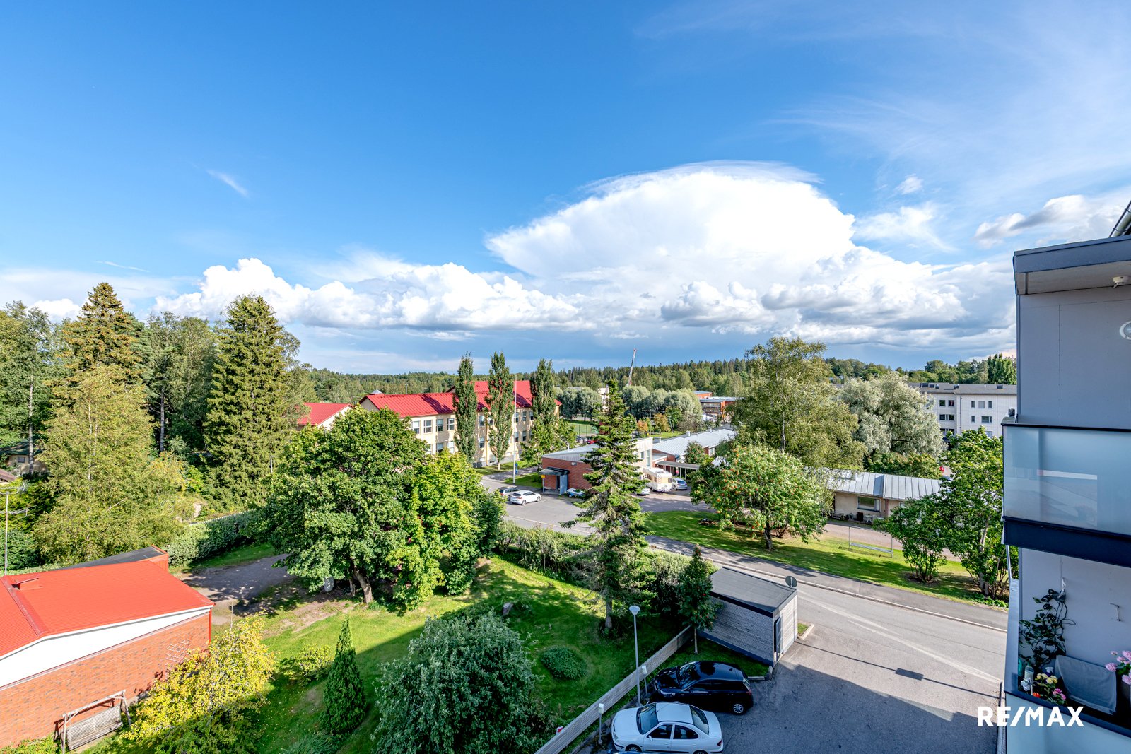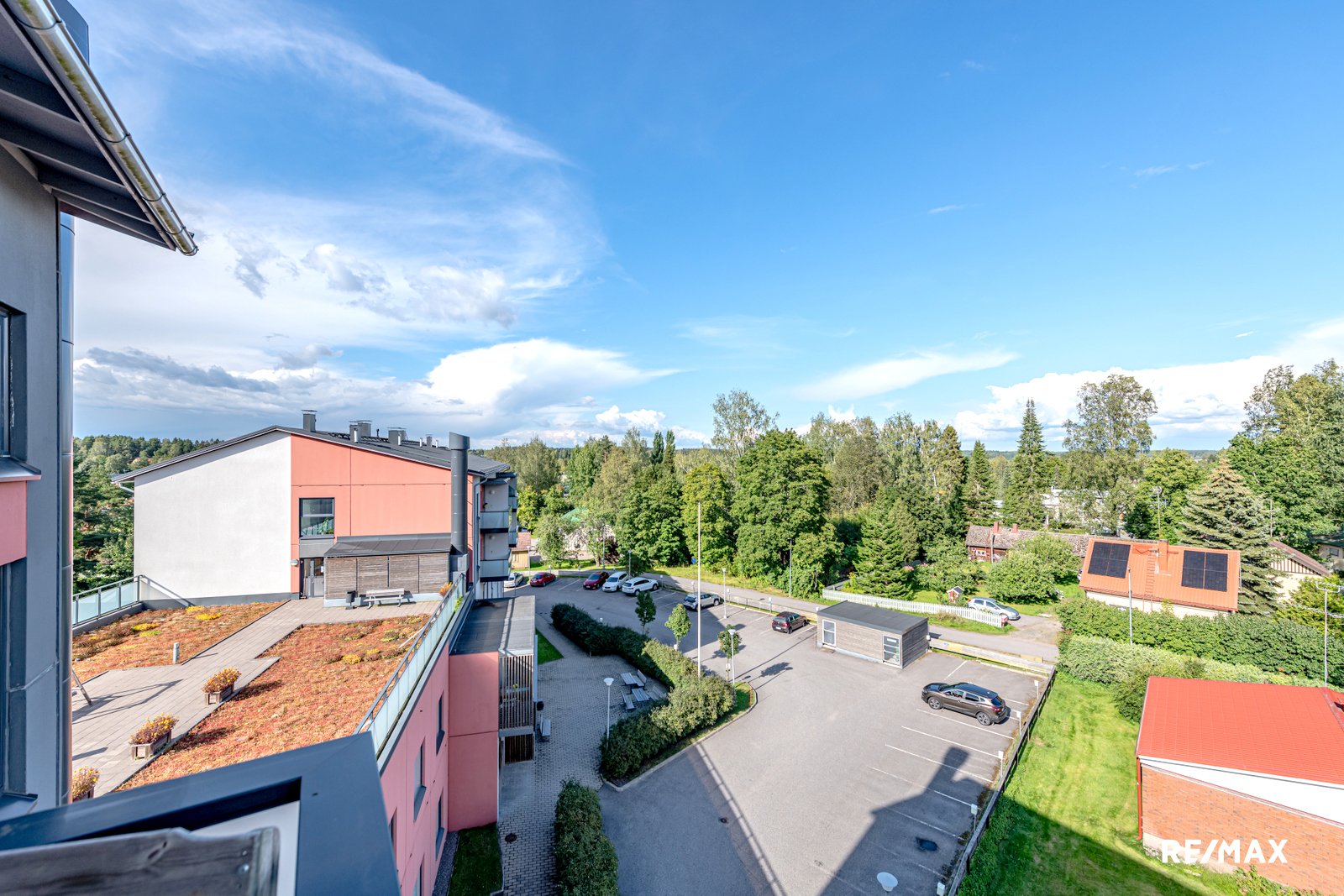 Viidennen kerroksen asunto valmistumisvuosi 2016. Avarat näkymät parvekkeelta aamuauringon suuntaan.