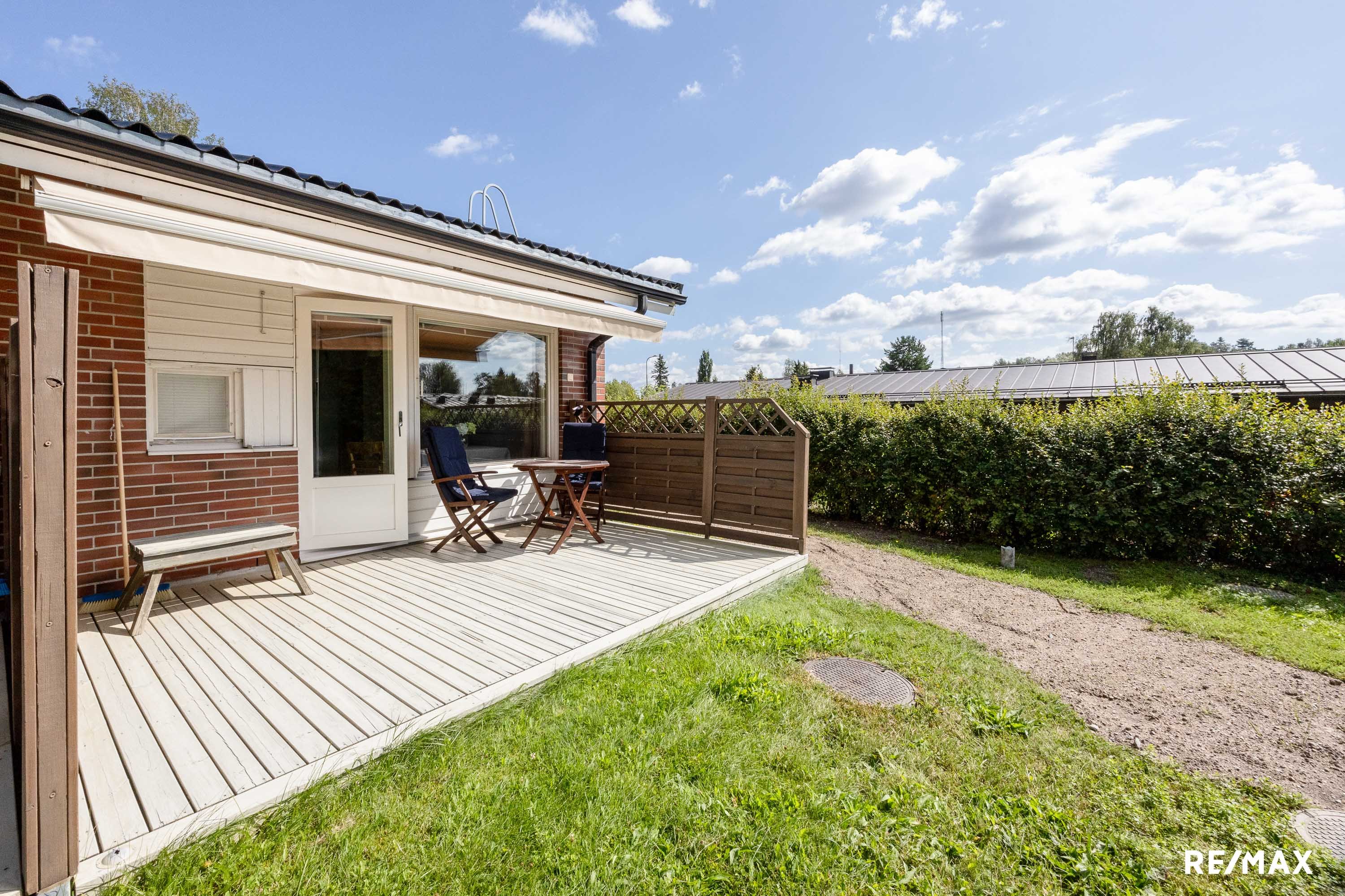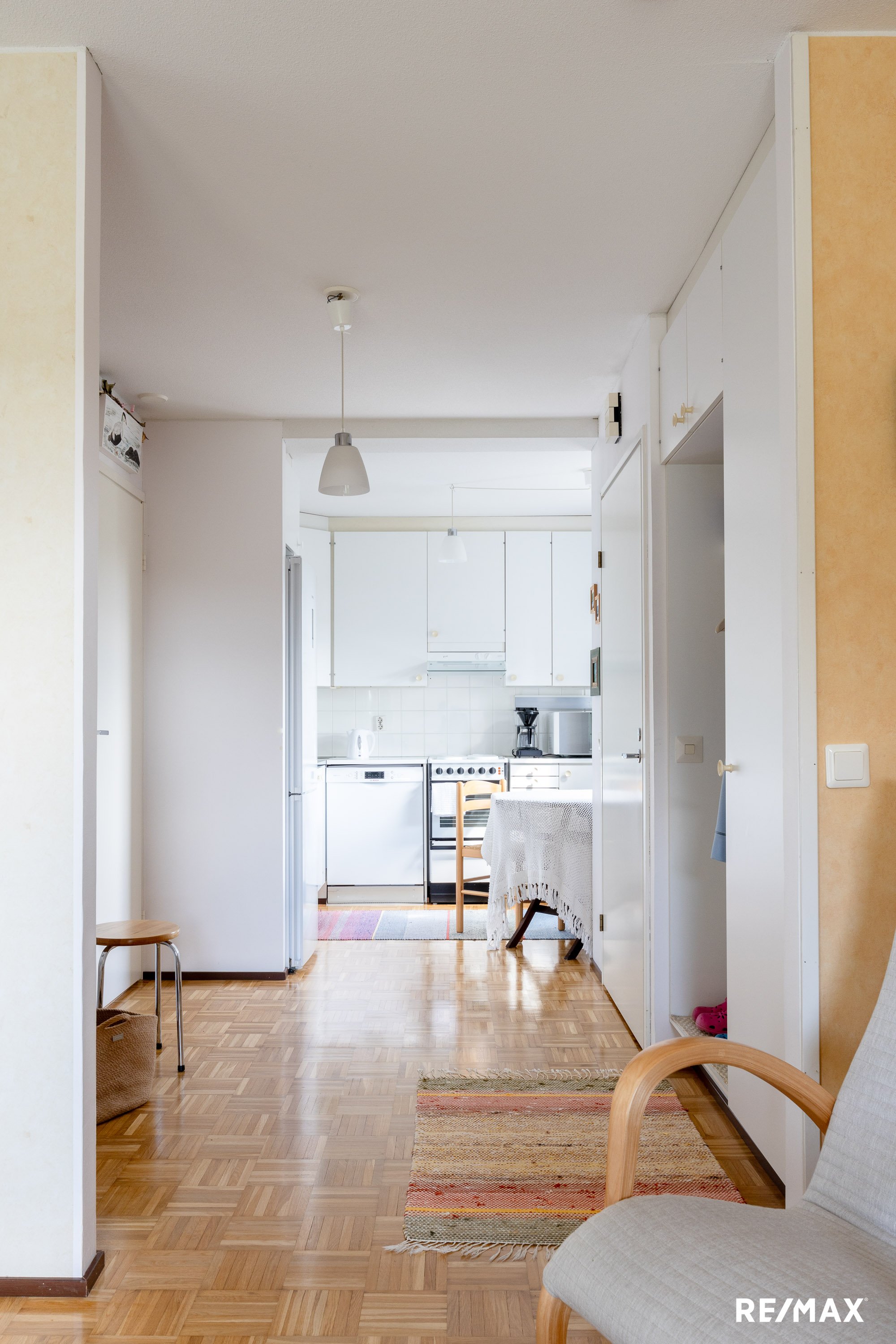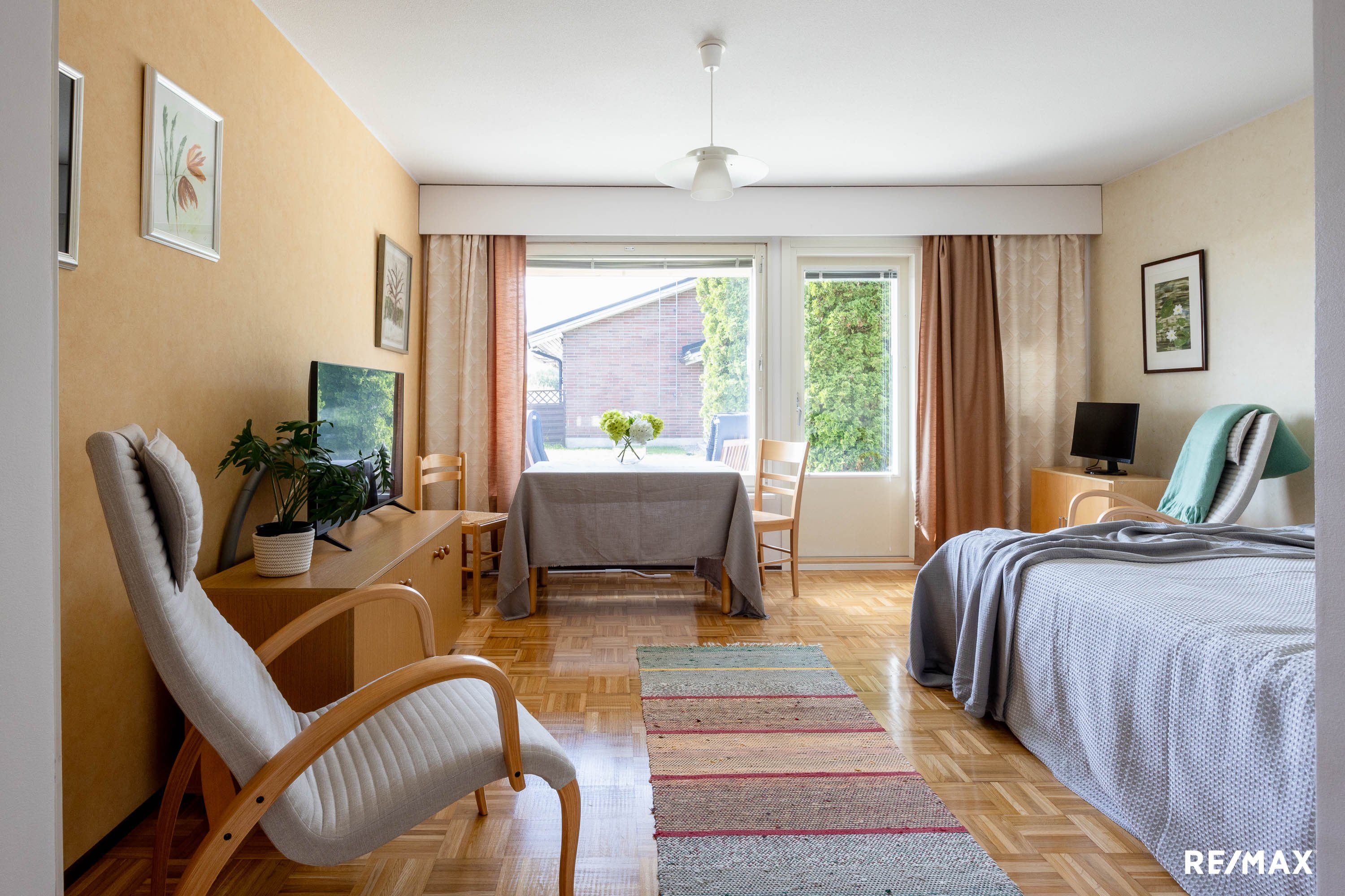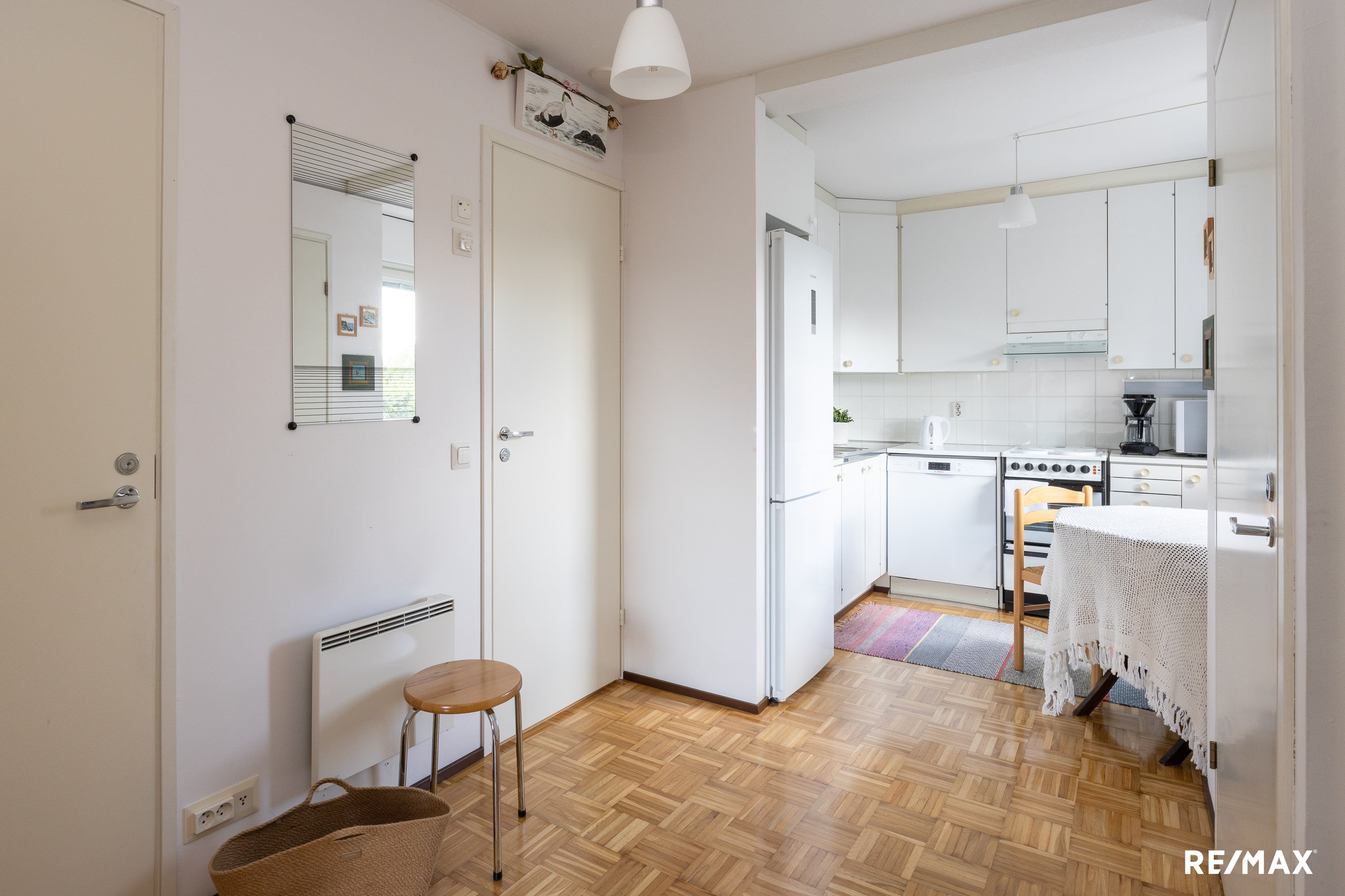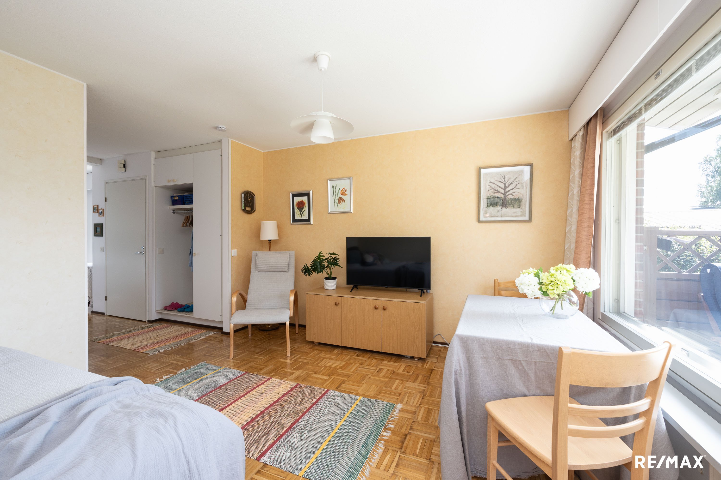 Asunnossa on valoisa olo-/makuuhuone, jonka isosta ikkunasta on vehreä näkymä takapihalle. Takapiha on vihreiden tuijien ja nurmen reunustama helppohoitoinen terassi, jossa auringon kuumilta säteiltä saa suojaa markiisin alla. Keittiöön mahtuu hyvin pieni pöytä. Pesuhuone on kauniisti remontoitu ja saunassa saa hyvät löylyt. Asunnon sisääntulon yhteydessä oleva ulkovarasto on vaatehuoneen lisäksi tarpeellinen säilytystila. Tämä koti on täydellinen valinta yksineläjälle ja kyllä tänne kaksikin saa mahtumaan.