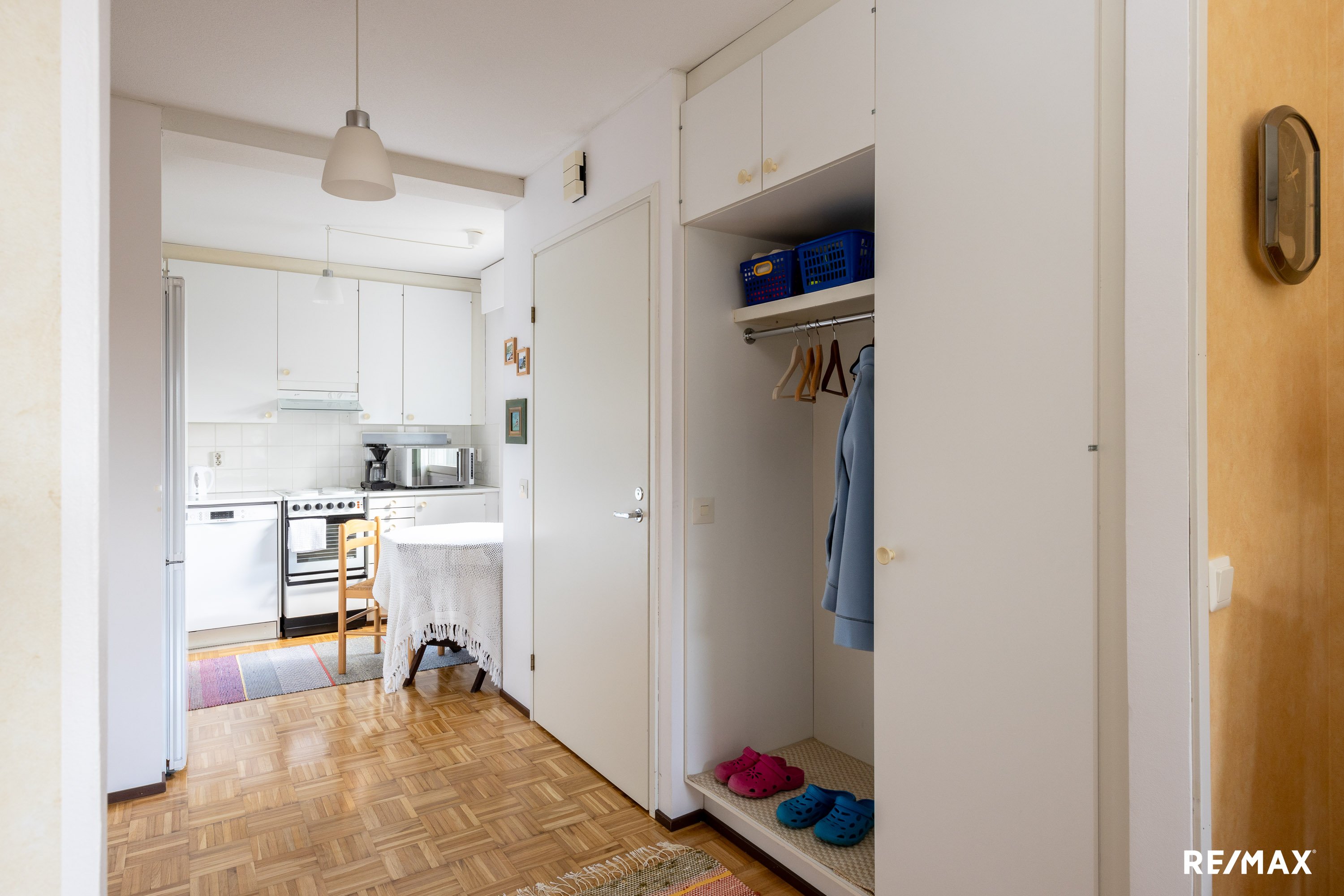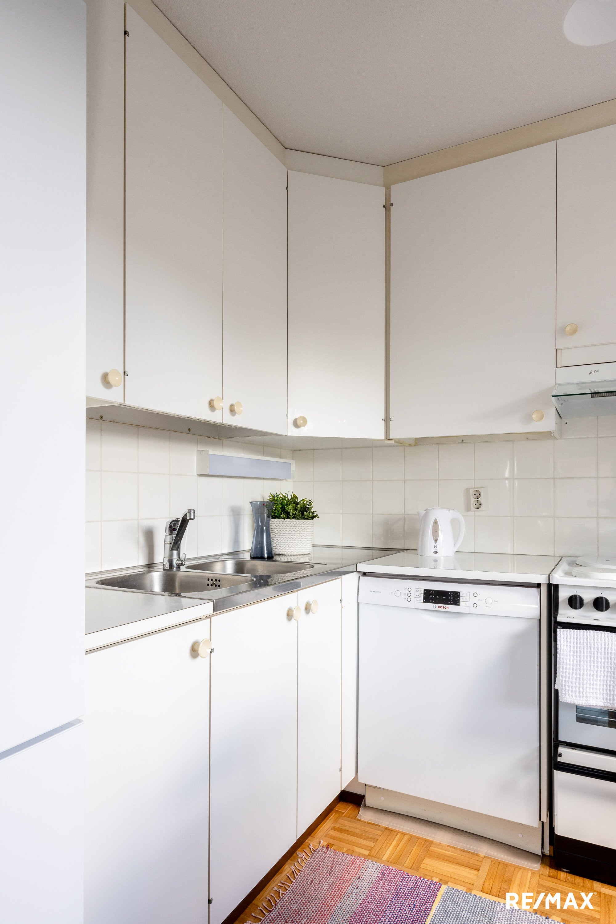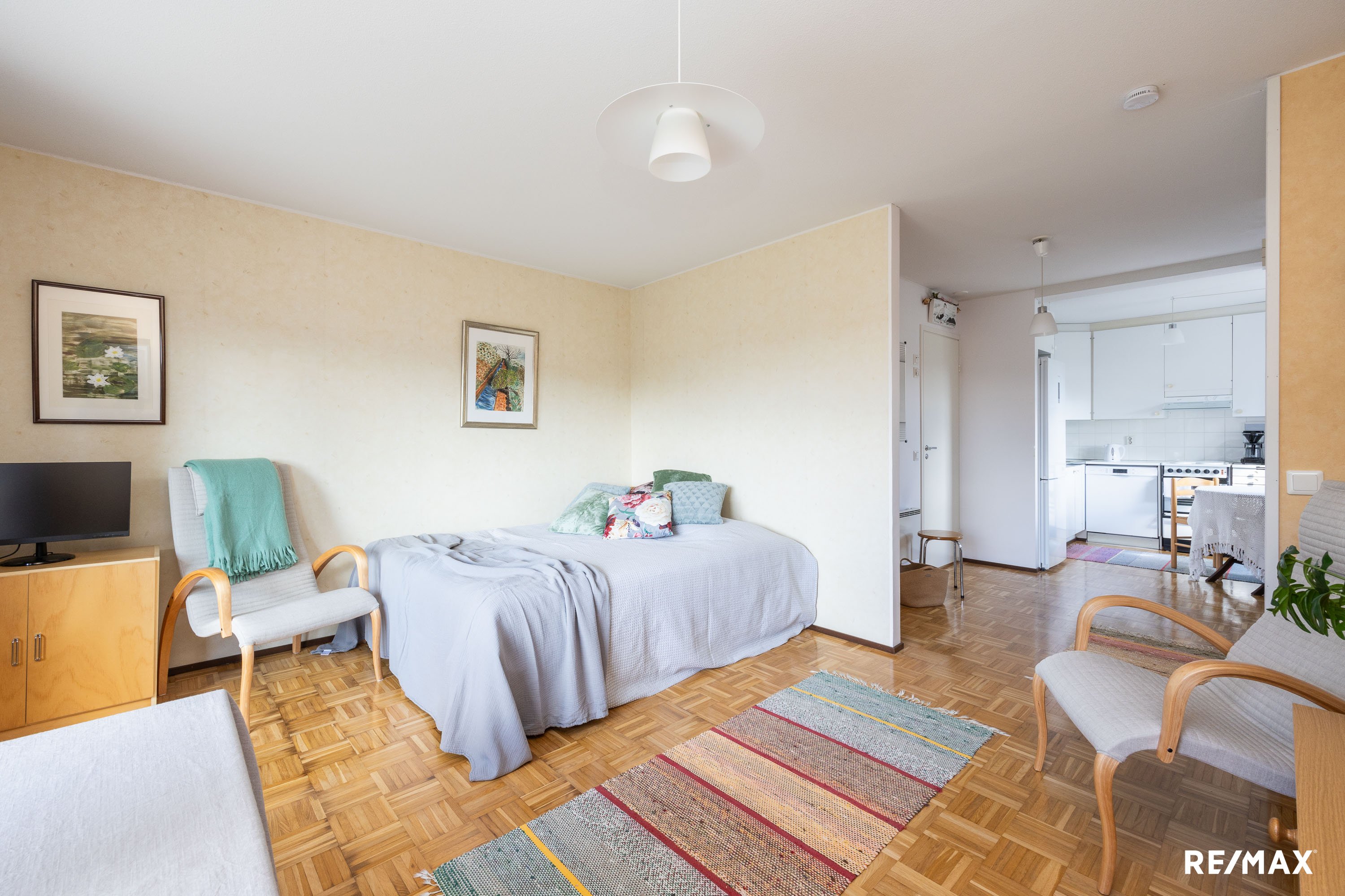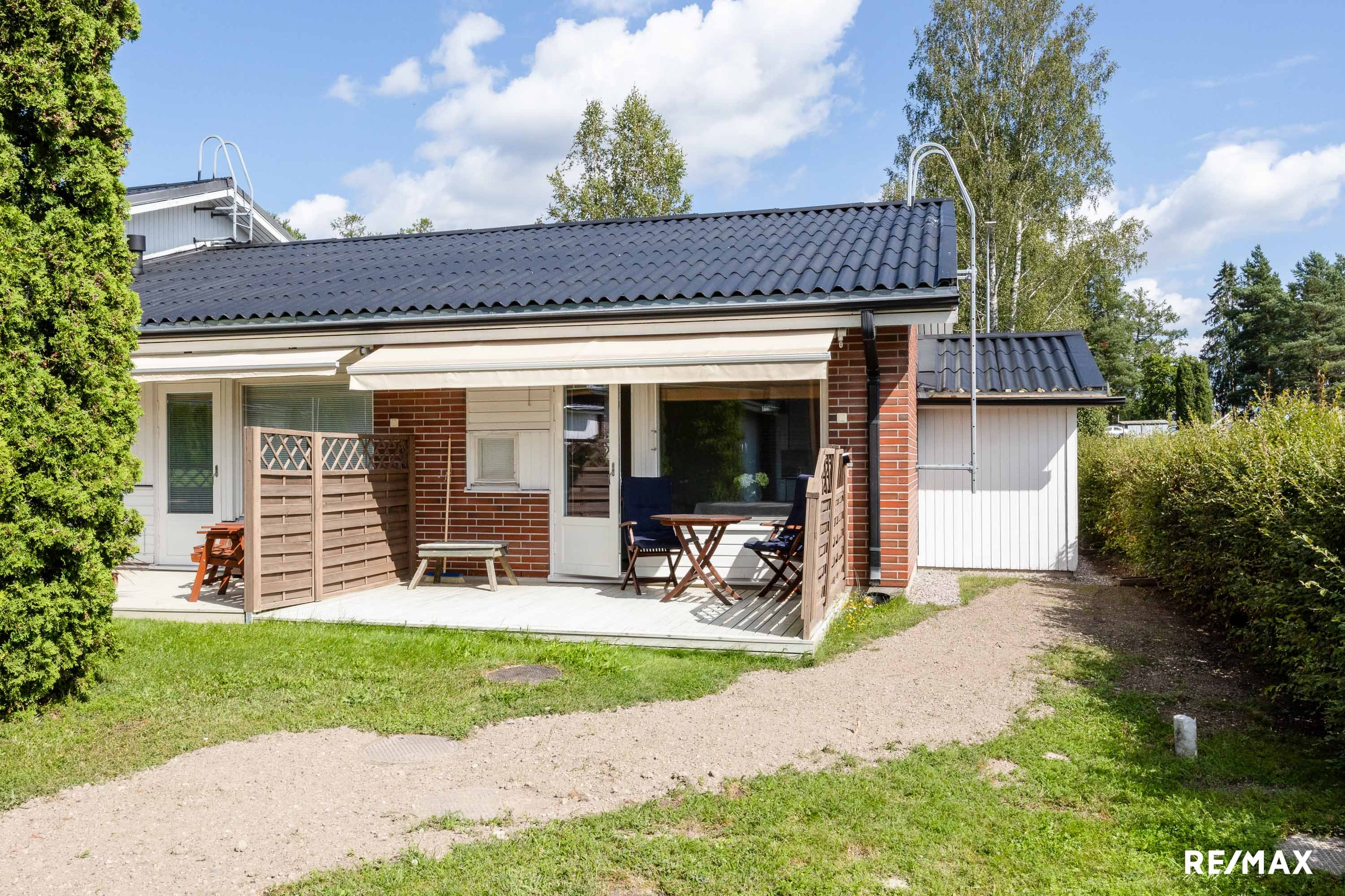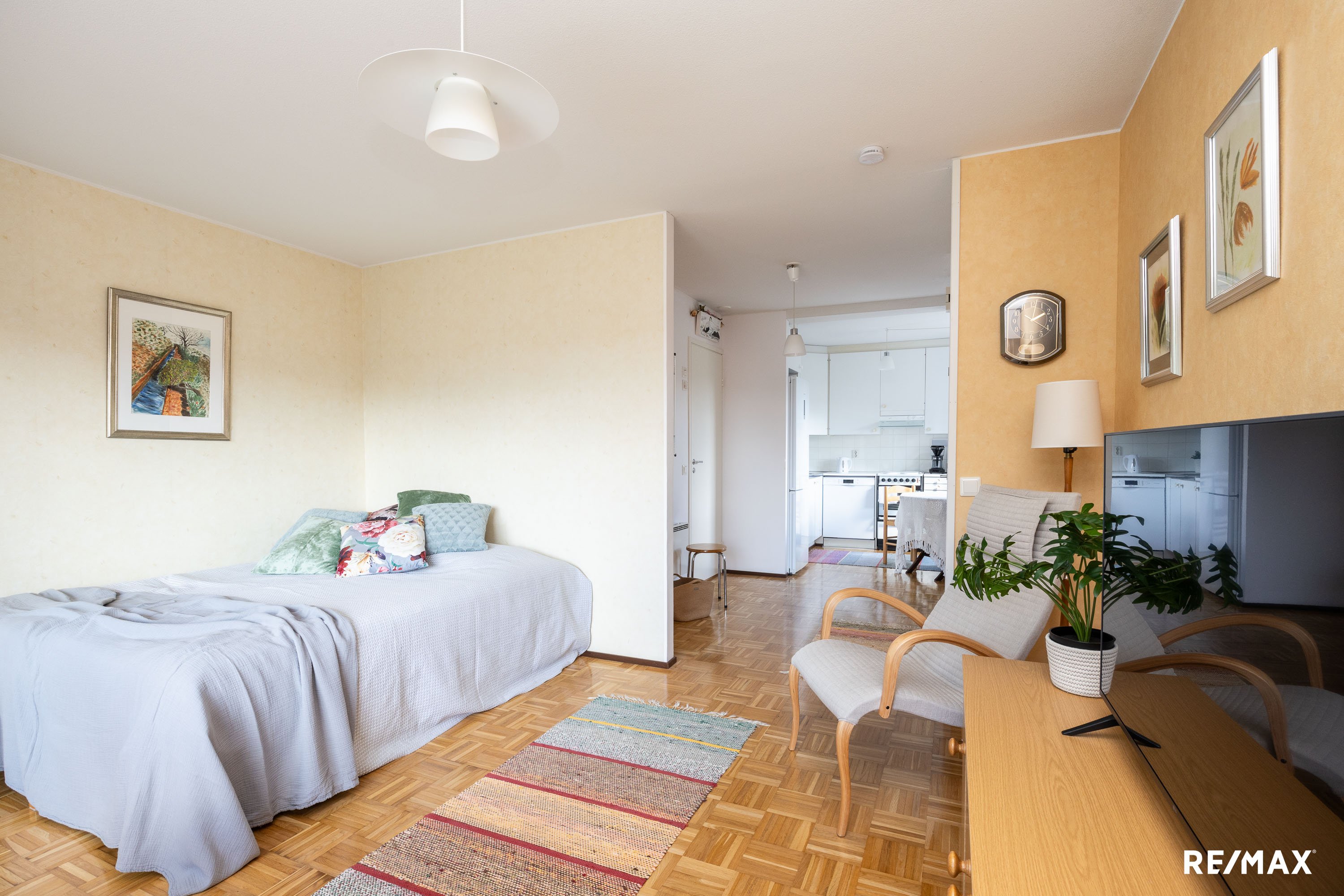 Asunnossa on valoisa olo-/makuuhuone, jonka isosta ikkunasta on vehreä näkymä takapihalle. Takapiha on vihreiden tuijien ja nurmen reunustama helppohoitoinen terassi, jossa auringon kuumilta säteiltä saa suojaa markiisin alla. Keittiöön mahtuu hyvin pieni pöytä. Pesuhuone on kauniisti remontoitu ja saunassa saa hyvät löylyt. Asunnon sisääntulon yhteydessä oleva ulkovarasto on vaatehuoneen lisäksi tarpeellinen säilytystila. Tämä koti on täydellinen valinta yksineläjälle ja kyllä tänne kaksikin saa mahtumaan.