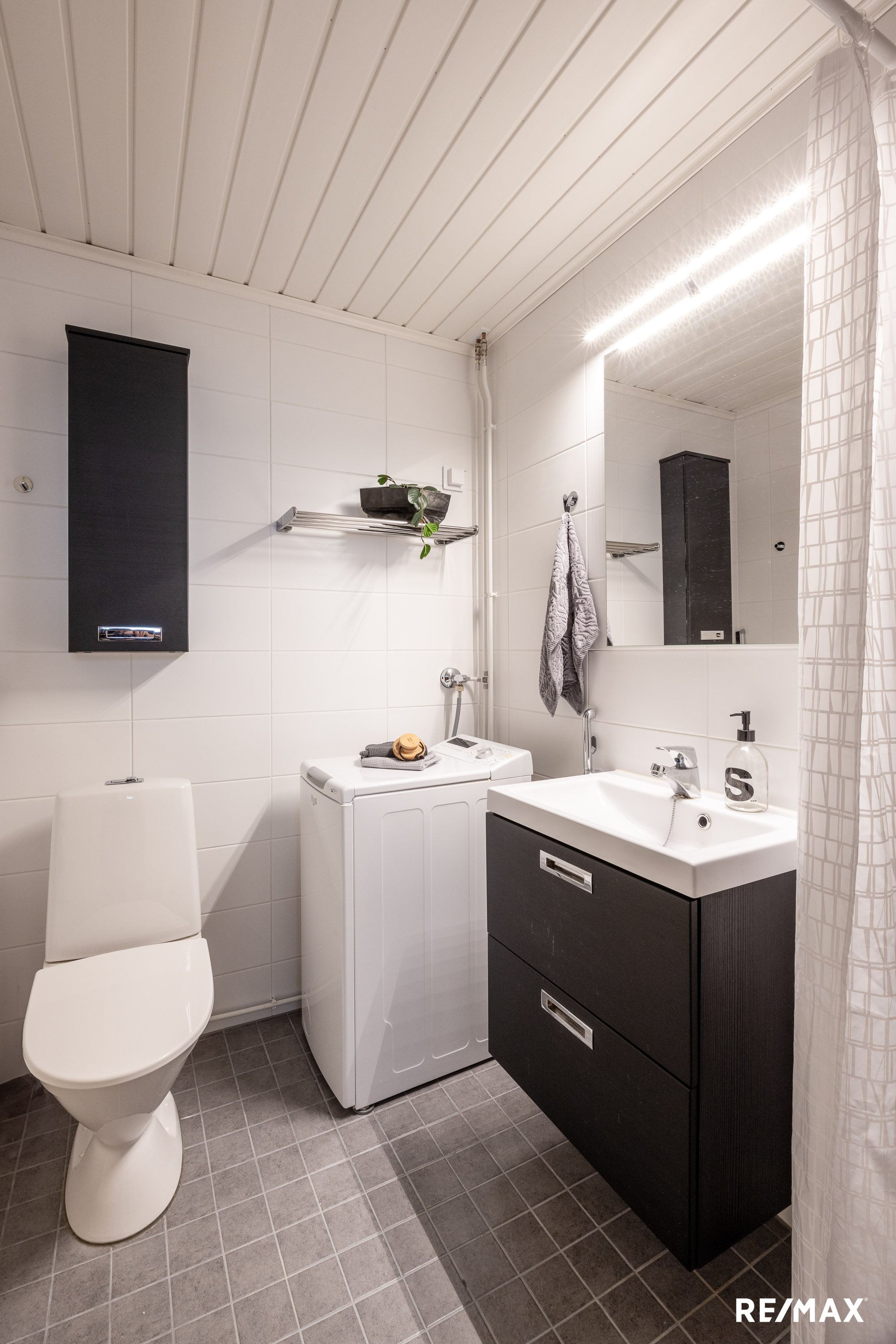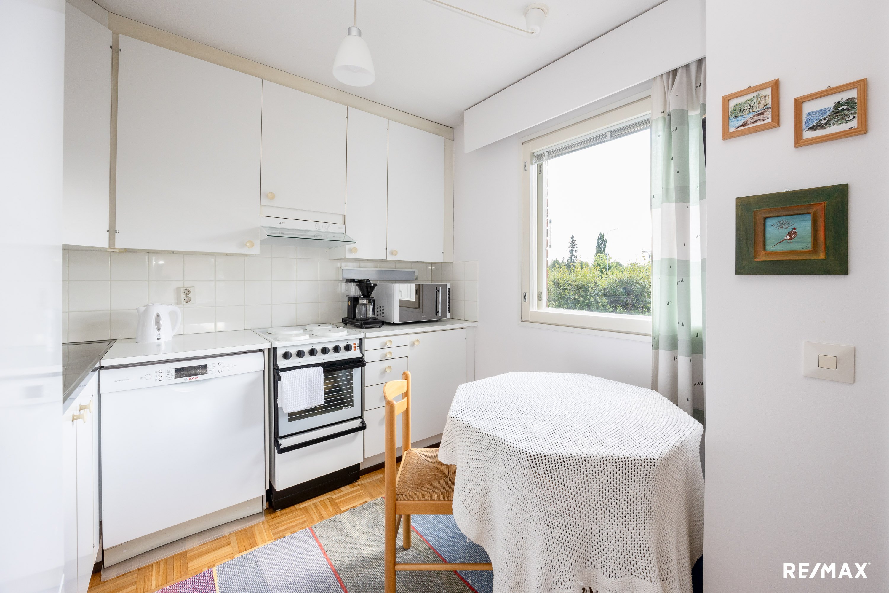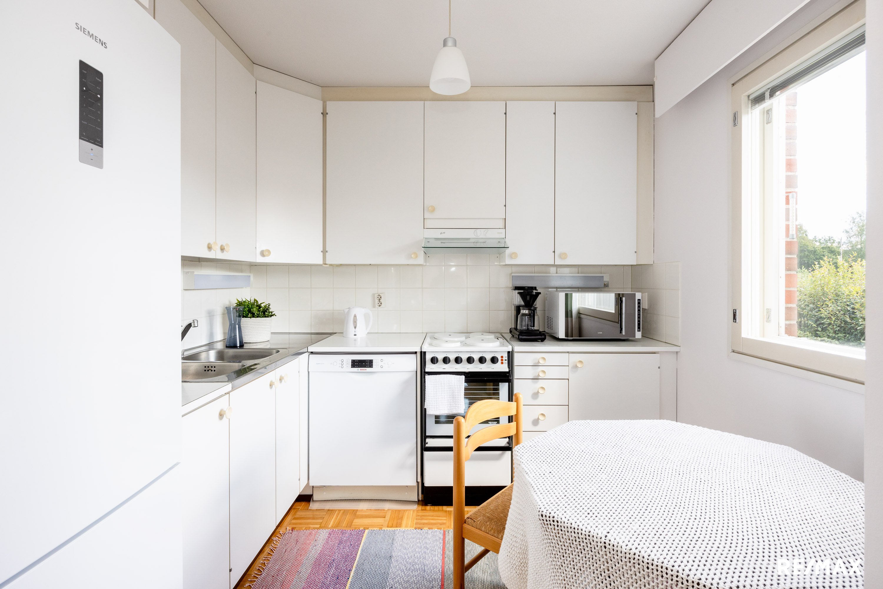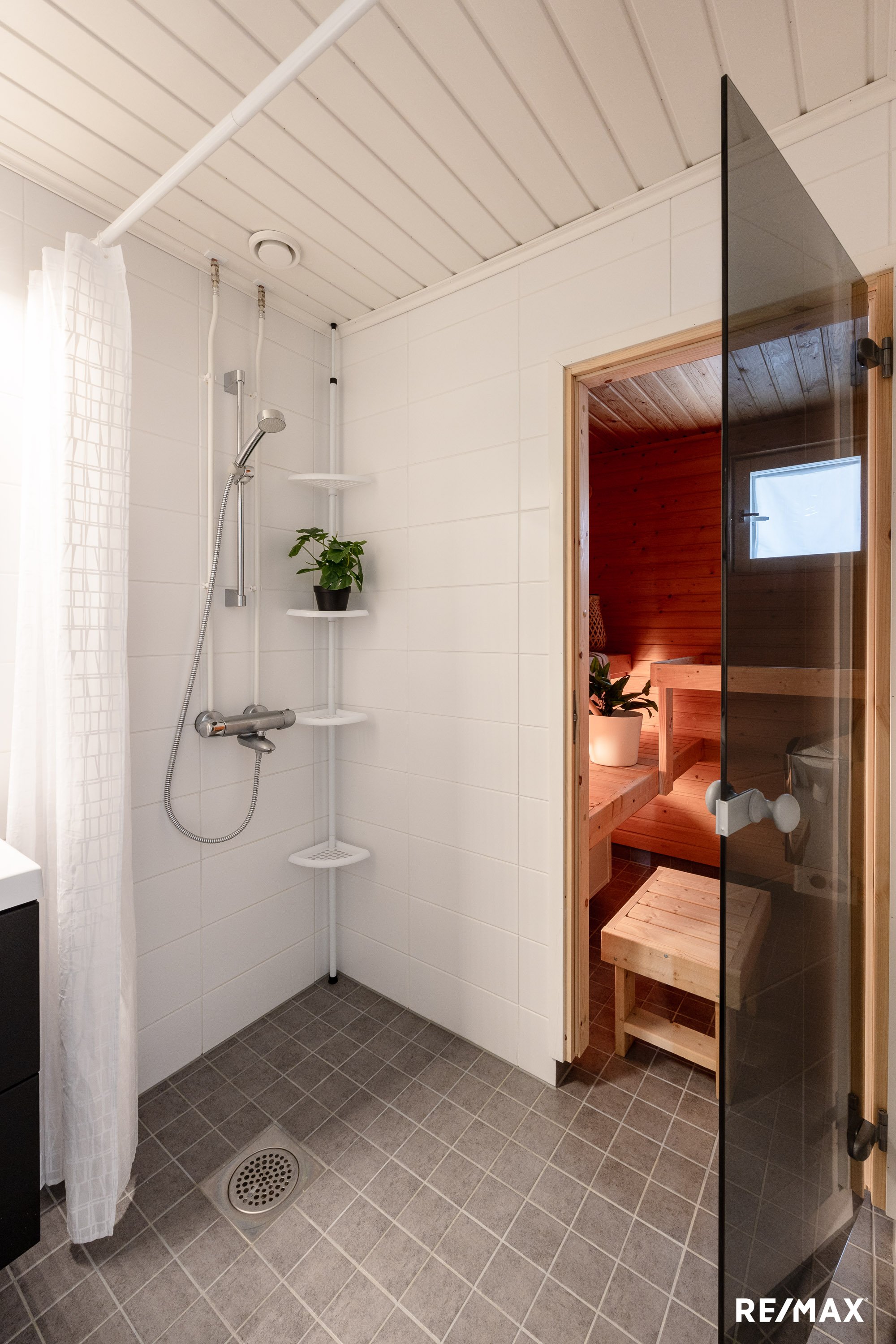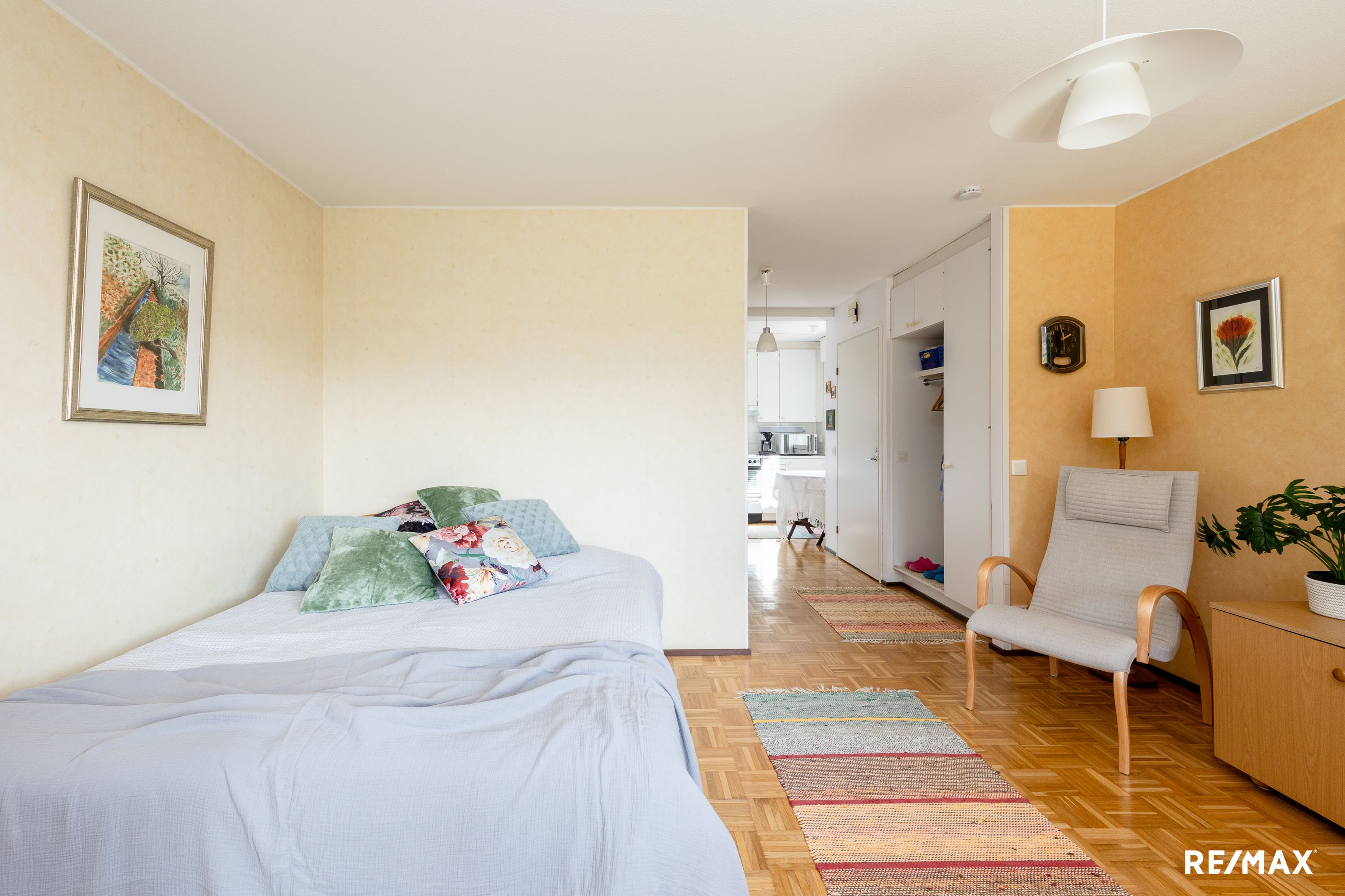 Asunnossa on valoisa olo-/makuuhuone, jonka isosta ikkunasta on vehreä näkymä takapihalle. Takapiha on vihreiden tuijien ja nurmen reunustama helppohoitoinen terassi, jossa auringon kuumilta säteiltä saa suojaa markiisin alla. Keittiöön mahtuu hyvin pieni pöytä. Pesuhuone on kauniisti remontoitu ja saunassa saa hyvät löylyt. Asunnon sisääntulon yhteydessä oleva ulkovarasto on vaatehuoneen lisäksi tarpeellinen säilytystila. Tämä koti on täydellinen valinta yksineläjälle ja kyllä tänne kaksikin saa mahtumaan.