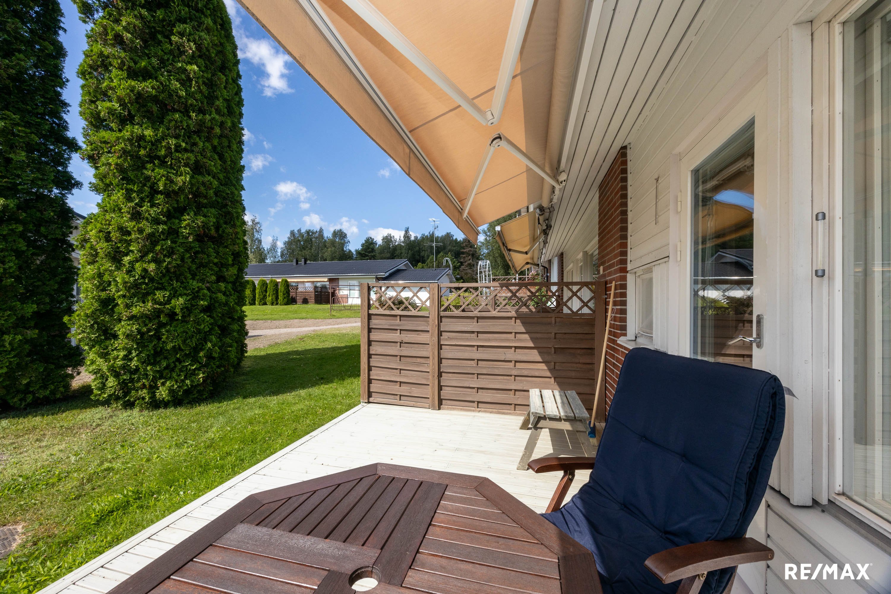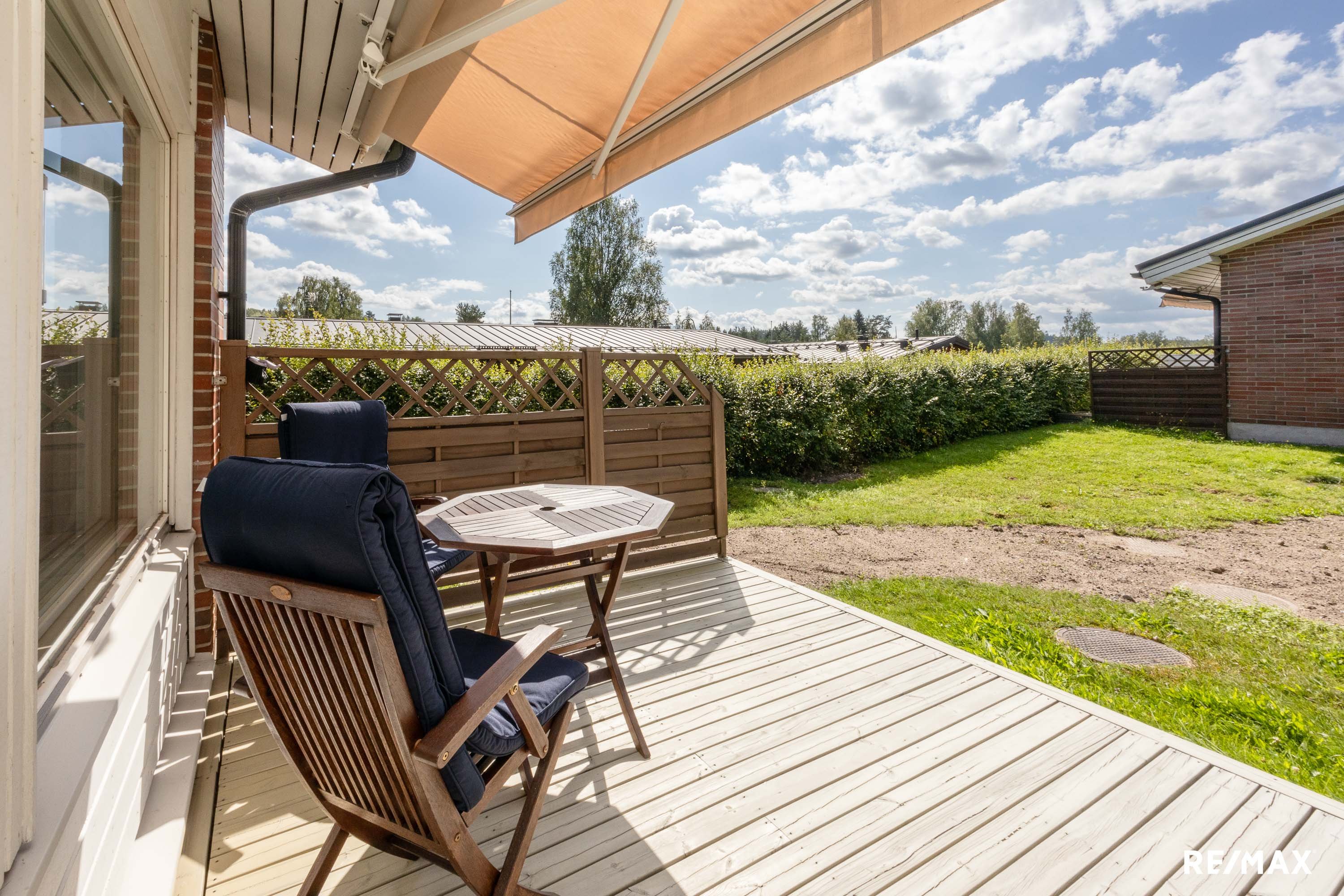 Kesää voi viettää aurinkoterassilla ja asunnon hallintaan kuuluu myös talvisin tarpeellinen pistokepaikka.
