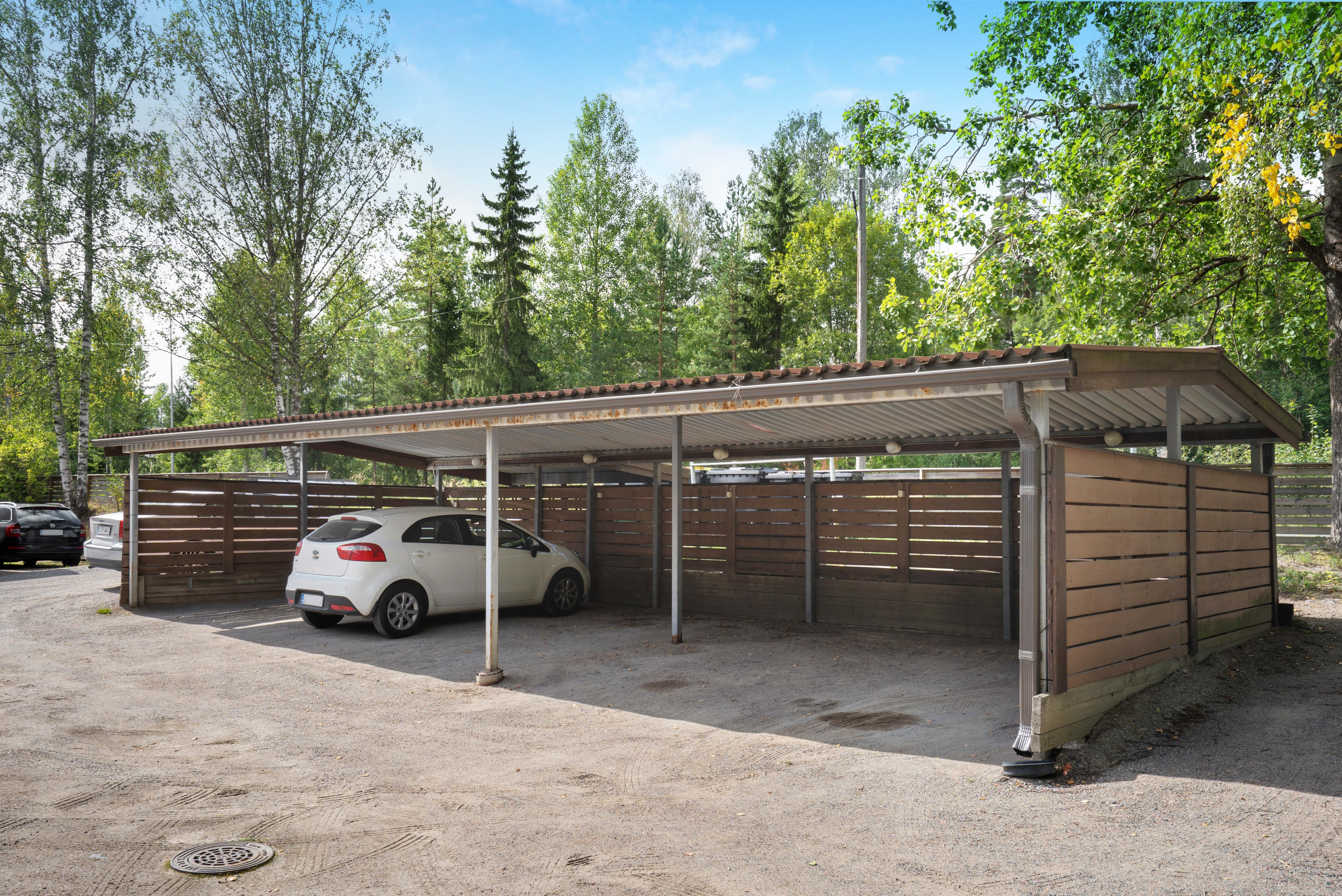 Yhteensä 12 autopaikkaa: 10 lämmitystolpallista autopaikkaa katoksessa, yksi lämmitystolpallinen paikka ja yksi kylmä paikka. Taloyhtiössä jokaiselle huoneistolle kuuluu 1 autokatospaikka ja joka vuosi syyskuussa arvotaan mahdollisuus toiseen autopaikkaan. Autopaikat eivät aiheuta kuluja.