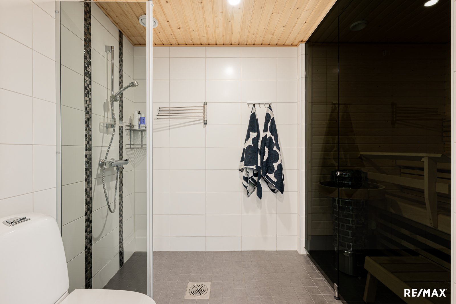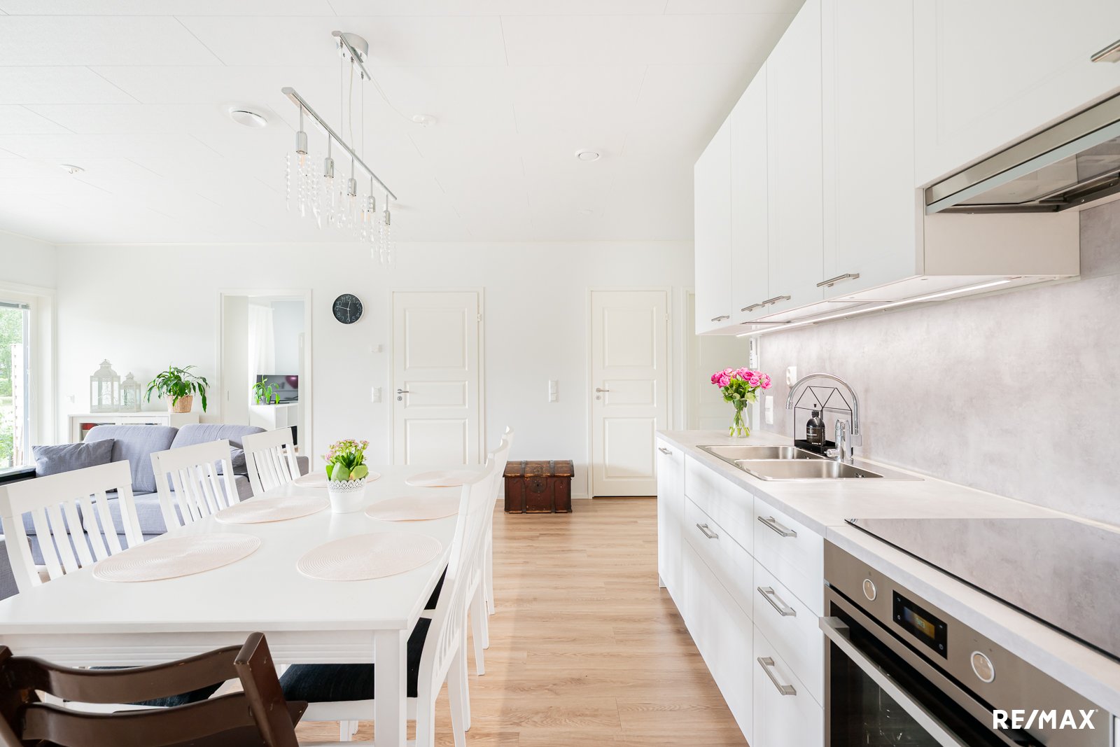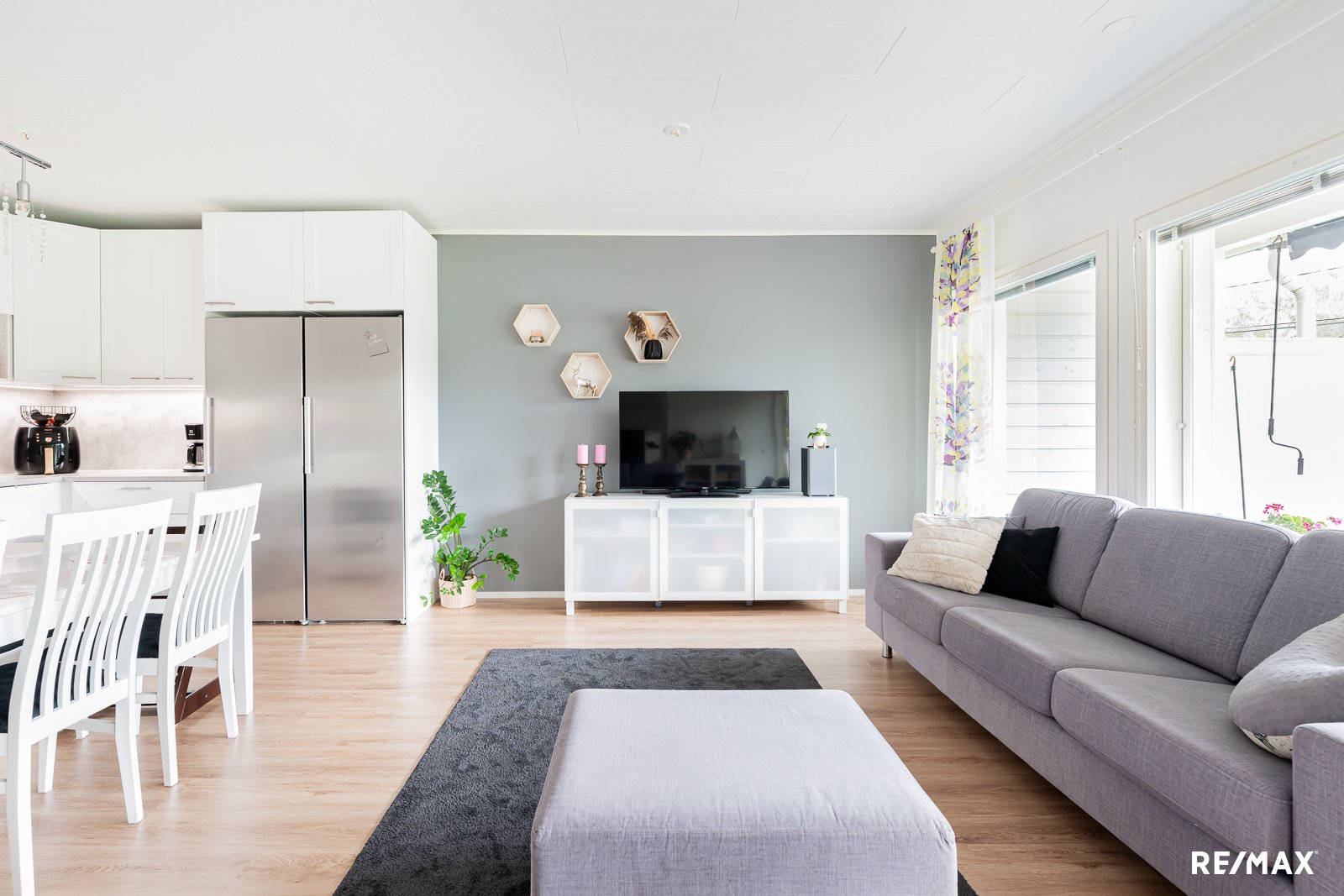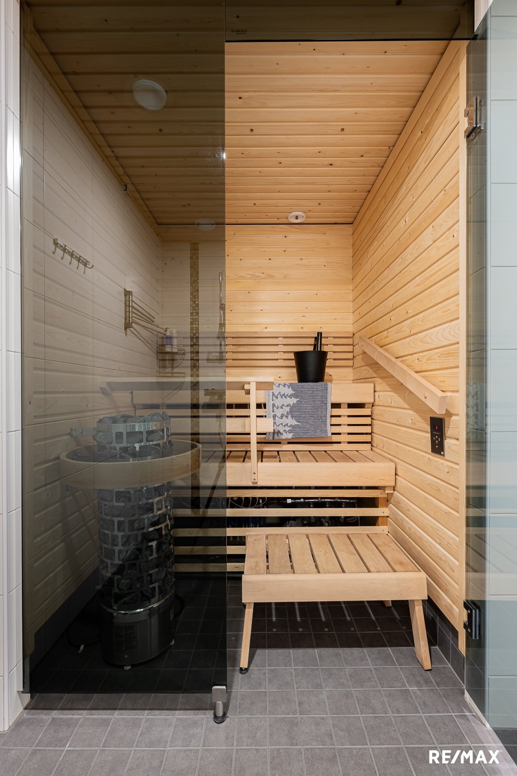 Kodin tyylikäs keittiö on varustettu nykyaikaisilla laitteilla, ja olohuoneen suuret ikkunat tuovat runsaasti luonnonvaloa sisään. Makuuhuoneissa on liukuovikaapistot, jotka tarjoavat runsaasti säilytystilaa. Kylpyhuone ja erillinen wc on sisustettu laadukkailla materiaaleilla, ja omassa saunassa voit rentoutua sähköisen pilarikiukaan lempeässä lämmössä.