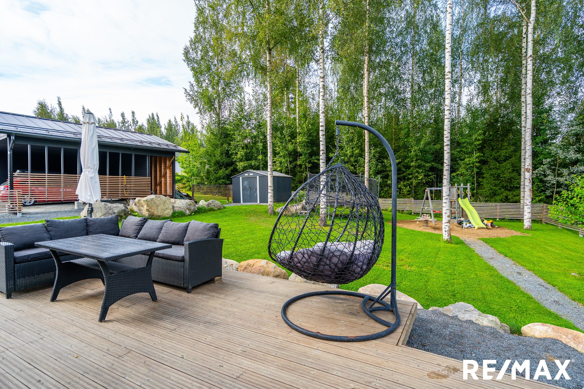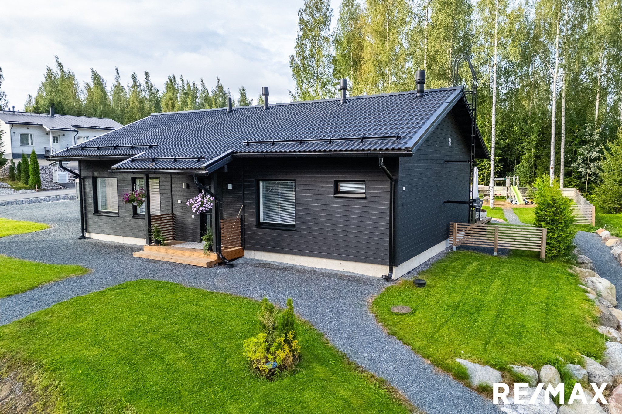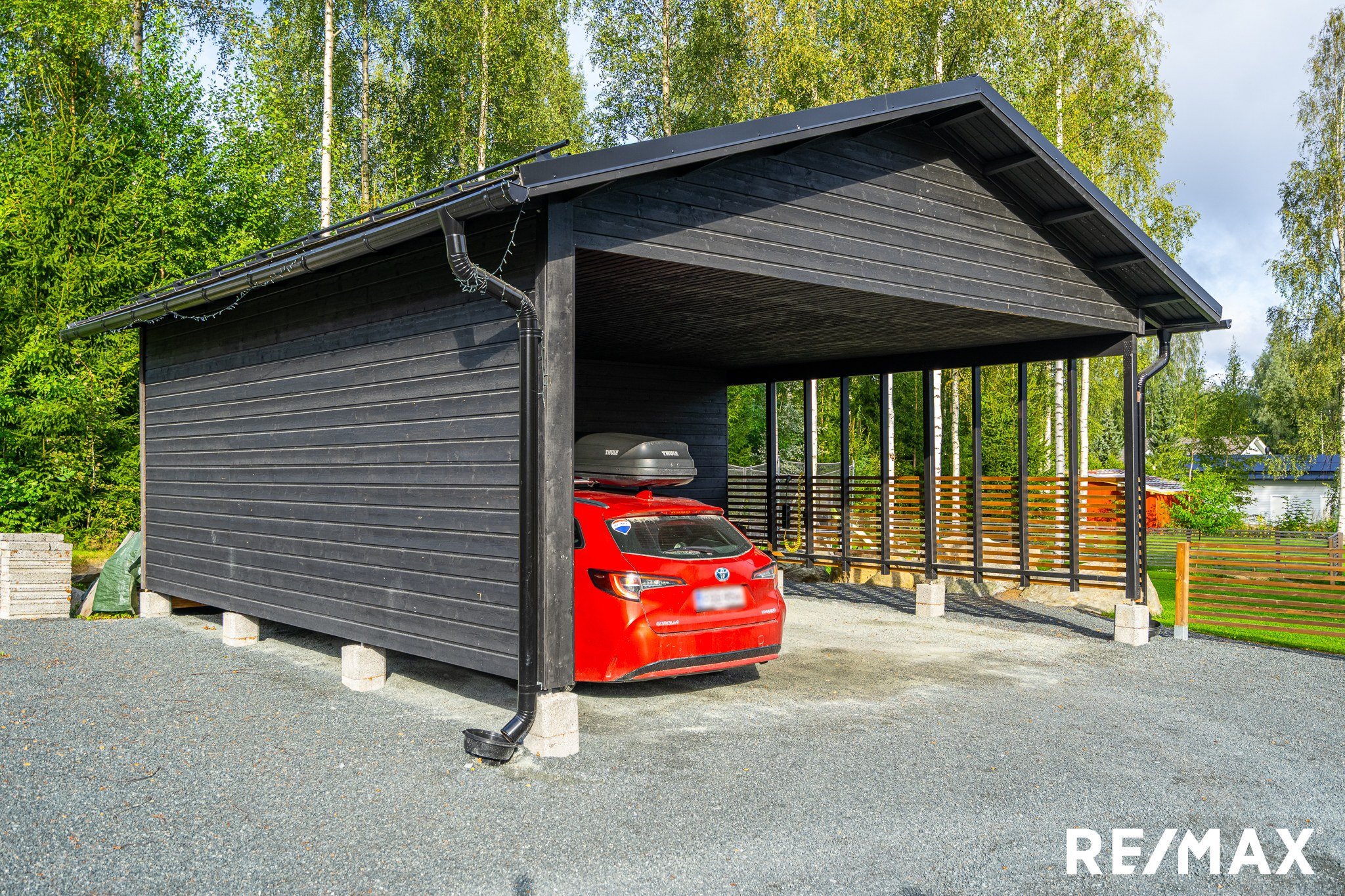 Tässä kodissa on kolme makuuhuonetta, valoisa ja avara keittiö/olohuone, josta aukeaa näkymä suojaisalle pihalle, jossa lapsille oma leikkialue. Pihan nurmikkoalueet ja muutamat puut luovat täydellisen ympäristön rentoutumiseen ja lasten leikkeihin. Kahdelle autolle tilava autokatos sähköauton latausmahdollisuudella.