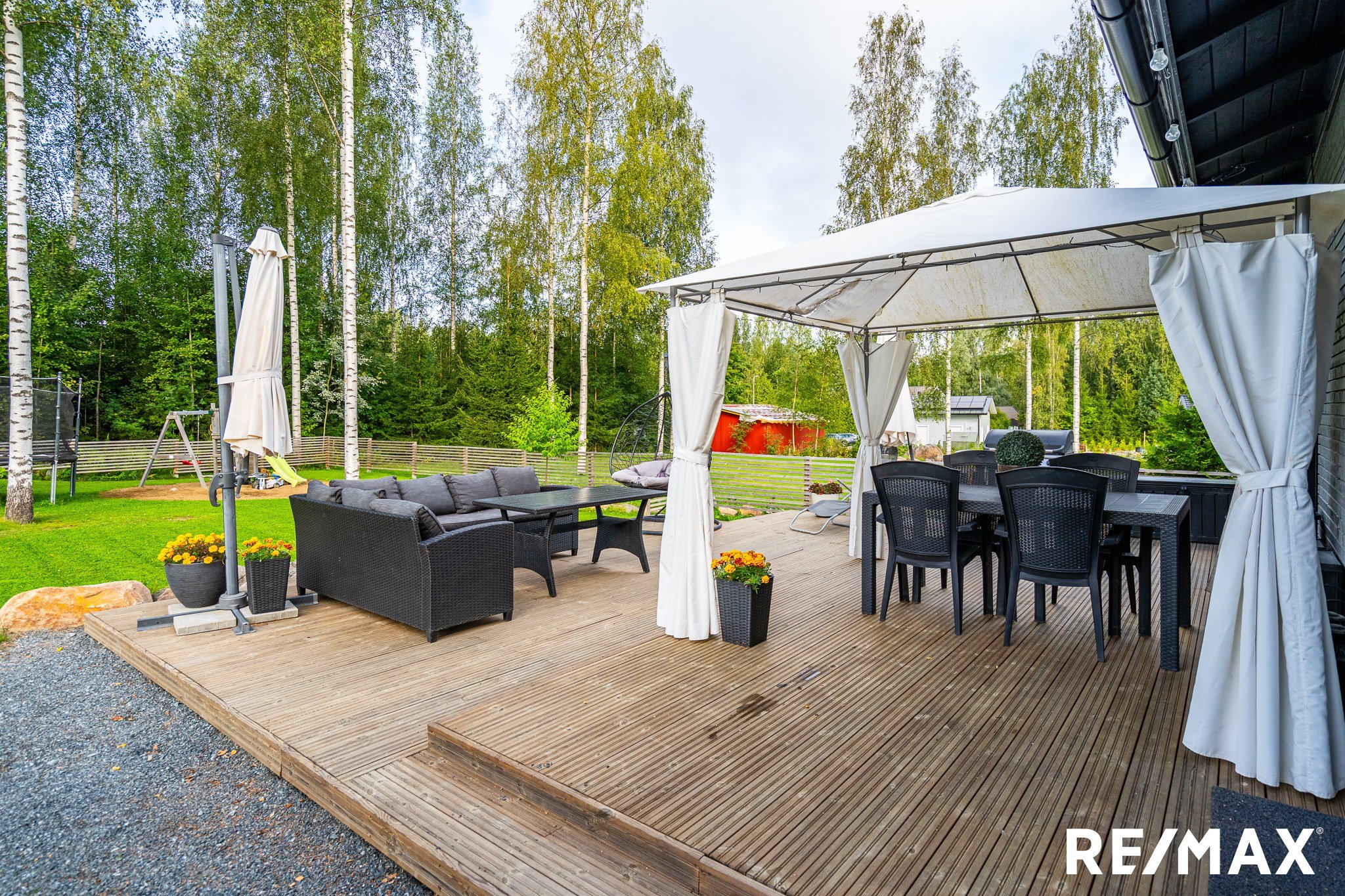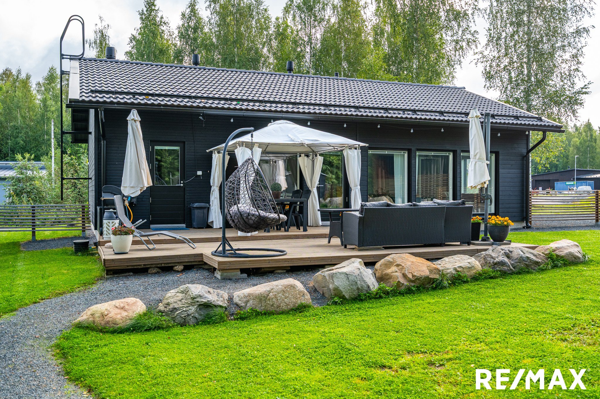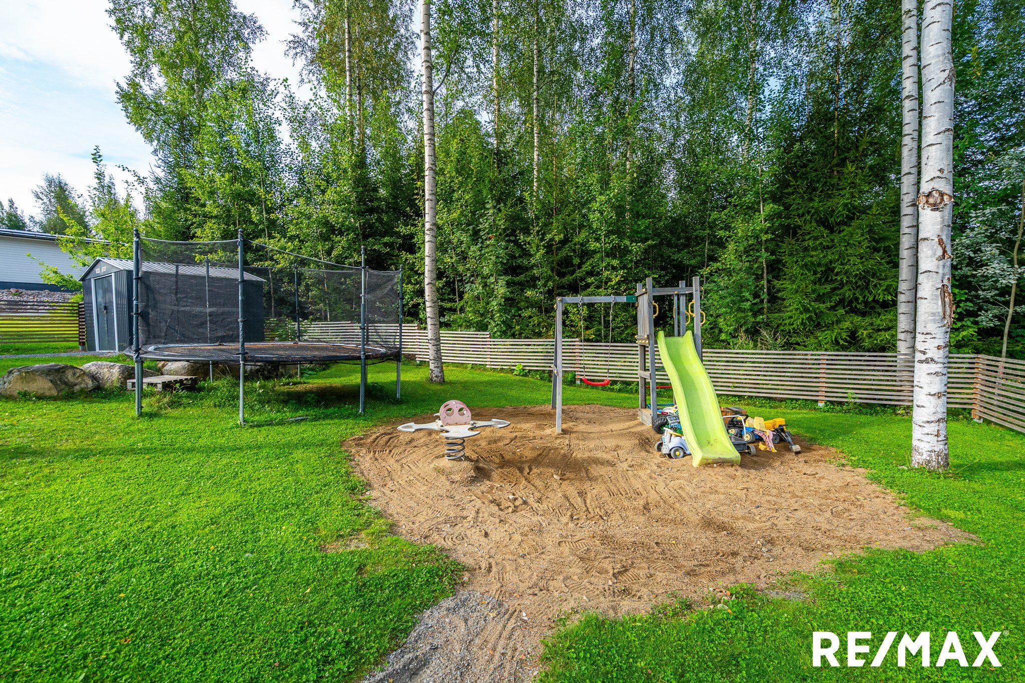 Tässä kodissa on kolme makuuhuonetta, valoisa ja avara keittiö/olohuone, josta aukeaa näkymä suojaisalle pihalle, jossa lapsille oma leikkialue. Pihan nurmikkoalueet ja muutamat puut luovat täydellisen ympäristön rentoutumiseen ja lasten leikkeihin. Kahdelle autolle tilava autokatos sähköauton latausmahdollisuudella.