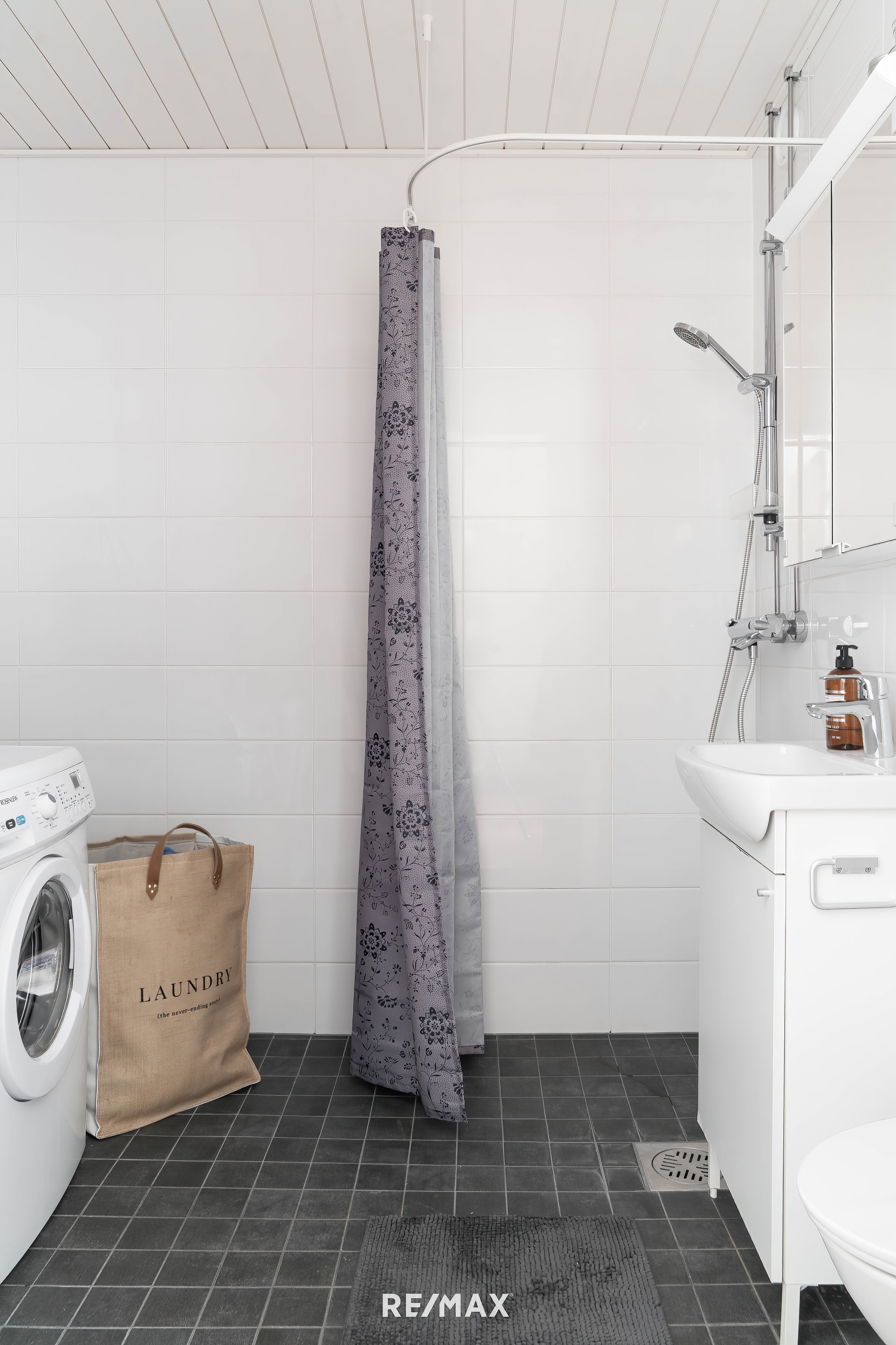 Pesukoneliitäntä, wc-istuin, peilikaappi, suihku, pesuallas ja allaskaappi