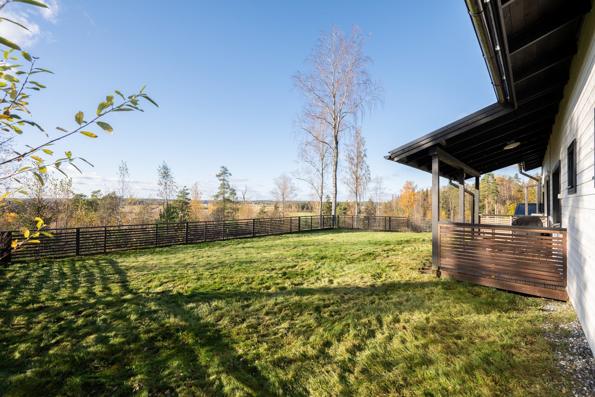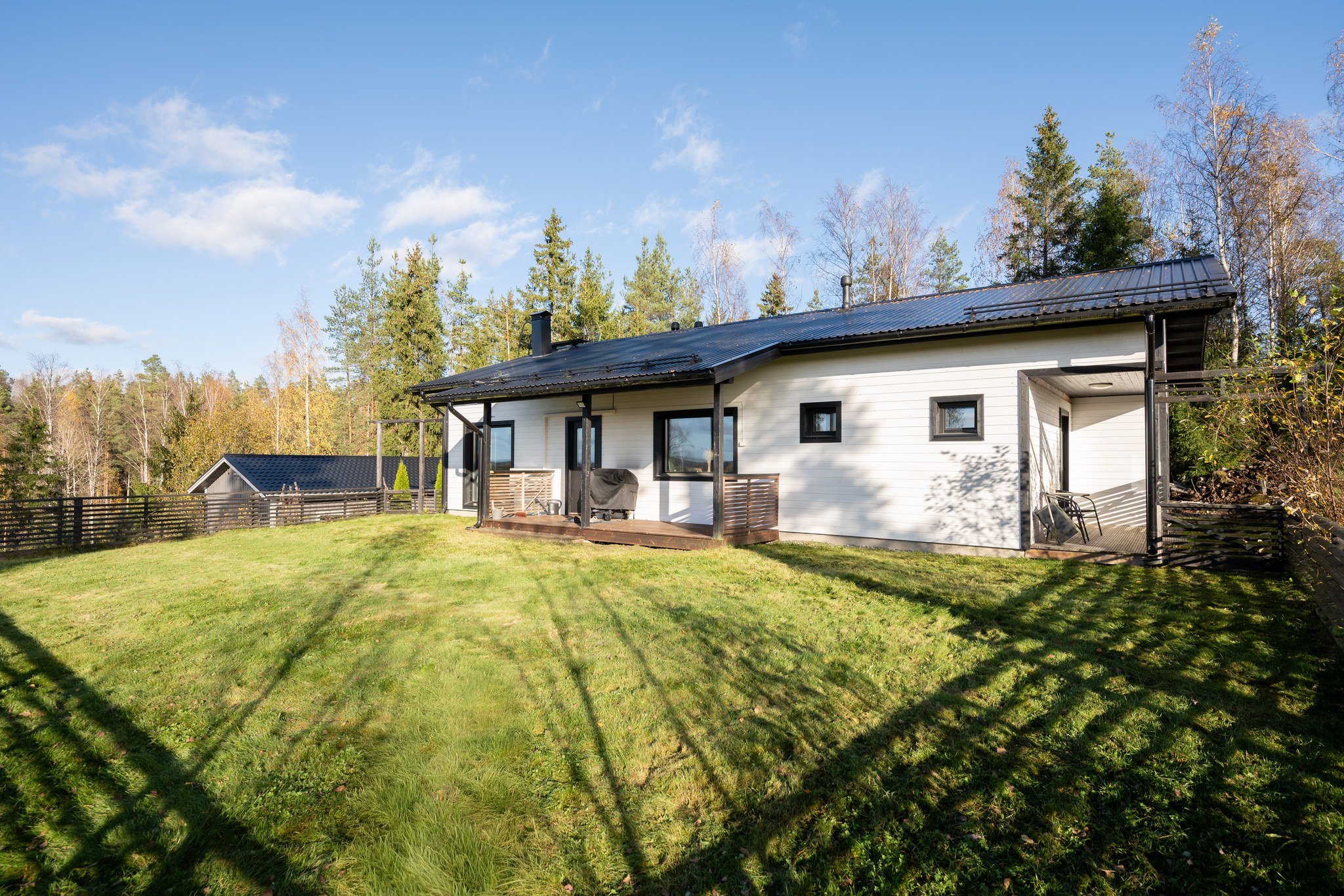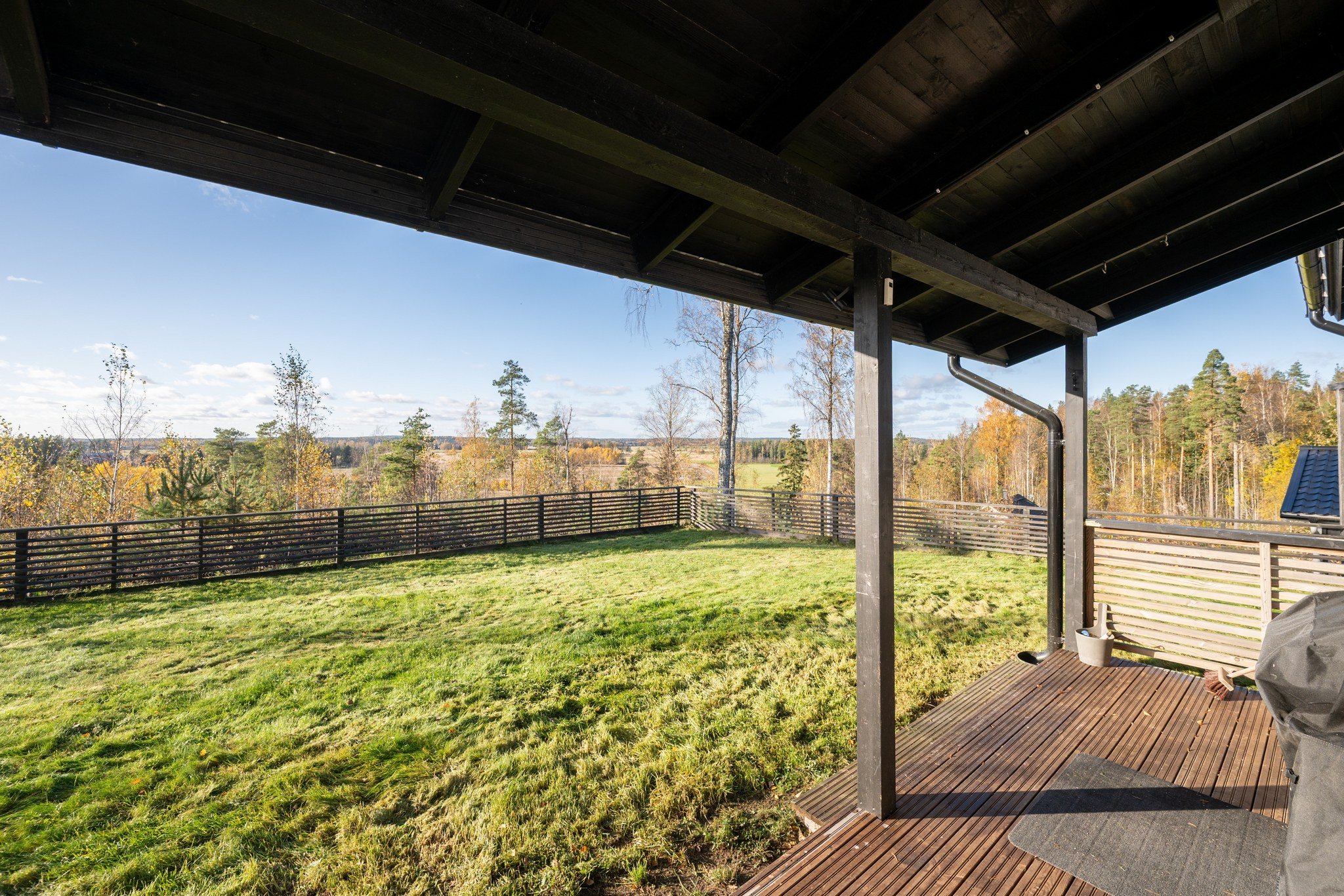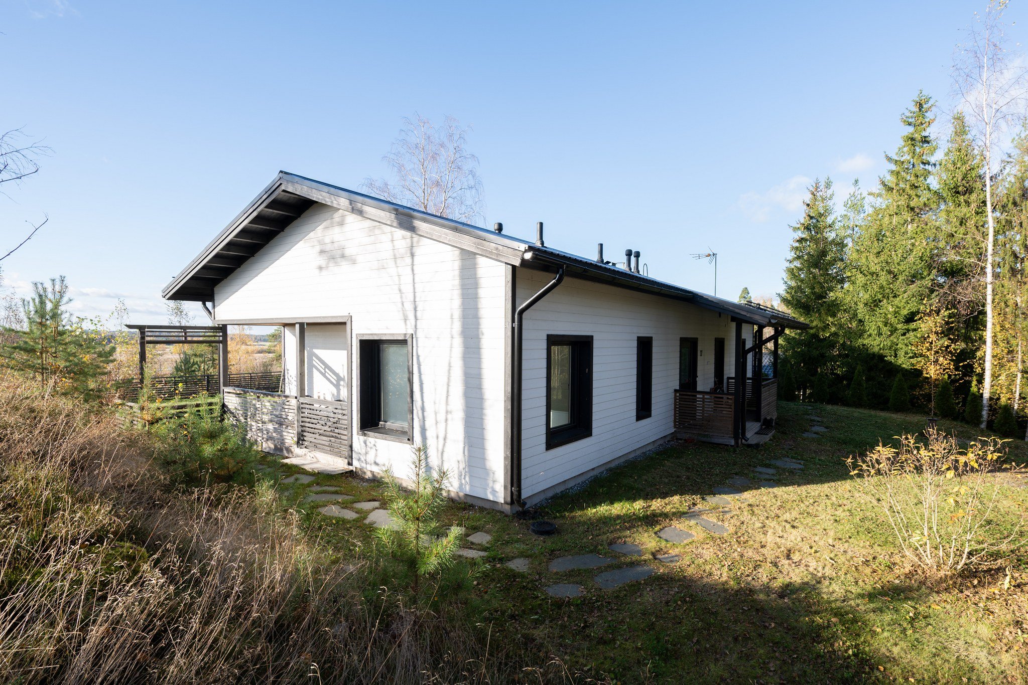 Takapihan aidattu nurmialue tarjoaa turvallisen leikkipaikan lapsille tai lemmikeille. Katettu terassi on täydellinen paikka nauttia aamukahvista tai illallisesta ulkona. Talo on rakennettu kallion päälle, mistä upeat maisemat joka suuntaan.