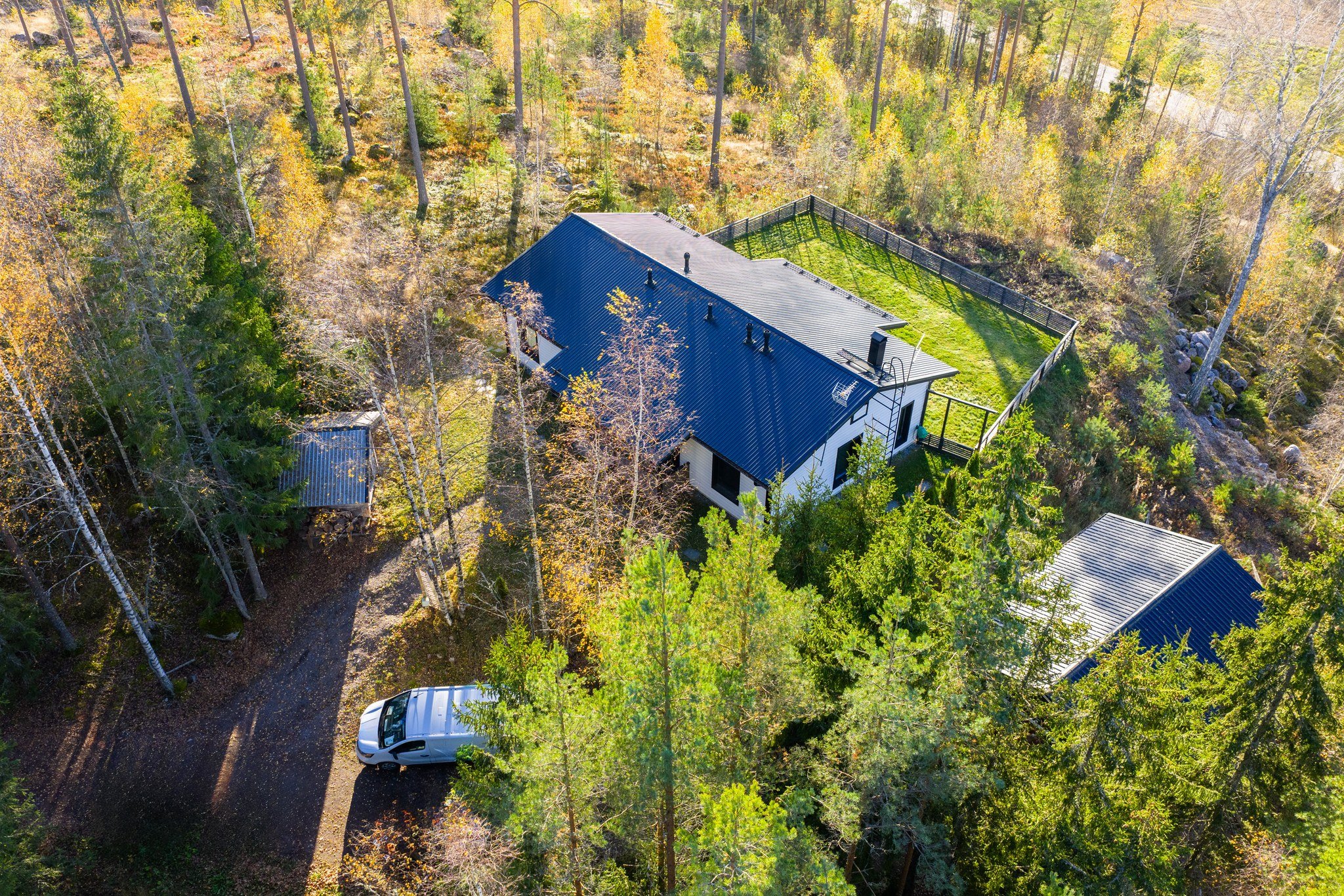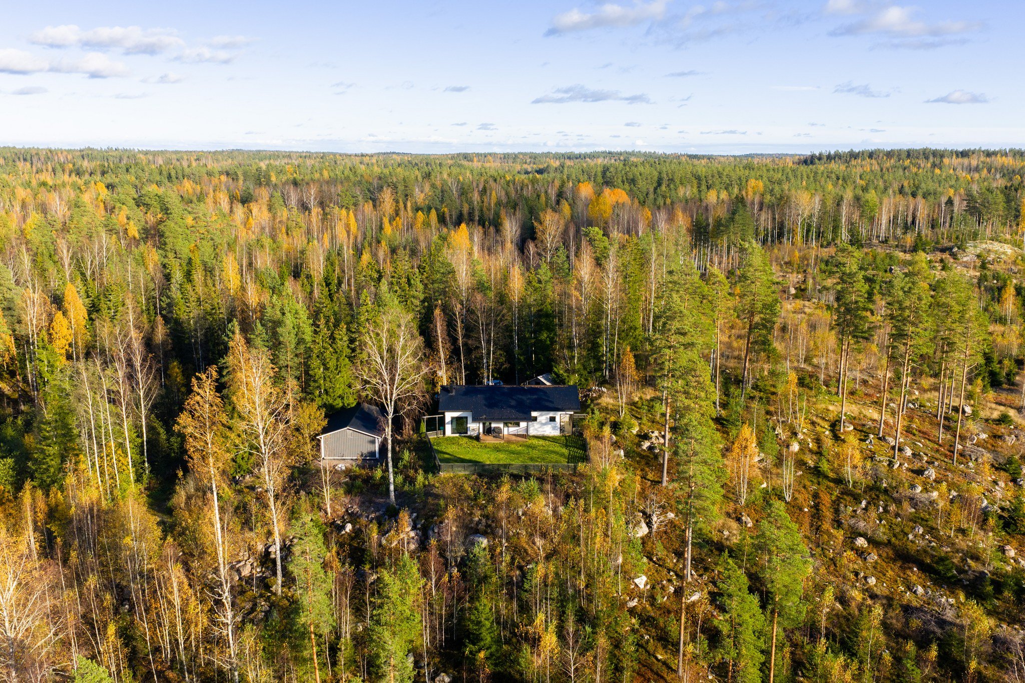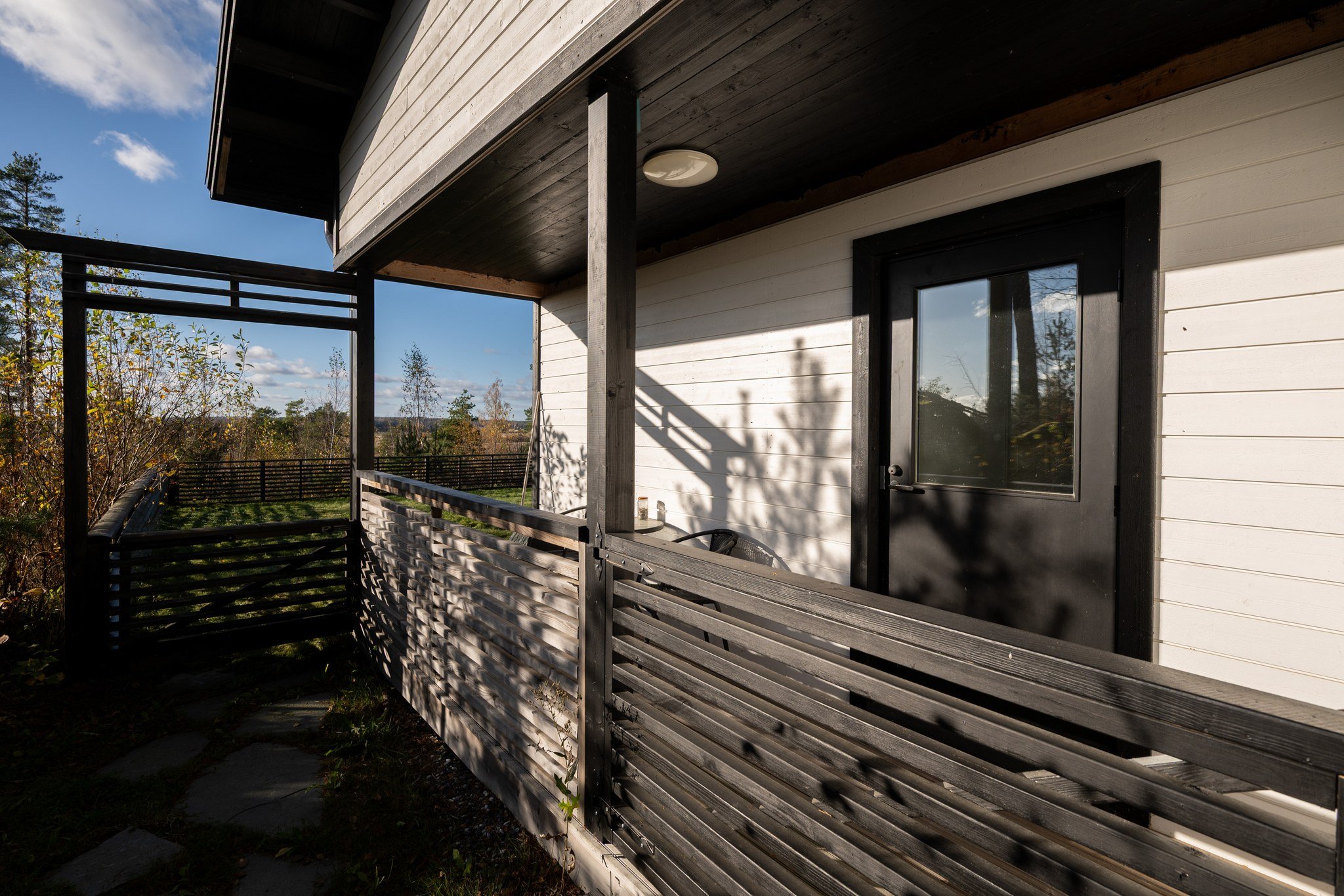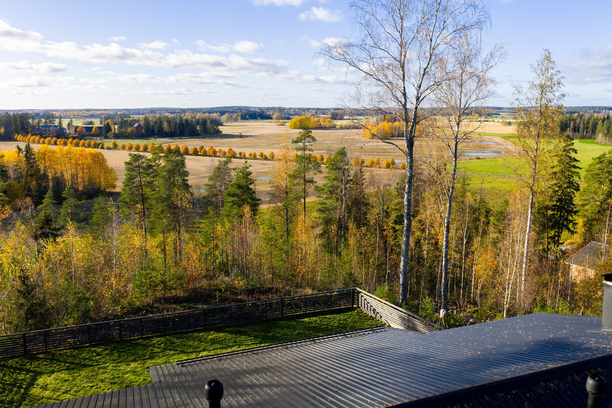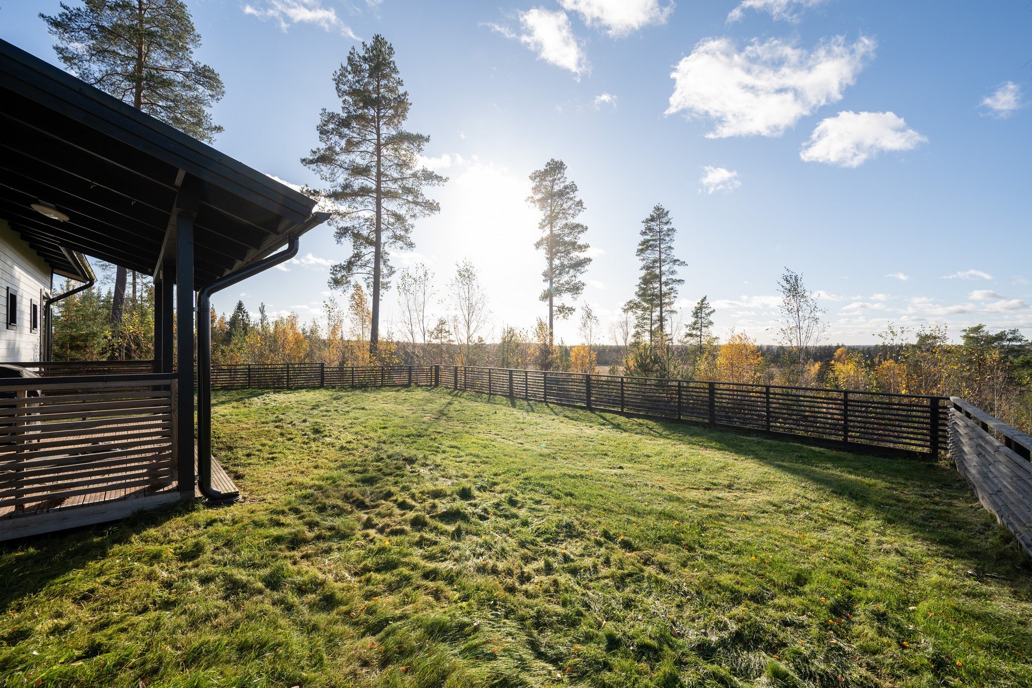 Takapihan aidattu nurmialue tarjoaa turvallisen leikkipaikan lapsille tai lemmikeille. Katettu terassi on täydellinen paikka nauttia aamukahvista tai illallisesta ulkona. Talo on rakennettu kallion päälle, mistä upeat maisemat joka suuntaan.