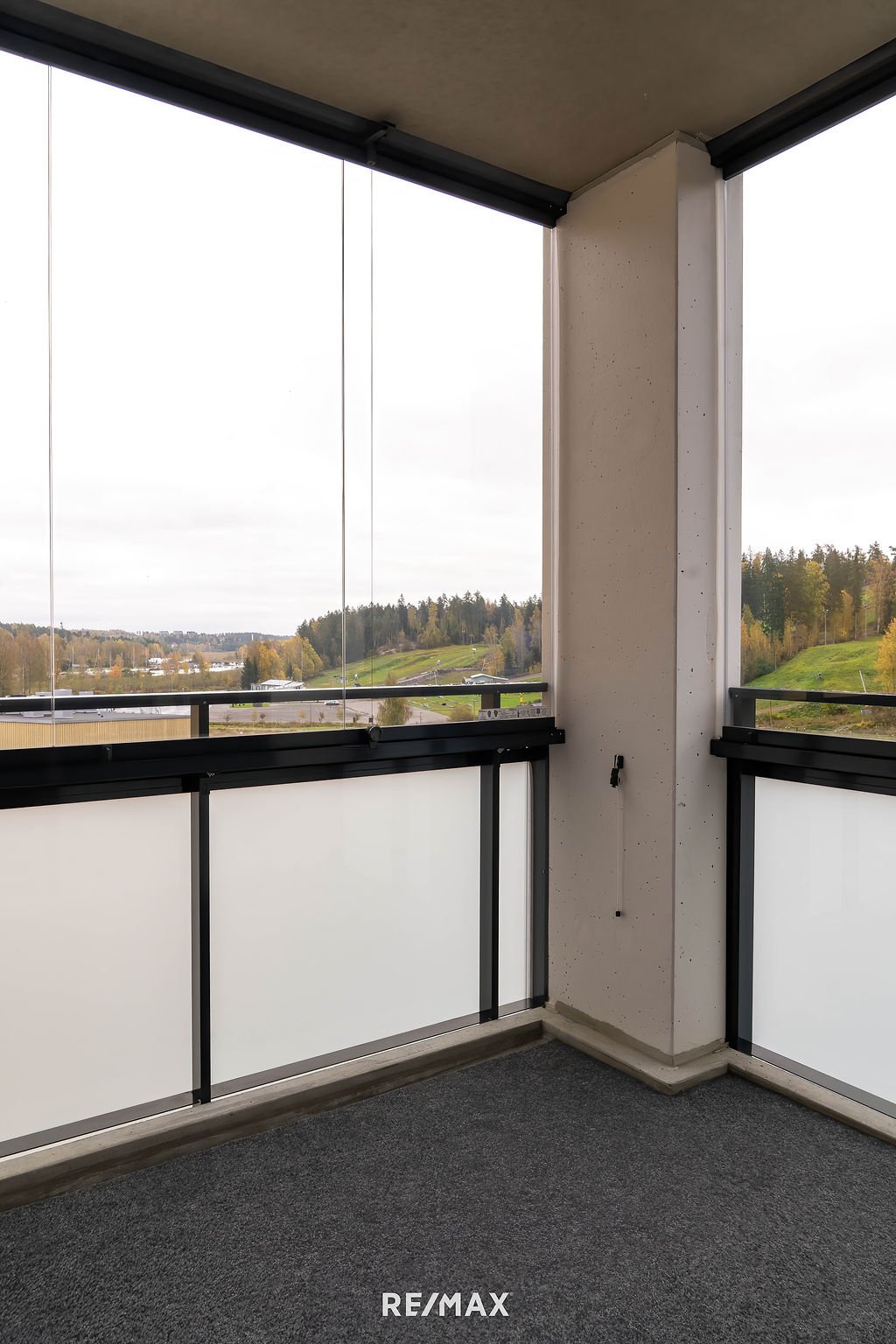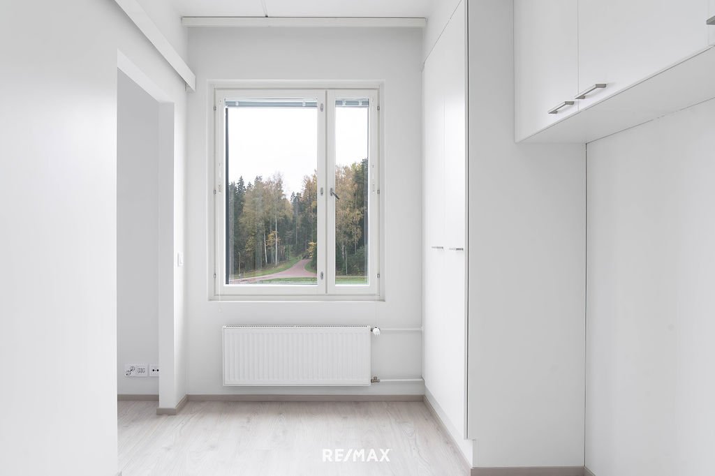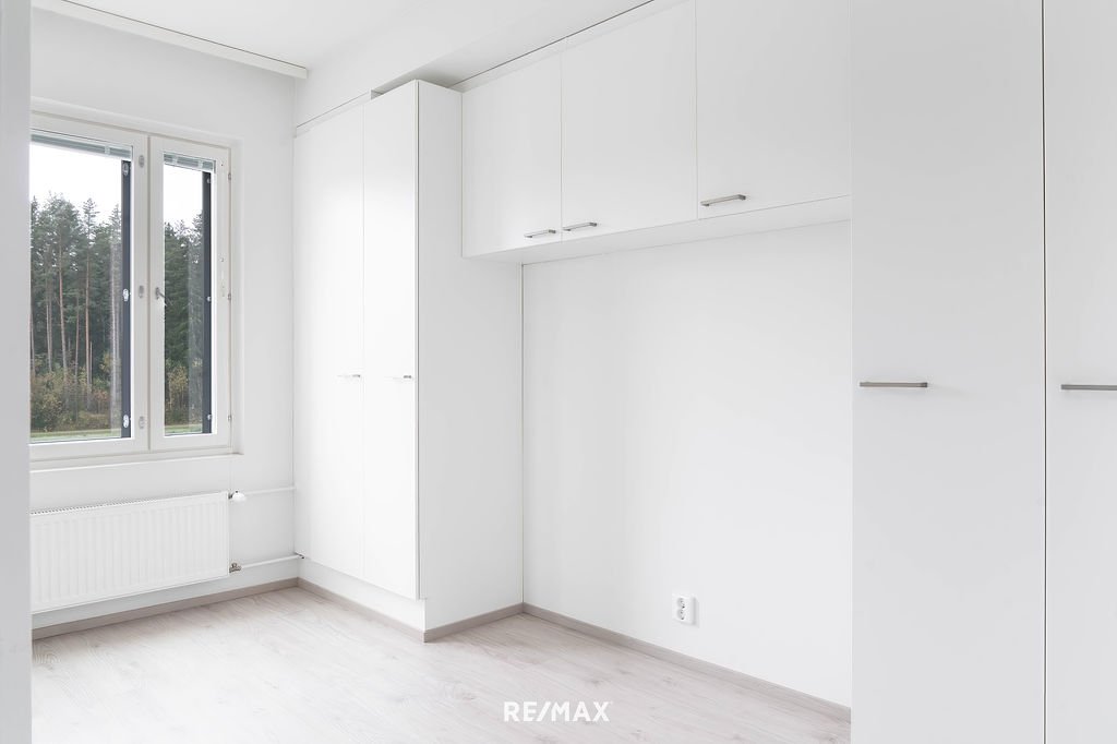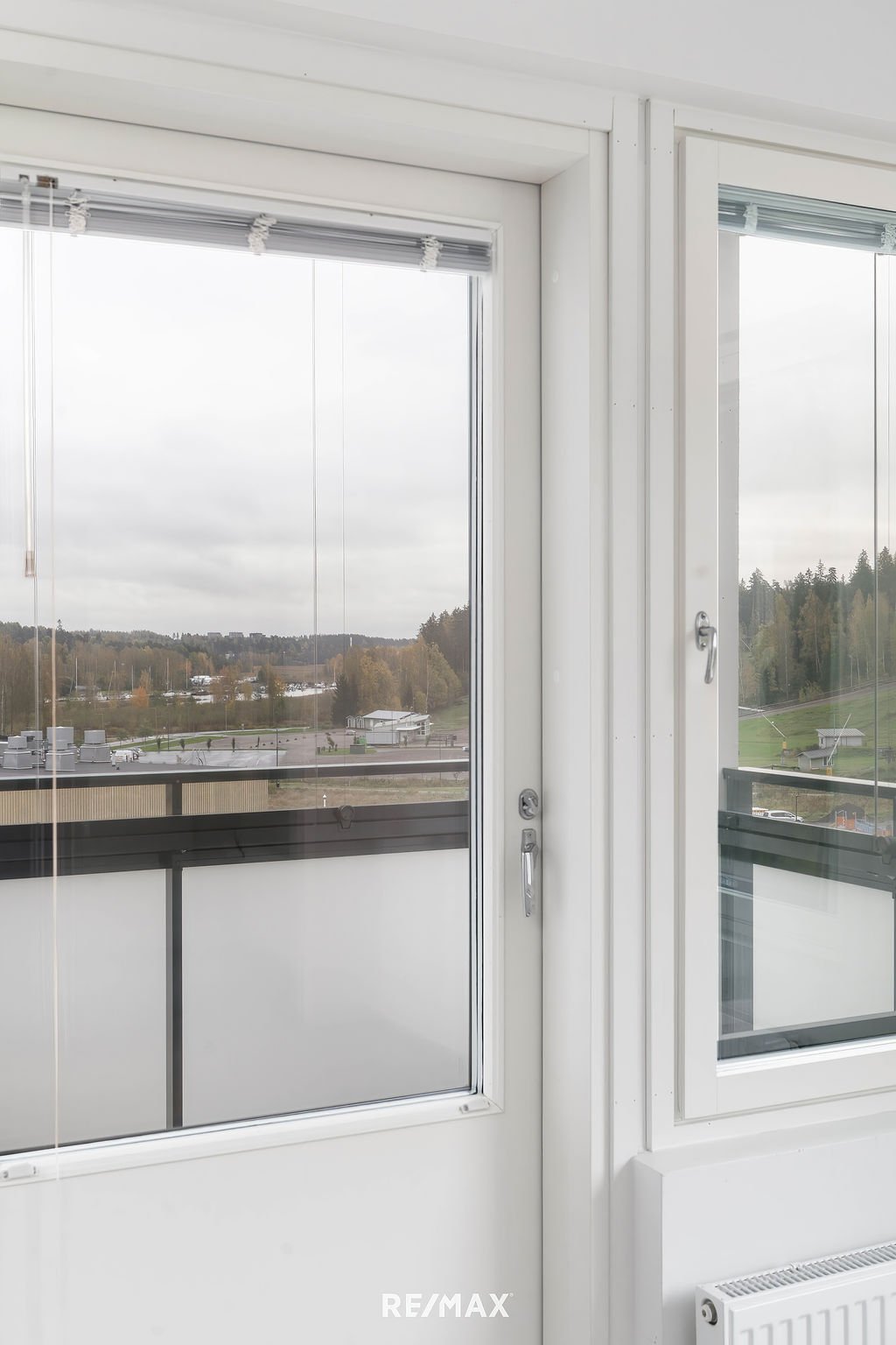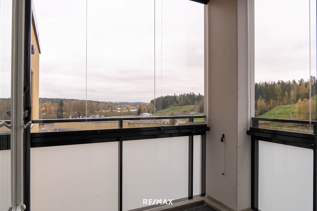 Makuuhuone on kompakti mutta valoisa, ja sieltä avautuvat näkymät Kokonniemen suuntaan. Lasitettu parveke tarjoaa viihtyisän lisätilan, jossa voi nauttia maisemista ympäri vuoden.