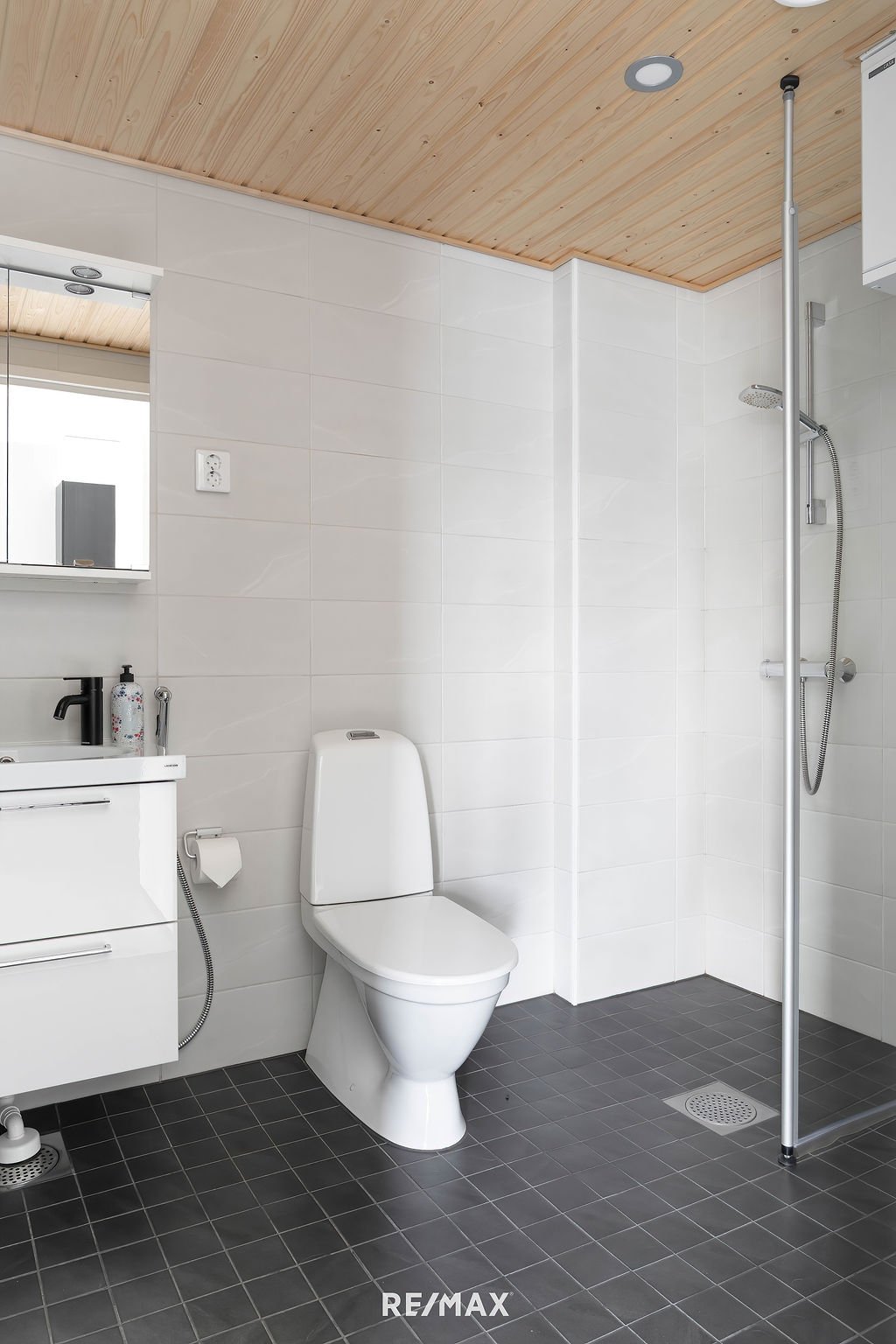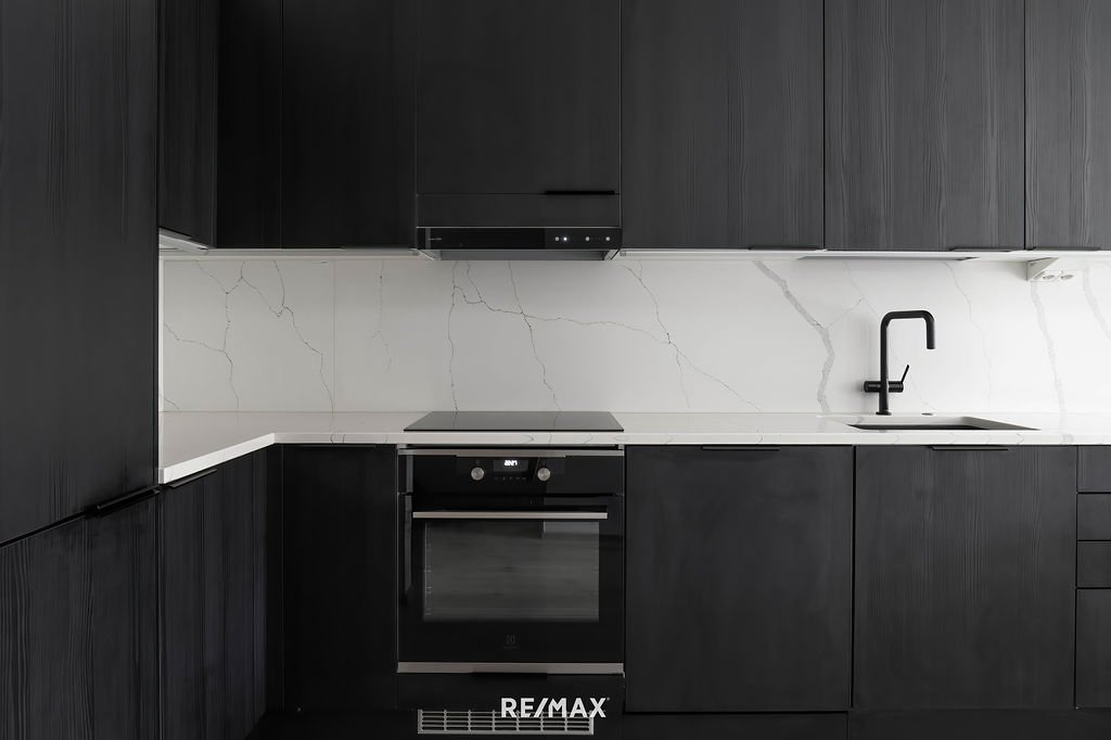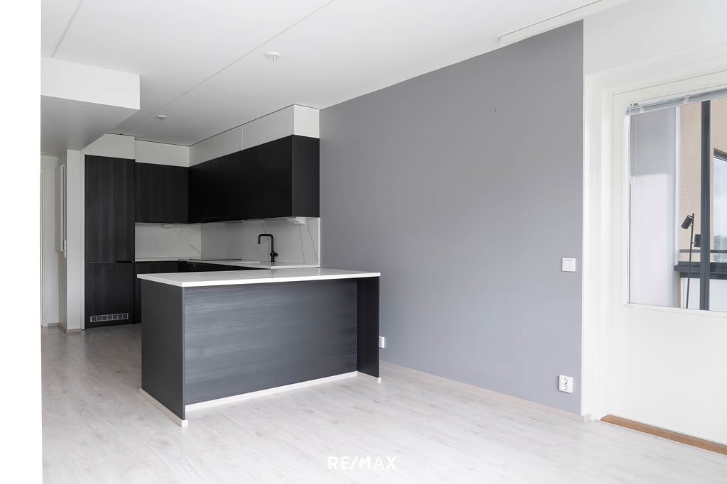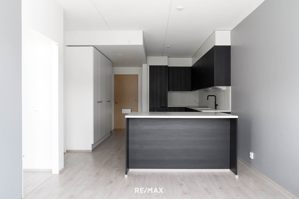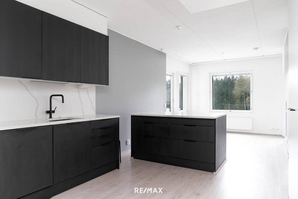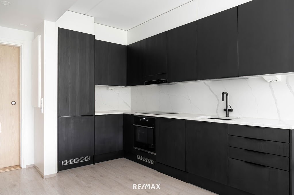Tyylikkäässä avokeittiössä on vaaleat puristekvartsitasot, jotka tuovat tilaan ylellisyyttä ja kestävyyttä. Keittiö on varusteltu laadukkailla Electroluxin kodinkoneilla, kuten induktioliedellä ja SteamBake-uunilla. Olohuoneen ja keittiön vaaleasävyinen laminaattilattia sekä kylpyhuoneen moderni laatoitus viimeistelevät yhtenäisen ja raikkaan ilmeen.