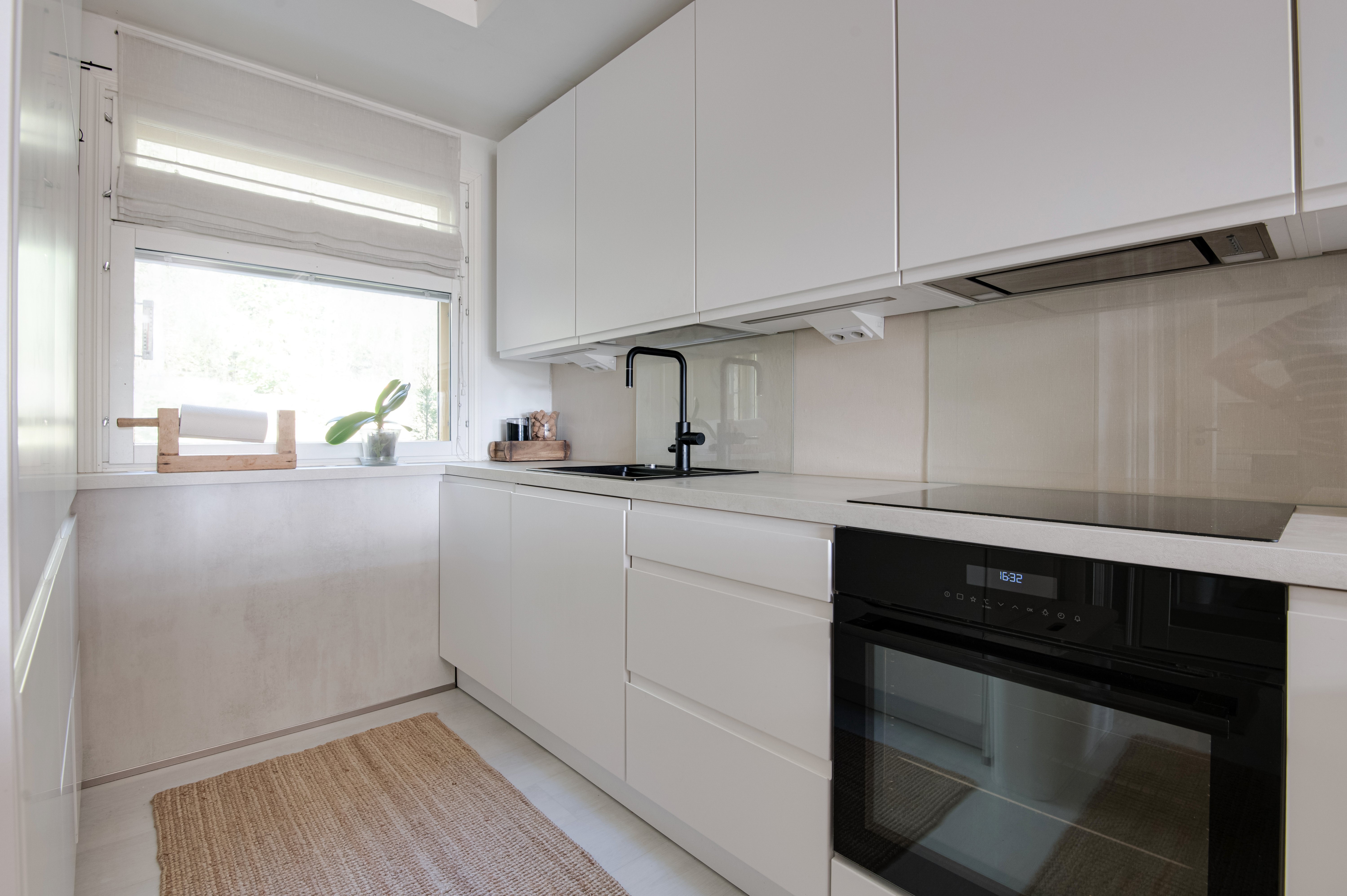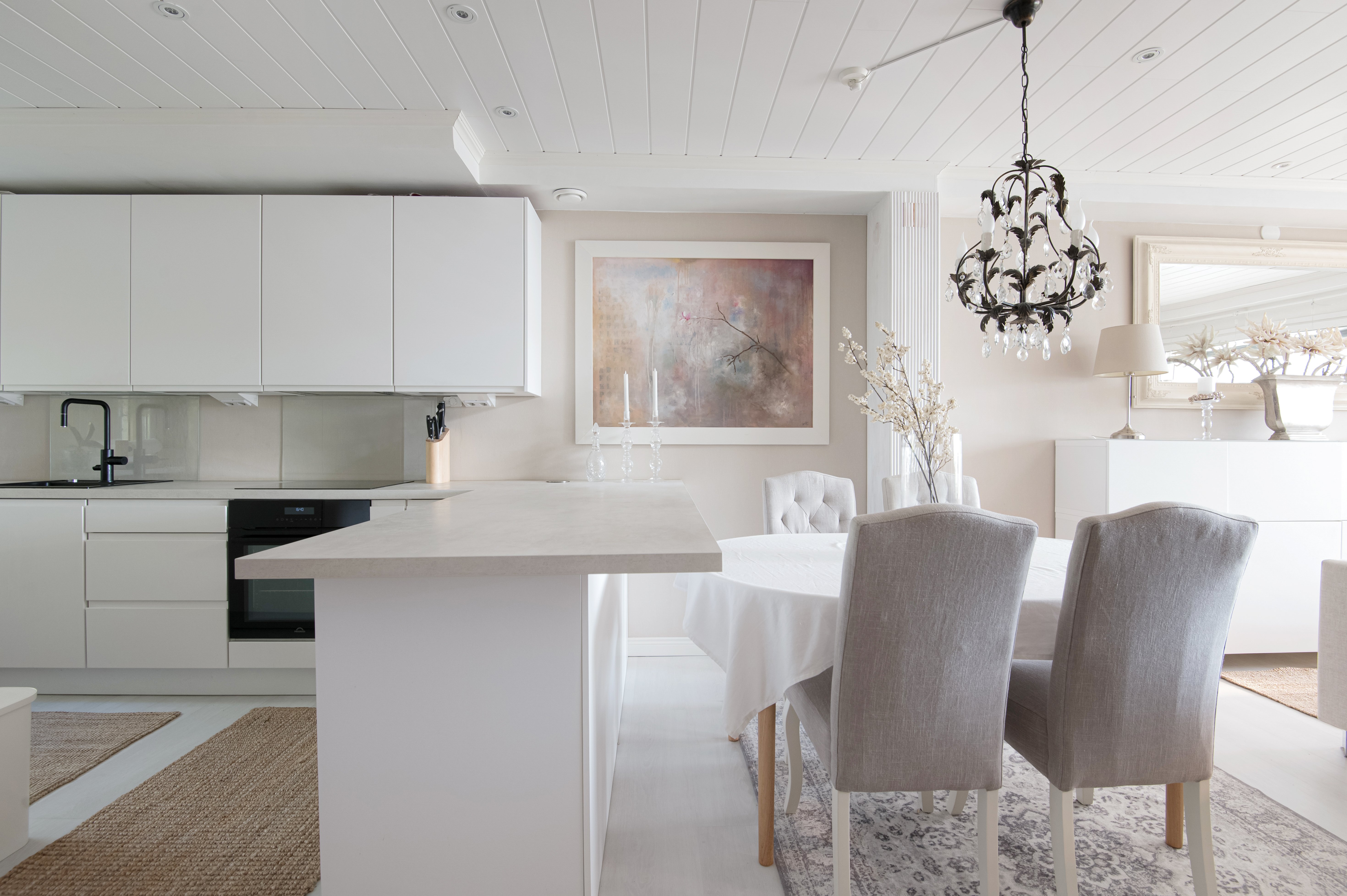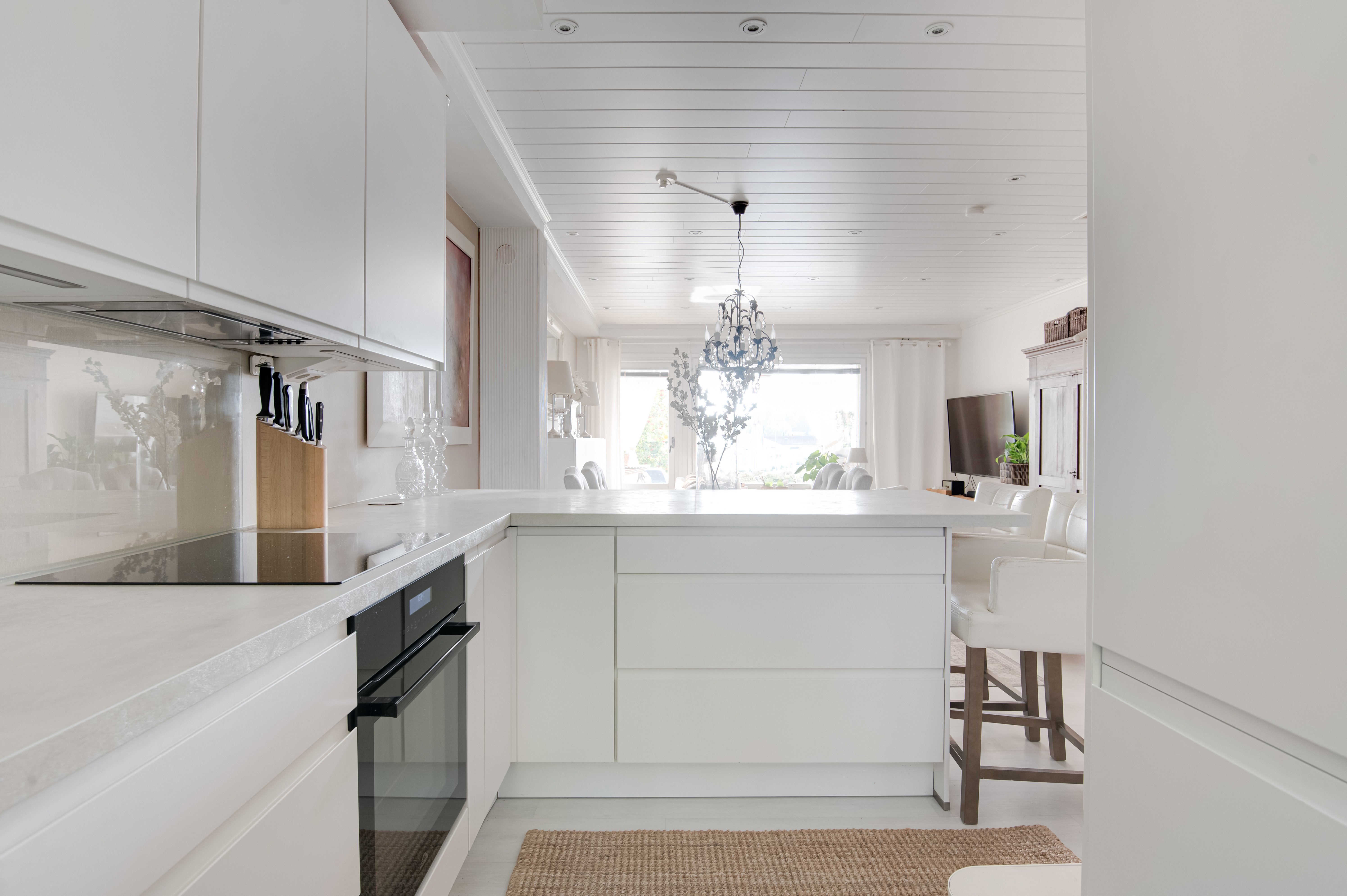 Keittiössä on laadukkaat kodinkoneet ja tilaa kokata. Koska keitiö on avoin ruokailutilaa kohti, voi samalla seurustella vieraiden kanssa.
