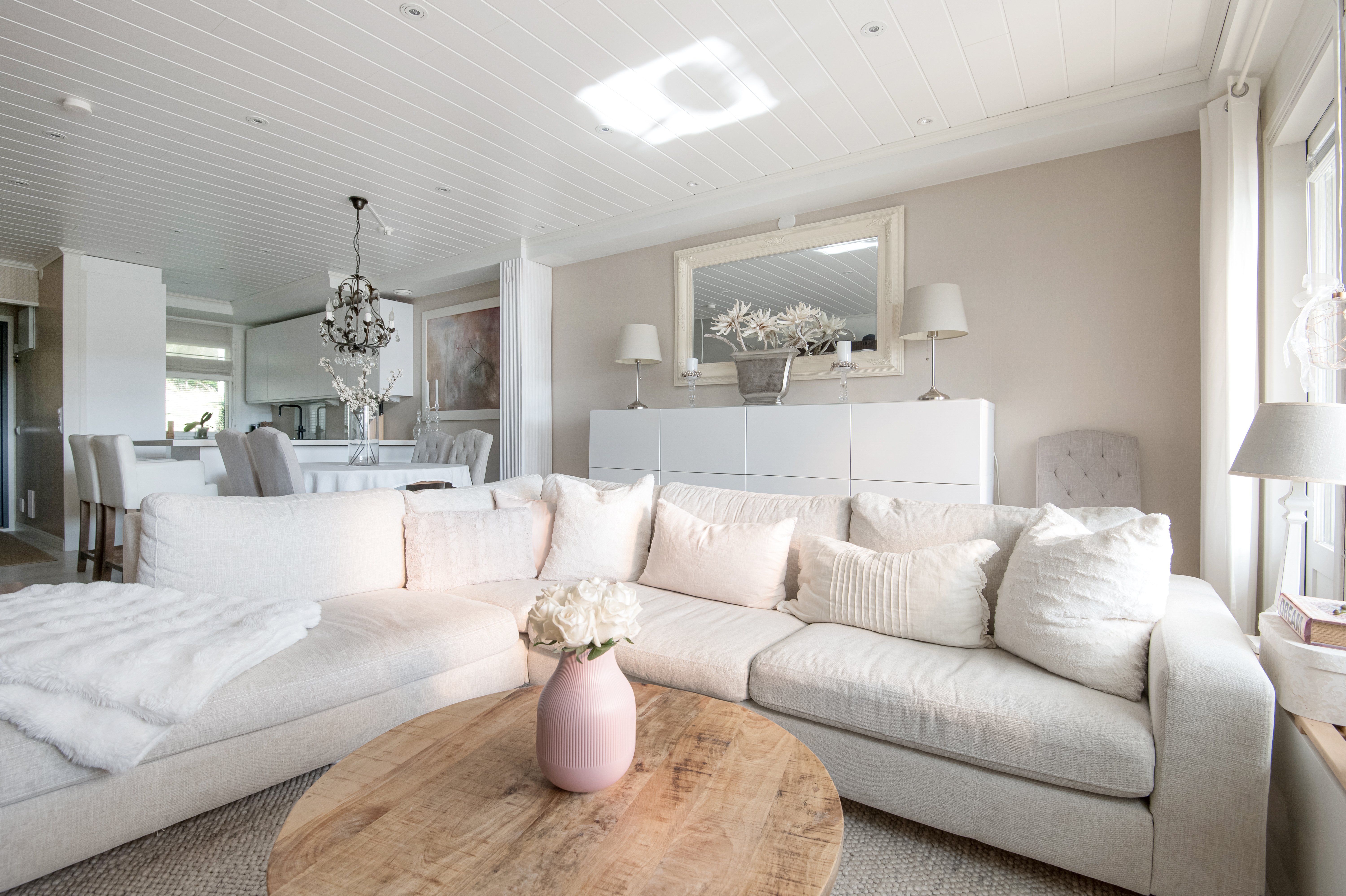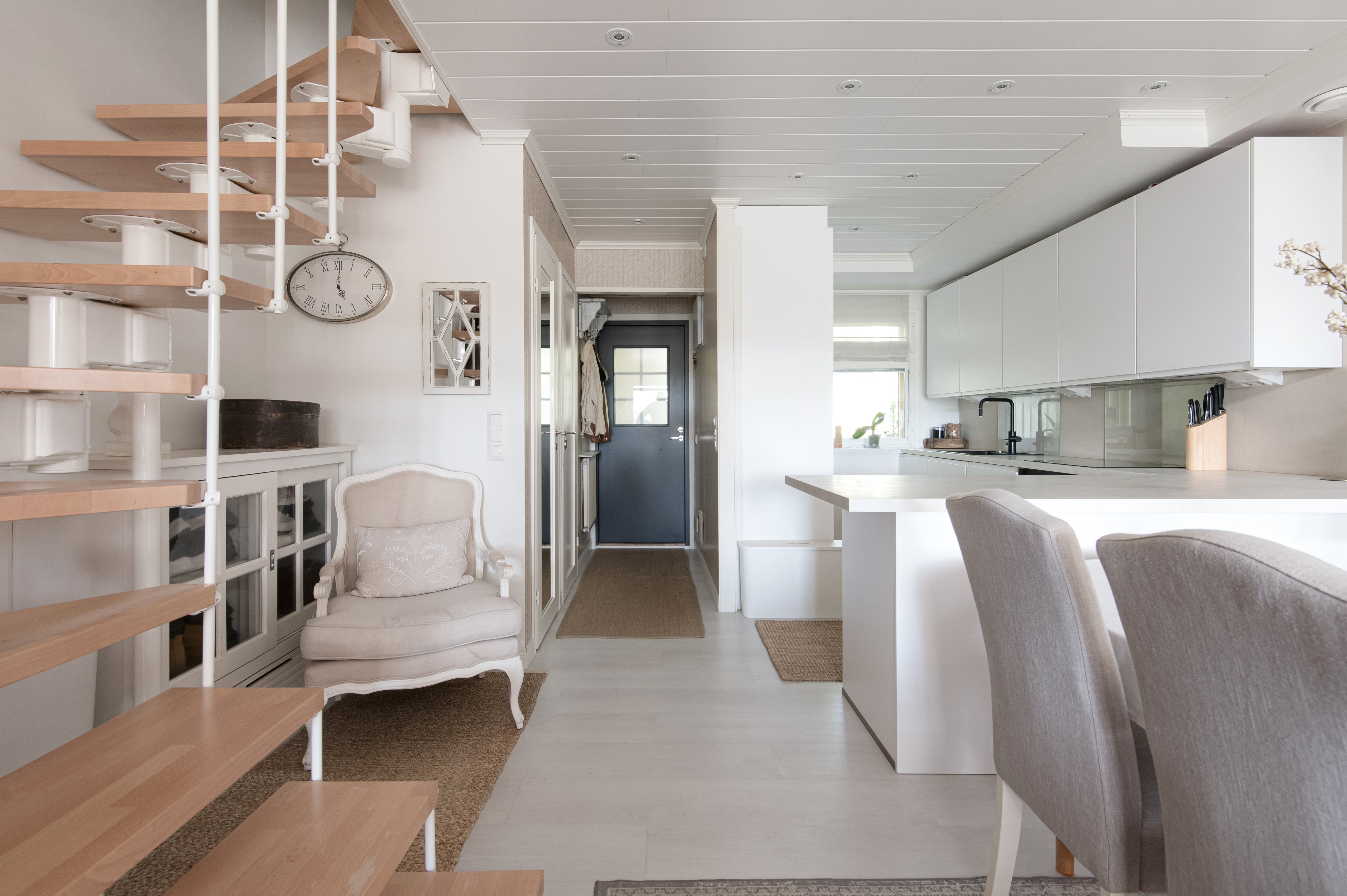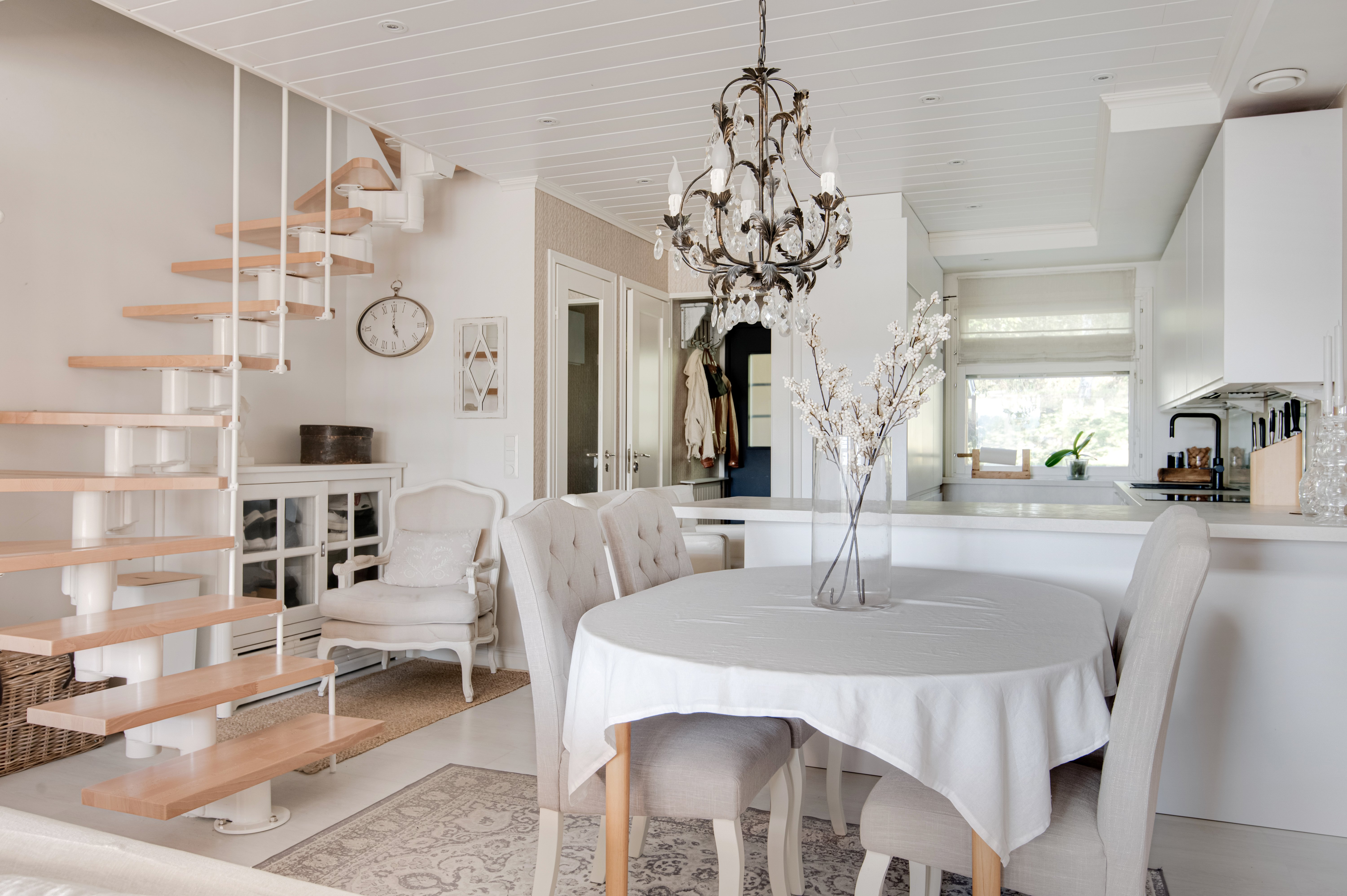 Keittiössä on laadukkaat kodinkoneet ja tilaa kokata. Koska keitiö on avoin ruokailutilaa kohti, voi samalla seurustella vieraiden kanssa.