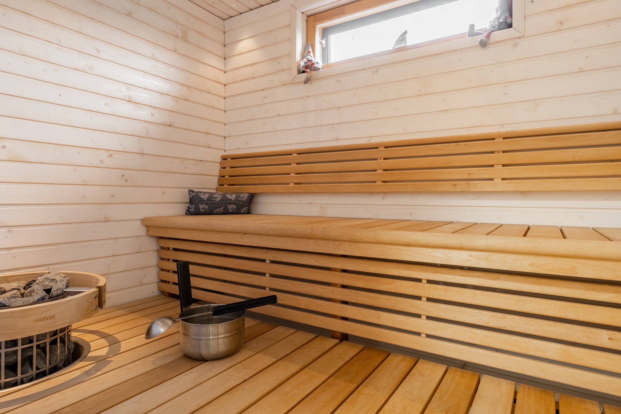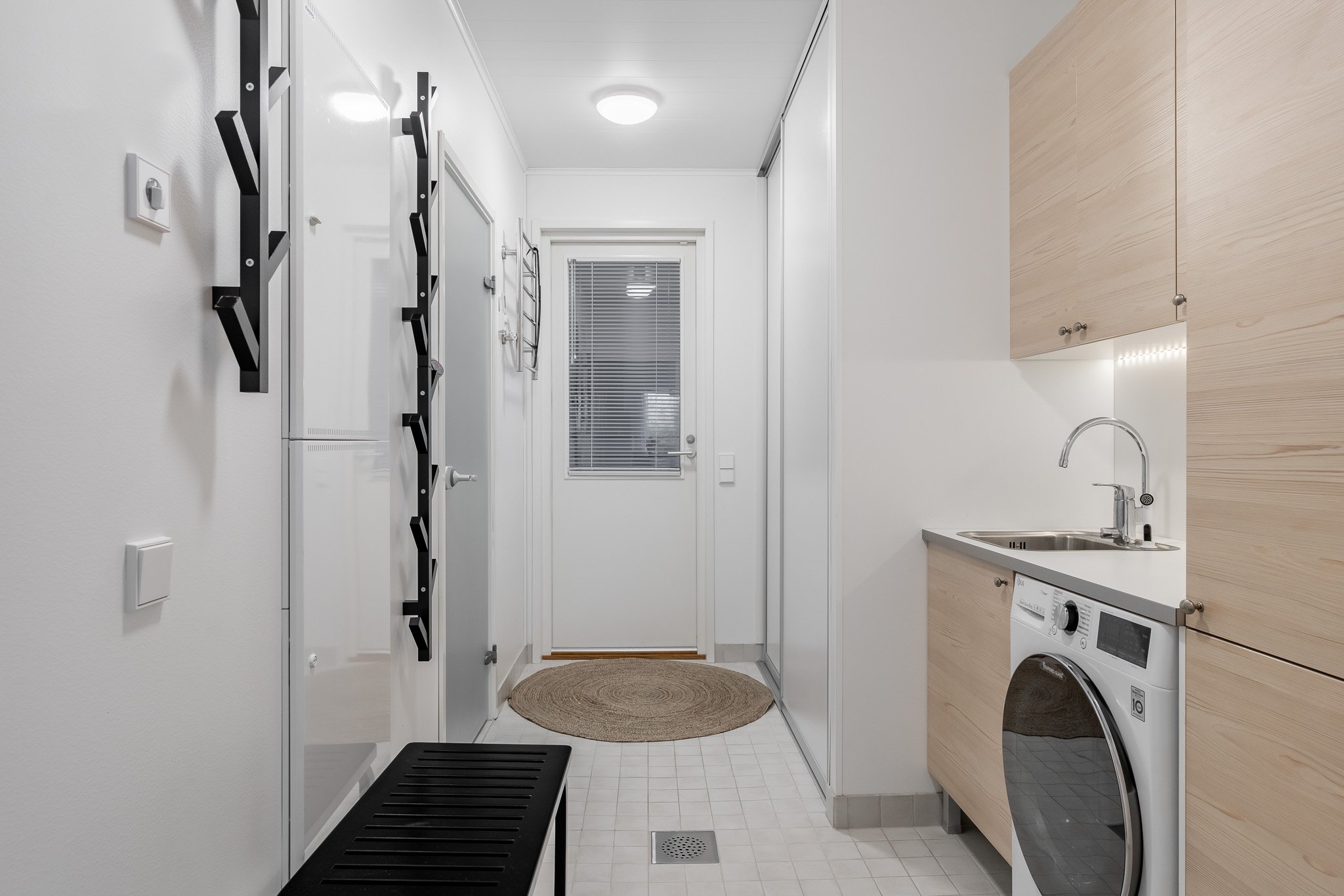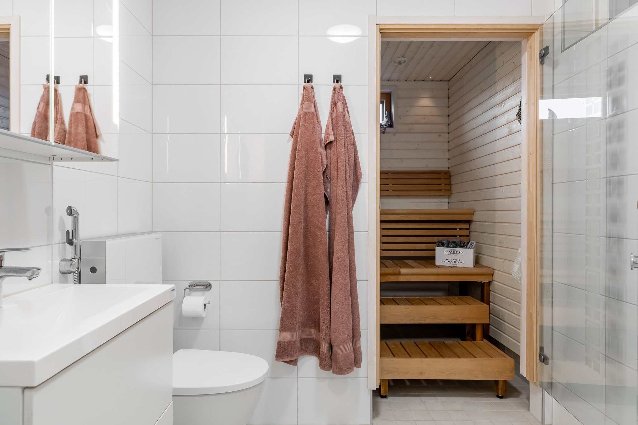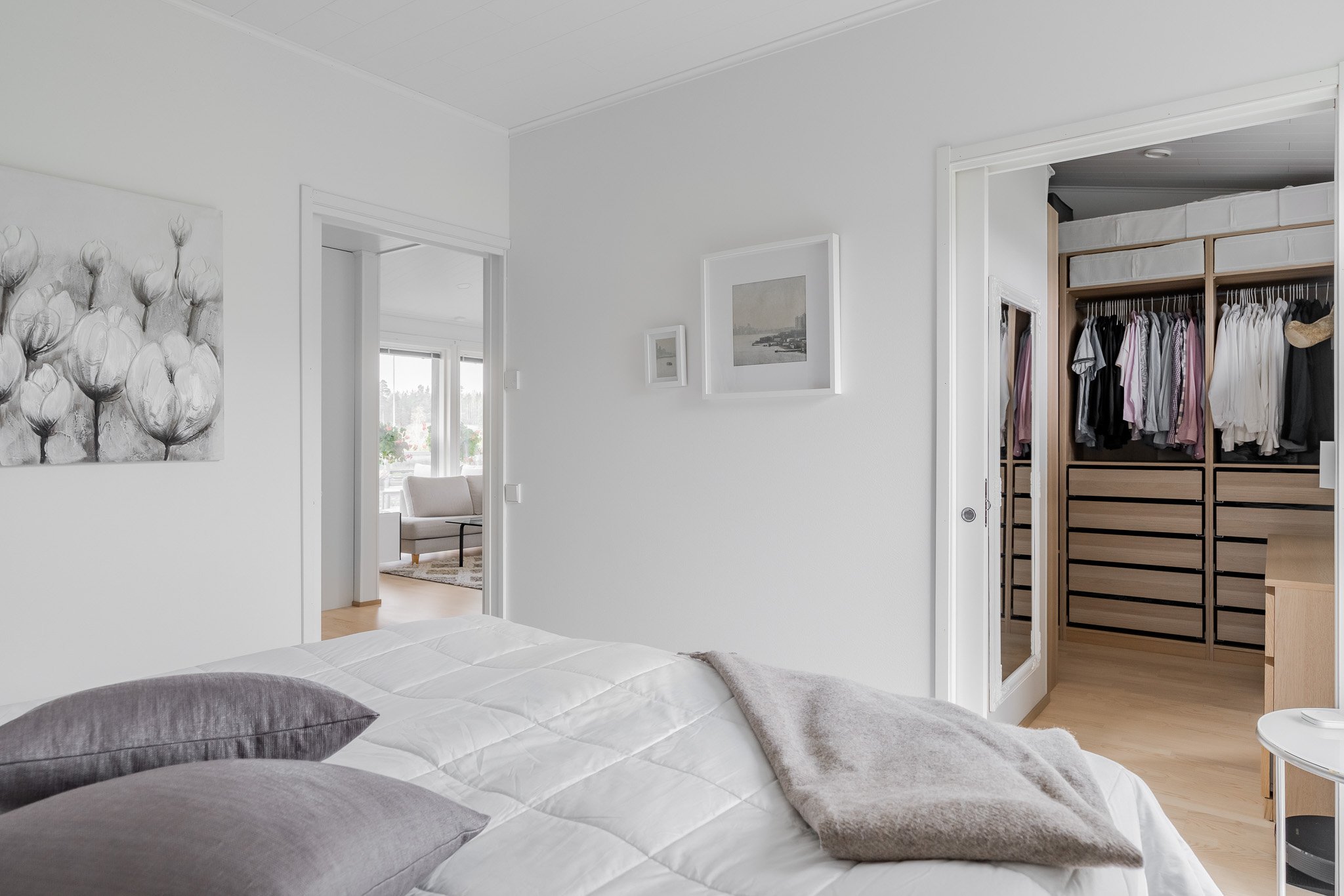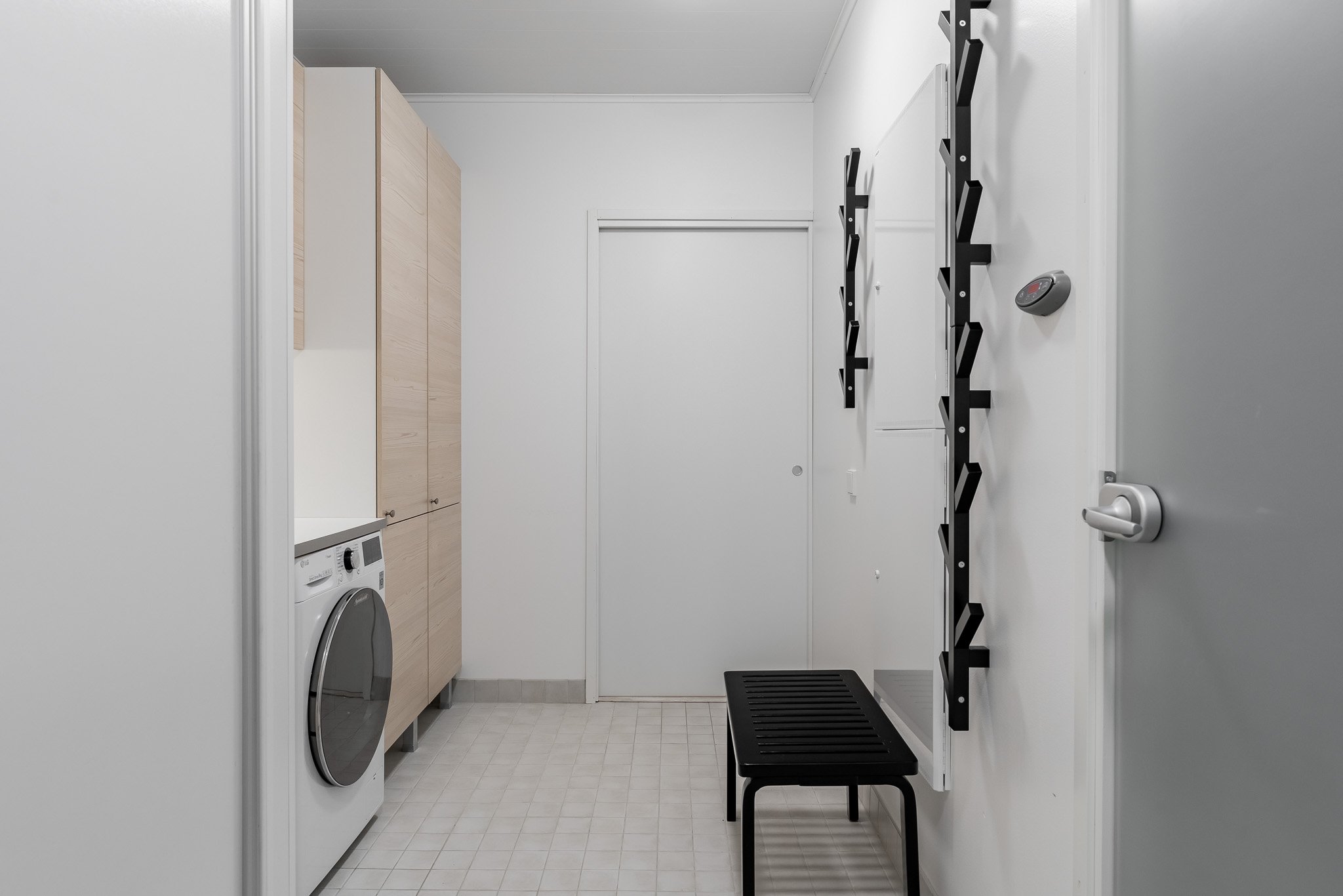 Kaksi makuuhuonetta joista suurempi päämakuuhuone kätkee sisäänsä täydellisesti järjestellyn walk-in vaatehuoneen. Erillinen wc-tila tyylikkäällä valaistulla peilillä sekä allaskaapistolla. Sauna ja pesutilat ovat yhtenäisen harmoniset ja tunnelmalliset. Talossa on myös kodinhoitohuone, josta on oma uloskäynti, mikä tekee arjen askareista sujuvia.