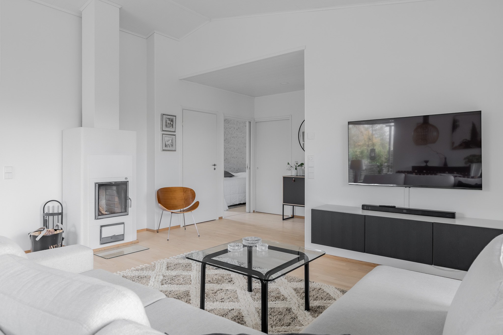Talon avara olohuone täyttyy luonnonvalosta, ja lämpöä tuo varaava takka. Lämmityksestä huolehtii energiatehokas poistoilmalämpöpumppu, joka kierrättää vesikiertoista lattialämmitystä asuintiloissa. Keittiö on hyvin varusteltu sekä siellä on sopivasti laskutilaa, riittävä määrä kaapistoja ja modernit kodinkoneet.
