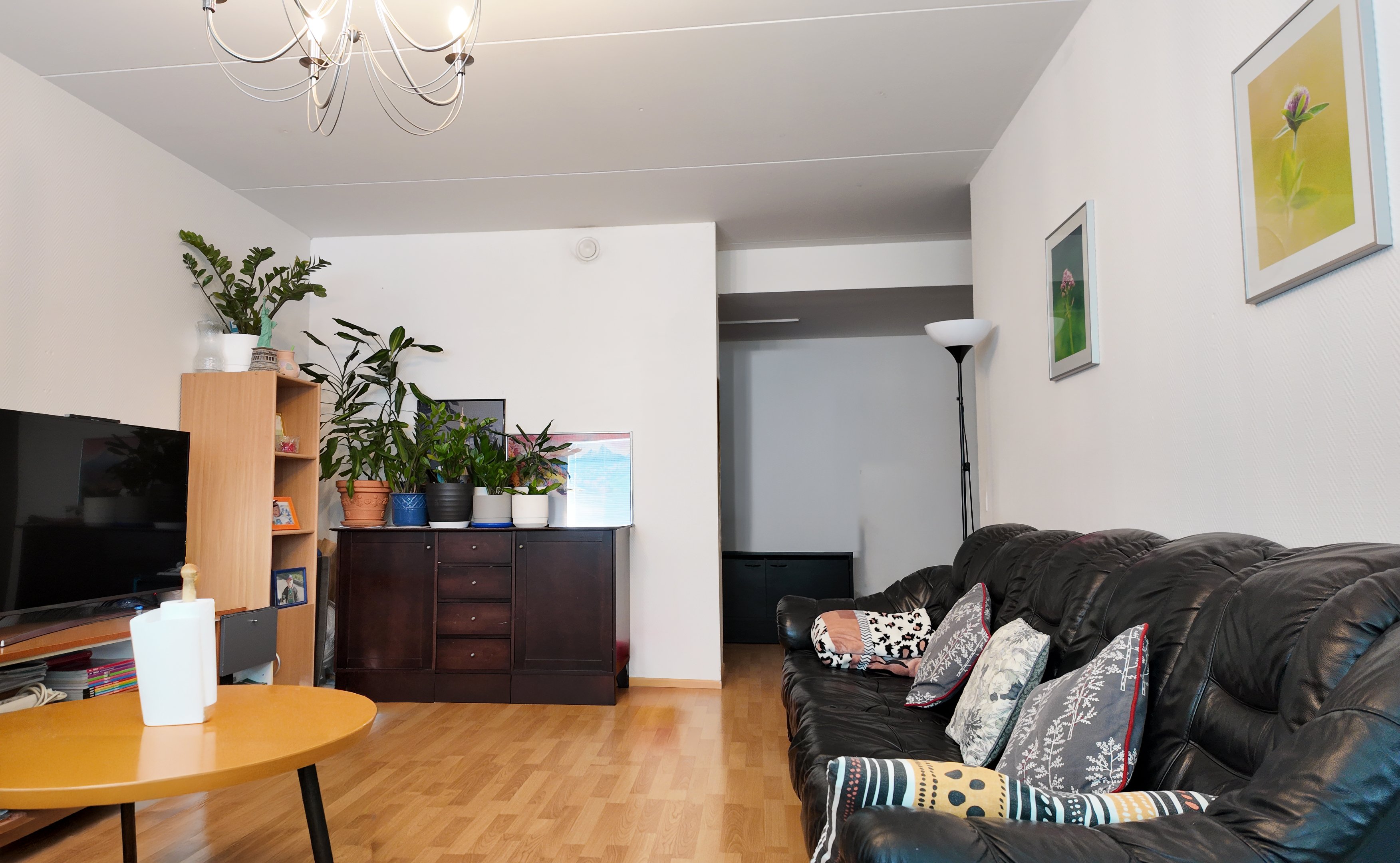 Hyväpohjainen kolmio Riihimäellä – tilava olohuone ja lasitettu parveke.