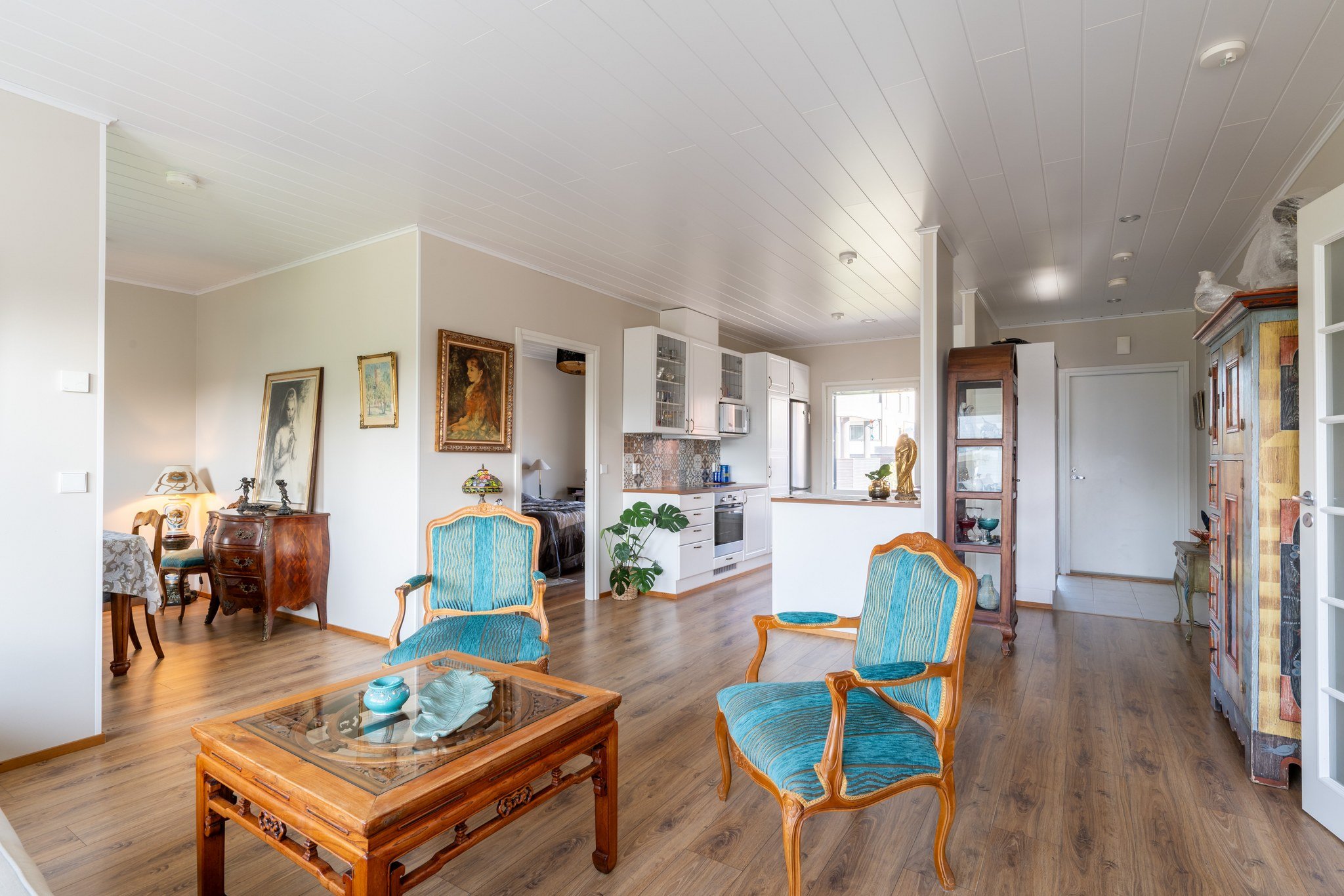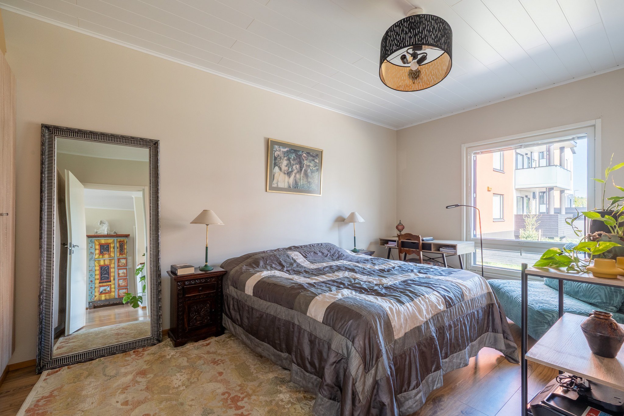 Tarkoin suunnitellut pohjaratkaisut tarjoavat koko perheelle hyvät elintilat. Kokonaisuuden neljästä valoisasta huoneesta kaksi on makuuhuoneita. Kolmannesta huoneesta on jo rakennusvaiheessa tehty ruokailutila, jonka voi tarvittaessa muuntaa takaisin alkuperäisen suunnitelman mukaisesti makuuhuoneeksi. Laskennallinen neljäs huone eli olohuone sijoittuu asunnon keskilinjaan, josta tämä yhdistyy keittiöön sekä eteiseen. Kaikkia näitä huoneita yhdistää yksi ja sama lattiamateriaali, elämisen jälkiä hyvin kestävä Villeroy & Bochin laadukas laminaatti. Olohuoneesta on käynti länsisuunnan terassille ja piha-alueelle.