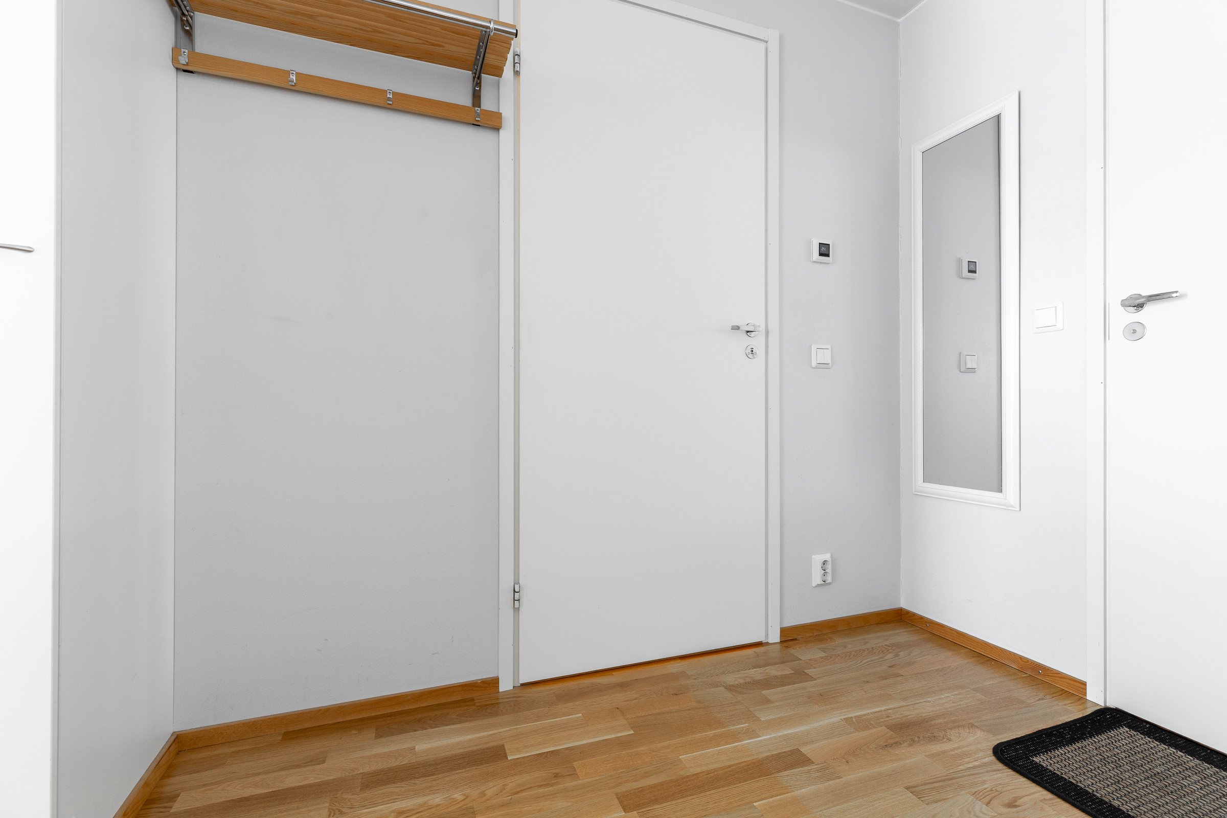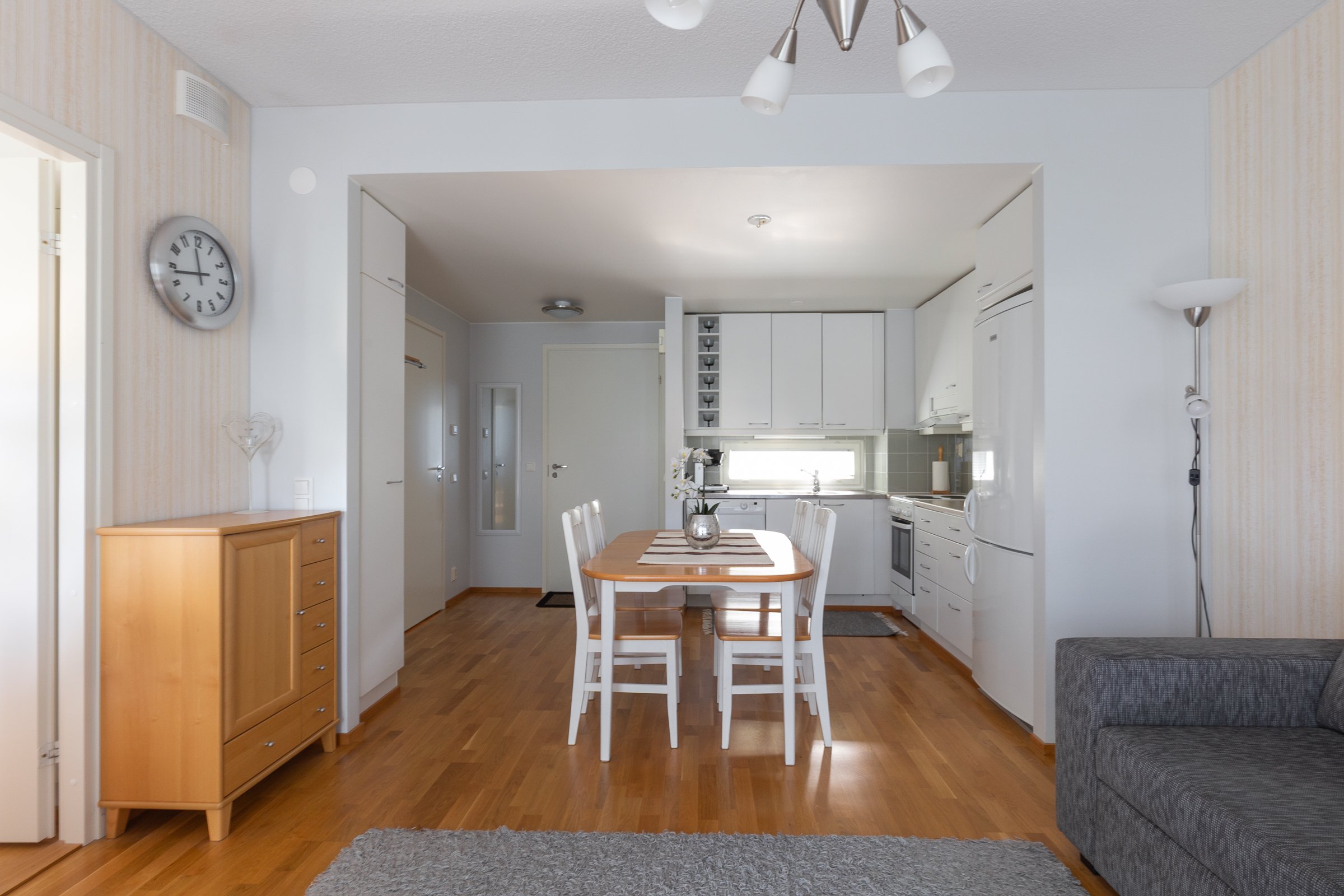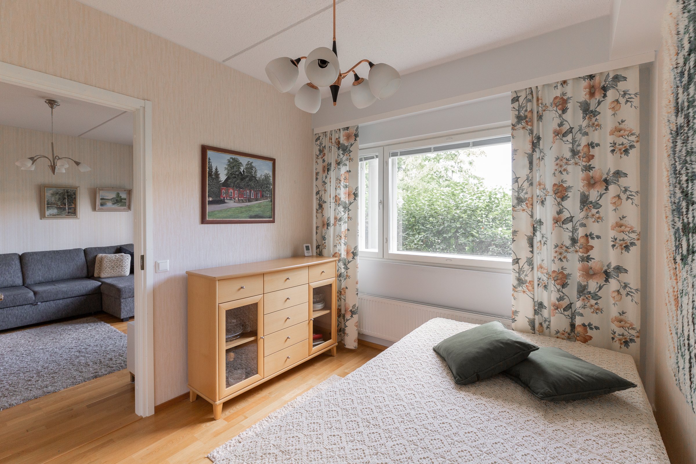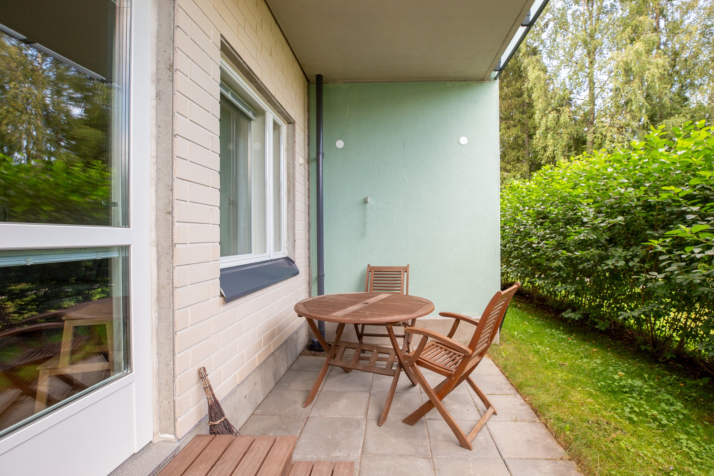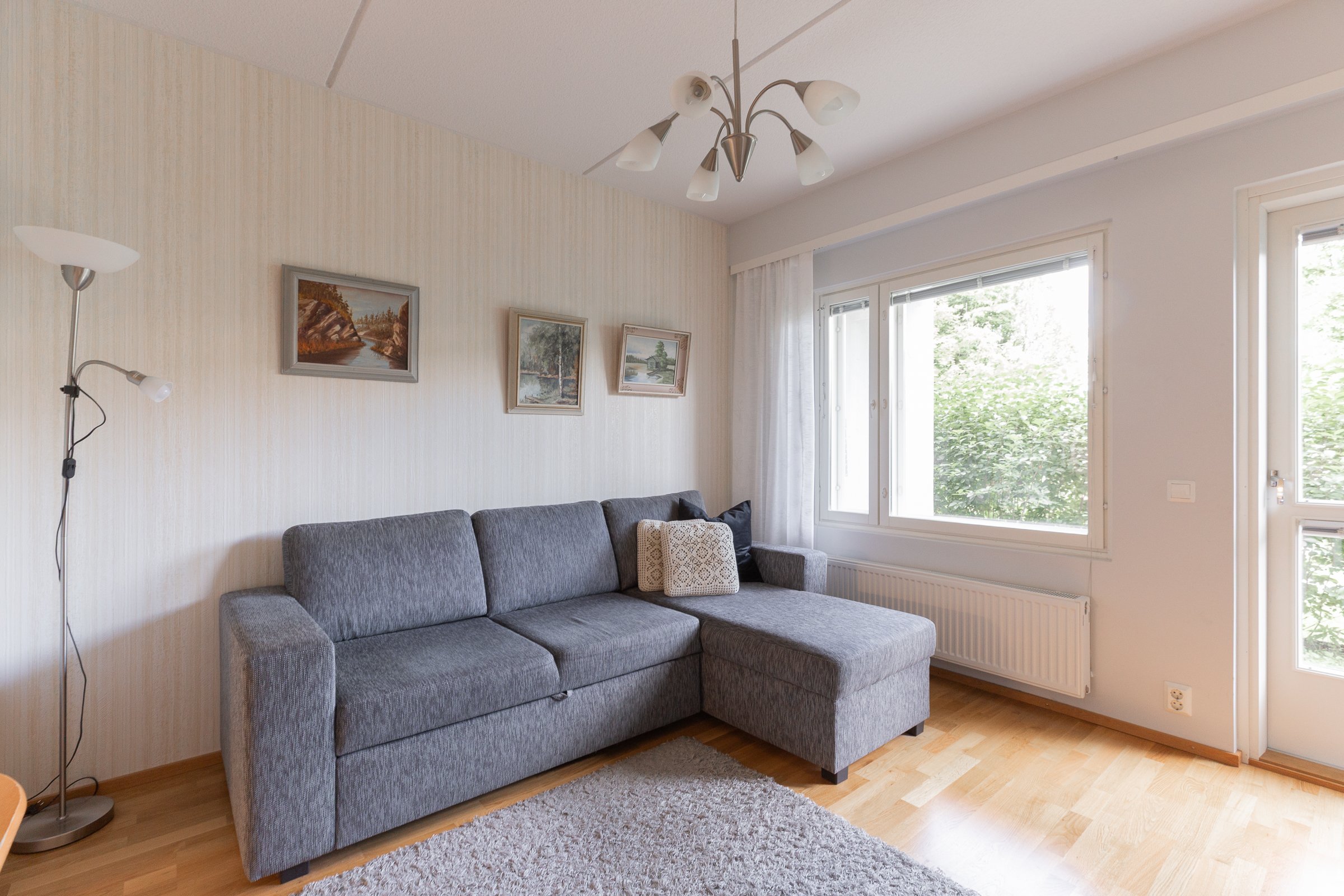 Tässä hyvin pidetyssä kodissa olohuone ja keittiö muodostavat toimivan yhtenäisen tilan. Makuuhuoneeseen mahtuu parisänky, ja sieltä löytyy kaapistot. Kylpyhuone on reilunkokoinen, jossa on paikka myös pesukonetornille. Täällä pääset nauttimaan saunasta, ja vilvoittelu onnistuu omalla terassilla ja piha-alueella ilta-auringossa.