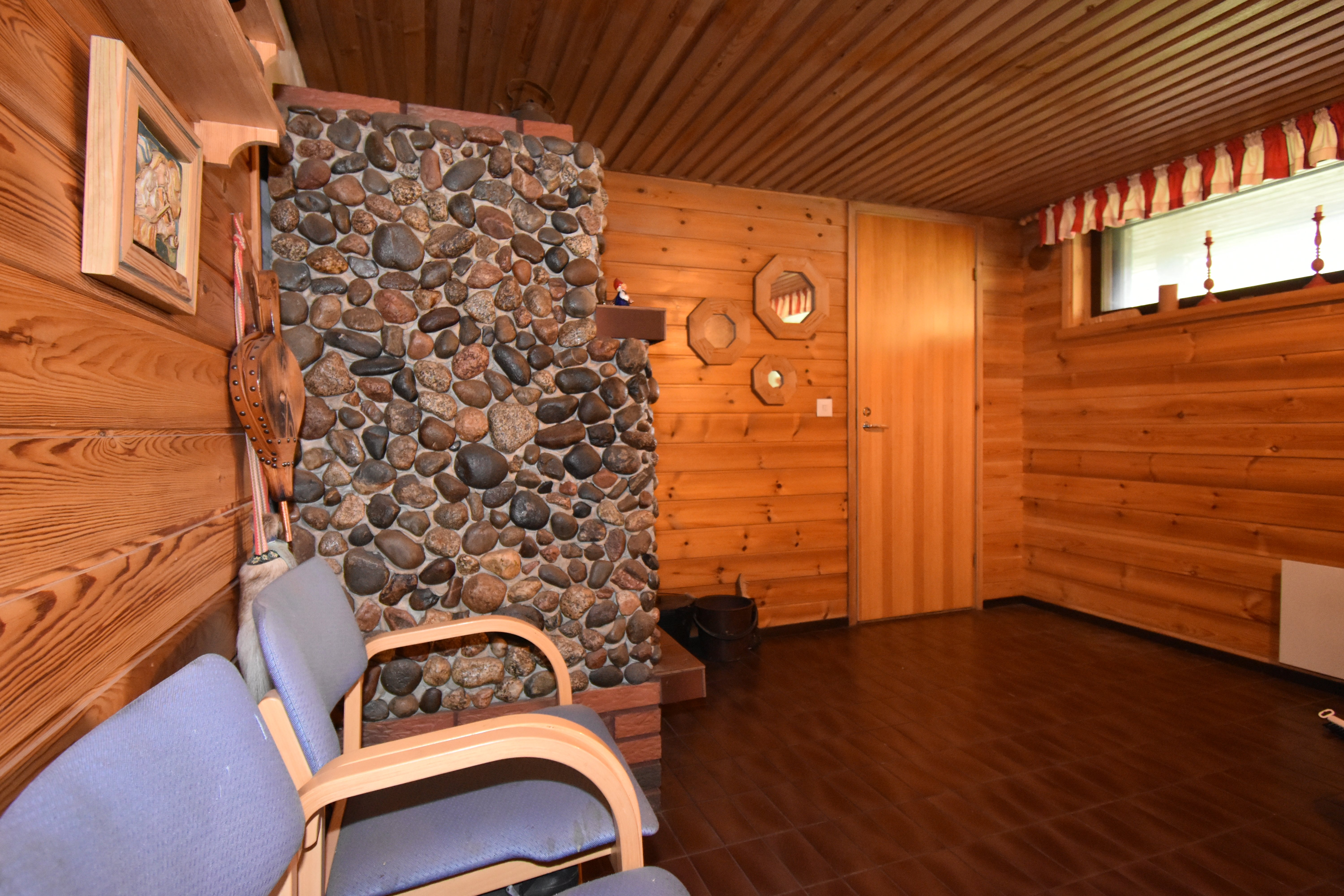 Talossa on kaksi makuuhuonetta, joissa on parkettilattiat ja tapetoidut seinät. Lisäksi alakerrasta löytyy huone, soveltuen työ- tai makuuhuoneeksi. Olohuoneessa on myös parkettilattia. Takkahuoneen tunnelmallinen takka tuo lämpöä ja viihtyisyyttä kylminä talvi-iltoina. Keittiössä on puuhella. Keittiön lattiapinnoite ja liesi sekä kaapistot kaipaa uusimista. Kylpyhuoneessa on lattialämmitys ja sauna tarjoaa rentouttavat löylyt.