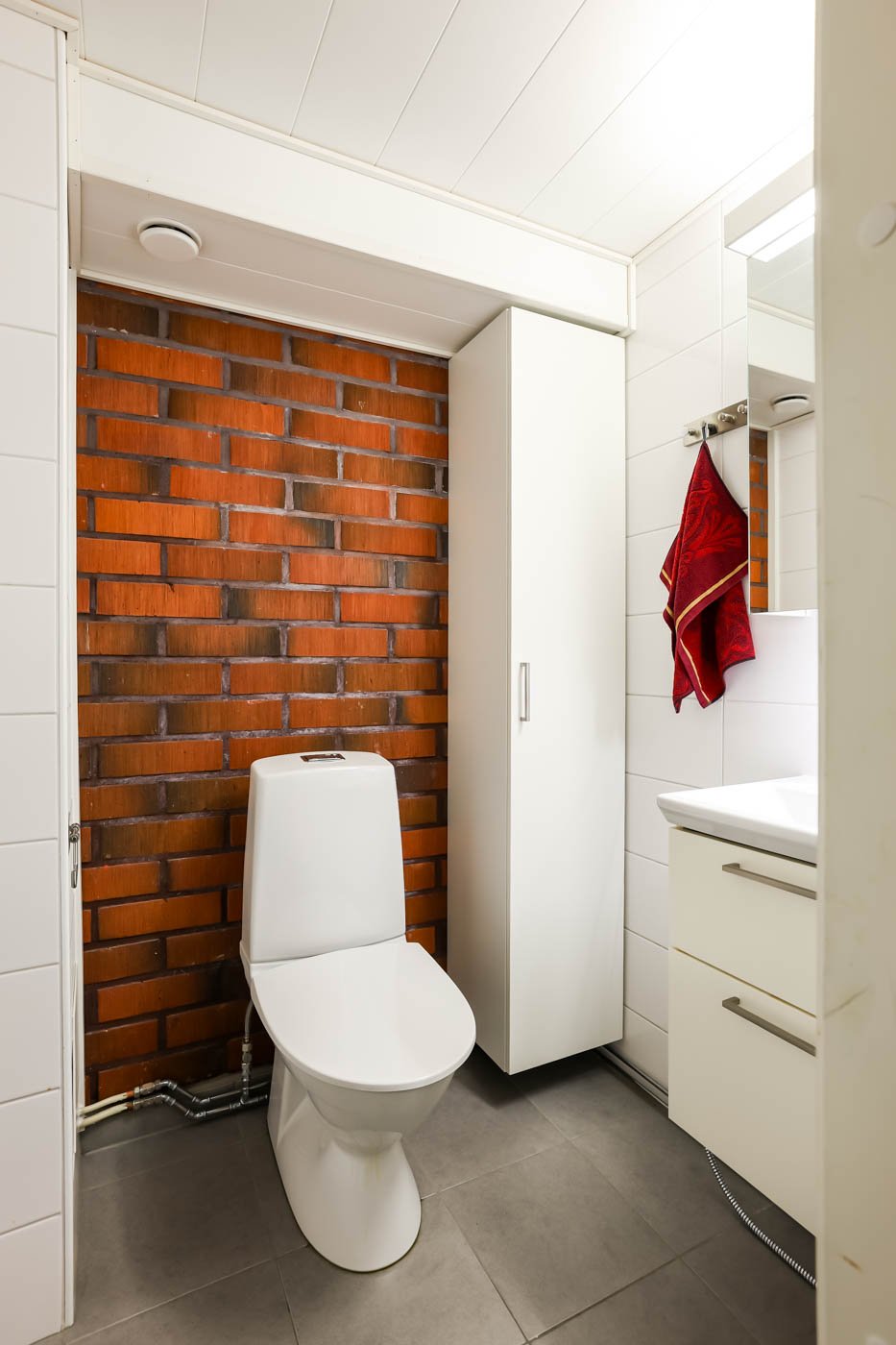 Sujuvaan arkeen löytyy asunnon molemmista kerroksista tyylikkäästi remontoidut wc:tä. Alakerran kylpyhuonesauna-osasto vaatii remontin. Sen yhteydessä on tila, joka soveltuisi hyvin esim. kodinhoitohuoneeksi. Säilytystilaa tässä kodissa on ruhtinaallisesti: kaapistot, vaatehuone, portaiden alustila, askarteluhuone, sekä sisääntulon yhteydessä oleva ulkovarasto.