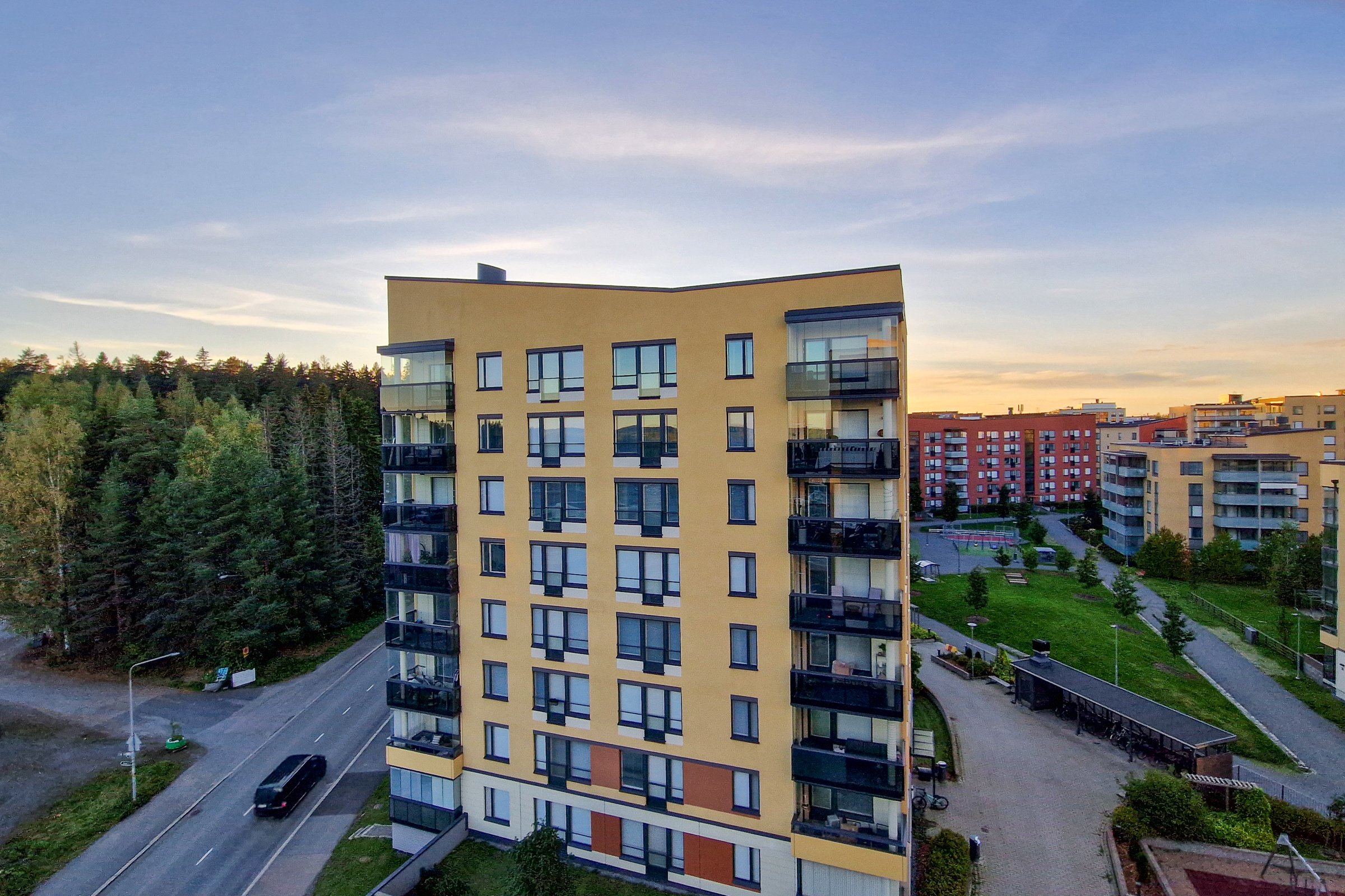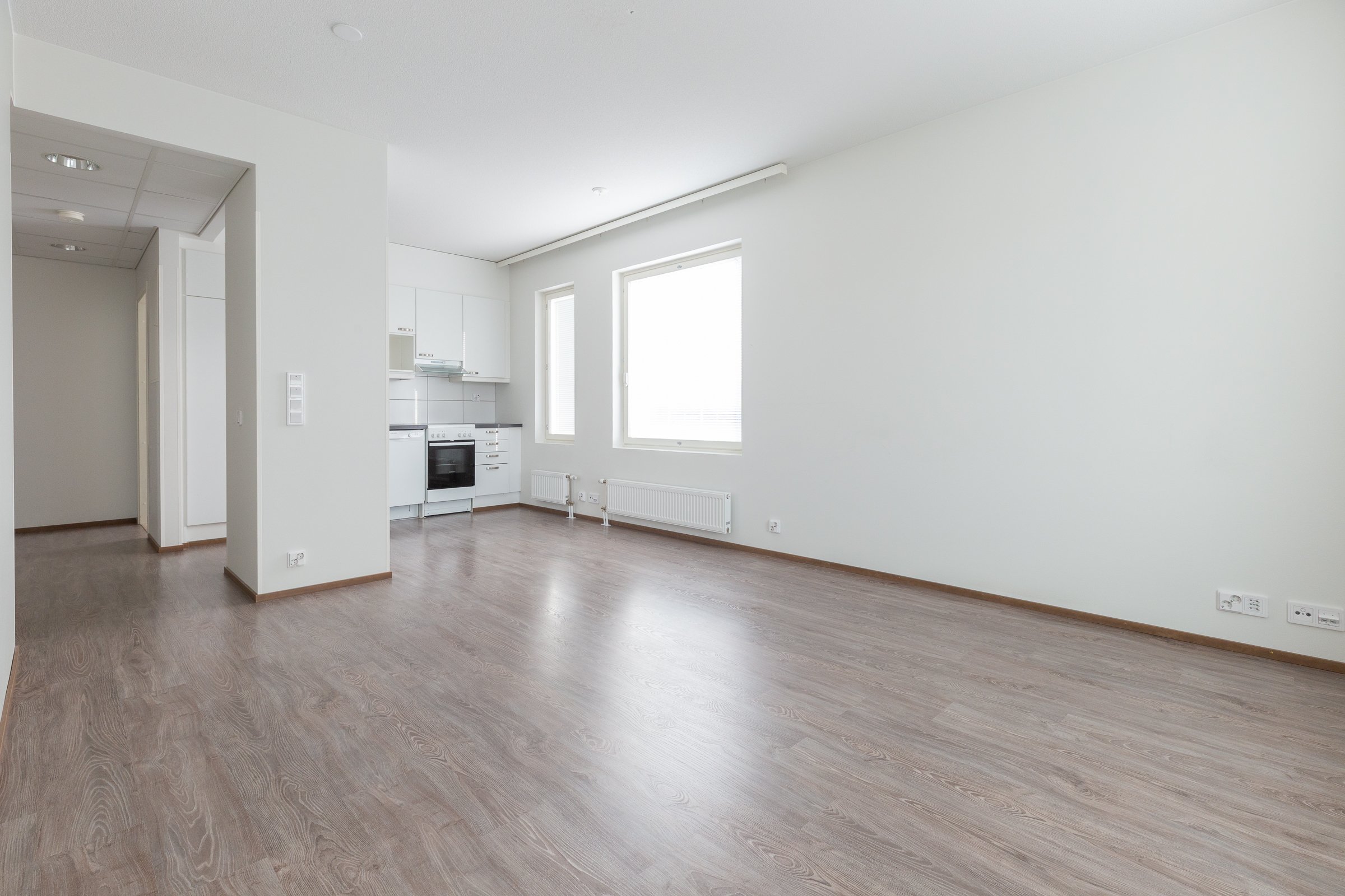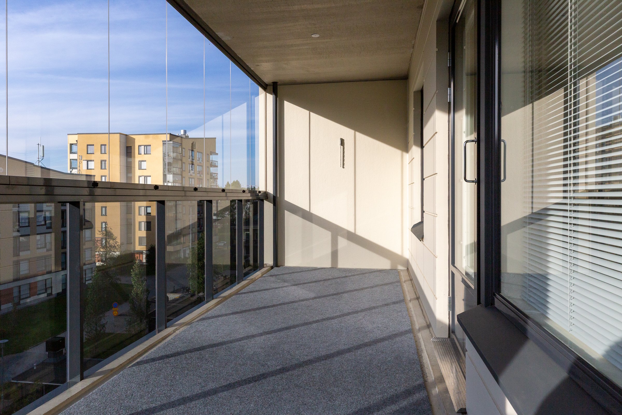 Tähän päätyhuoneistoon on helppo ihastua! Asunto yhdistää käytännöllisyyden, modernin mukavuuden ja kauniit näkymät. Kodin keskiössä on avoin ja valoisa yhtenäinen olohuone-keittiötila. Asunnon kaksi makuuhuonetta on sijoitettu eri puolille huoneistoa tarjoten yksityisyyttä. Toisessa makuuhuoneessa on käytännöllinen vaatehuone liukuovella, toisessa puolestaan tilavat kaapistot. Hulppean kokoinen huoneiston levyinen lasitettu parveke toimi erinomaisena lisäoleskelutila. Tilava kylpyhuone on suunniteltu käytännölliseksi, ja pyykkihuoltokin sujuu siellä vaivatta. Oman saunan lempeät löylyt puolestaan tarjoavat täydellisen paikan rentoutumiseen.