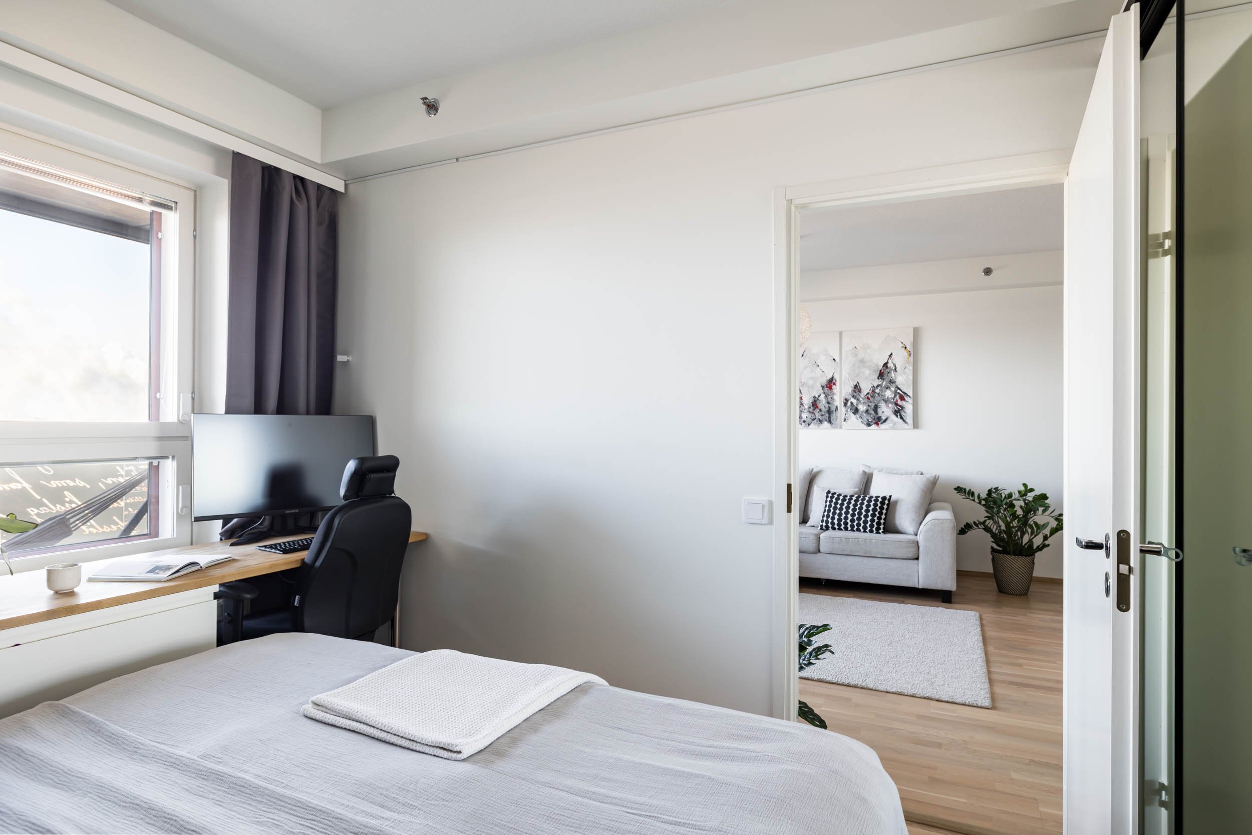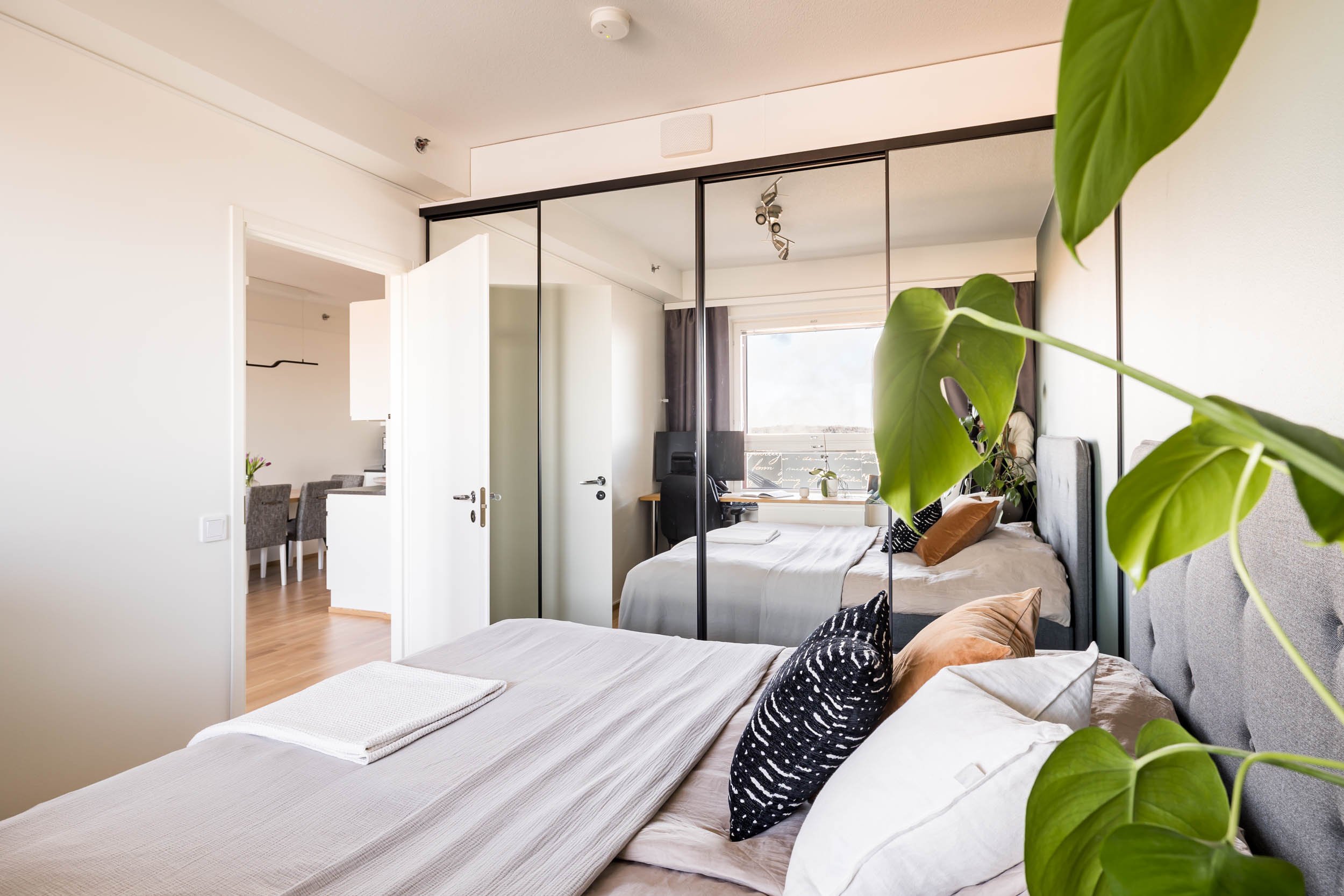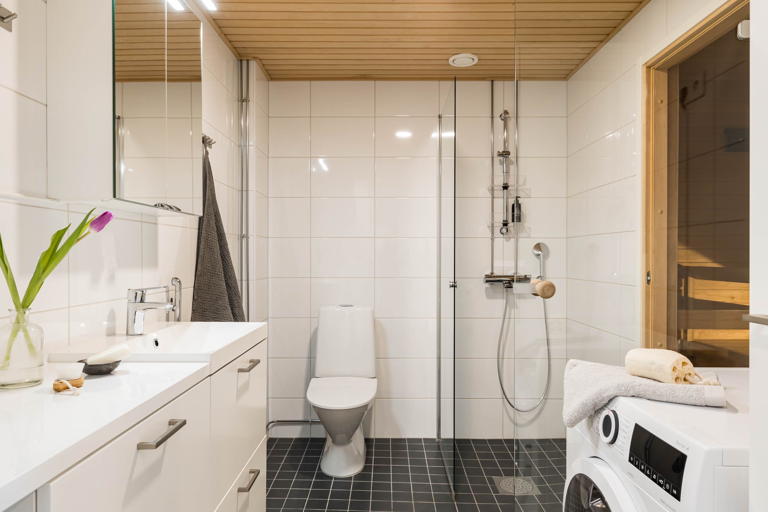 Makuuhuoneen puolella maisemat jatkuvat järvelle päin, ja säilytystilaa löytyy suuresta liukuovikaapistosta. Kylpyhuoneessa on kaikki mukavan arjen elementit: paikka pesutornille, lattialämmitys, säilytystilaa sekä oma sauna, joka on keskimääräisen kaksion saunaa isompi.