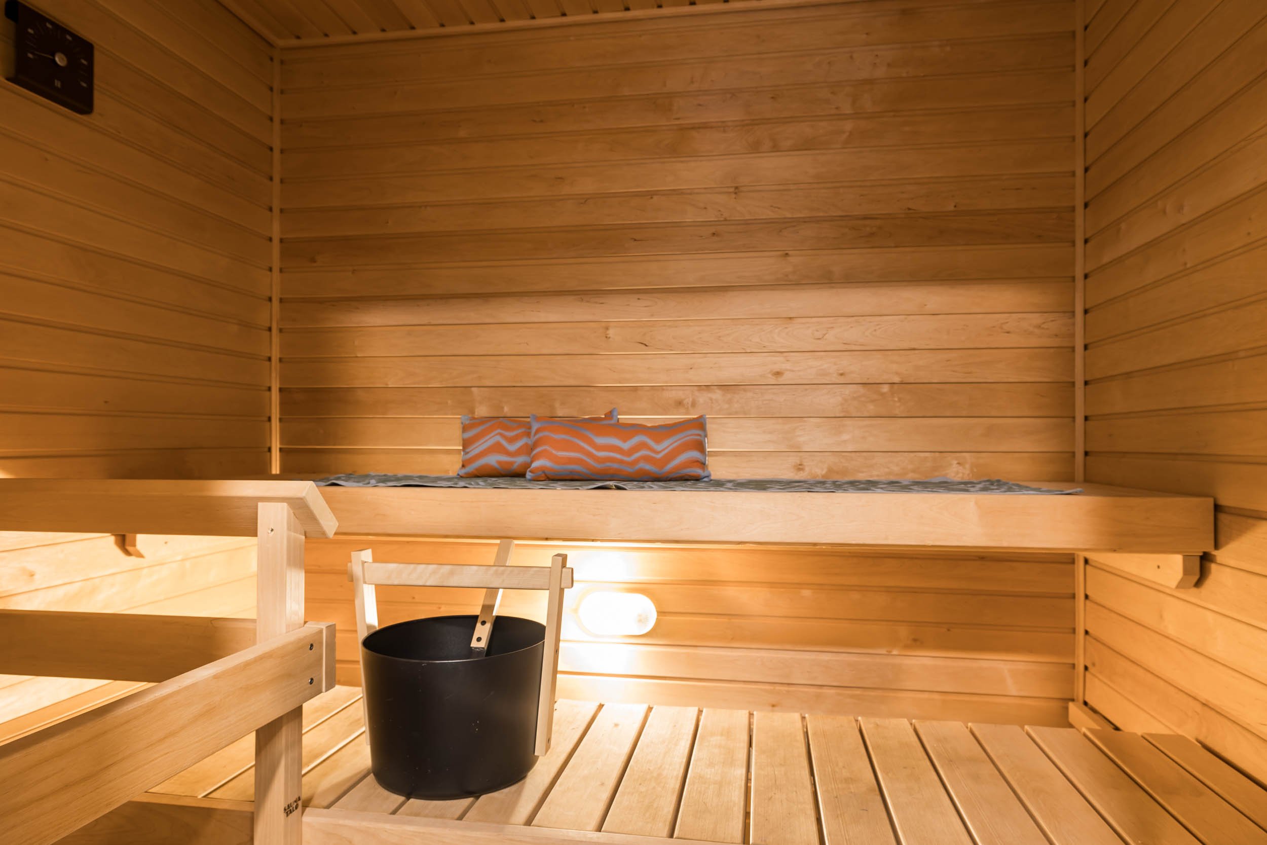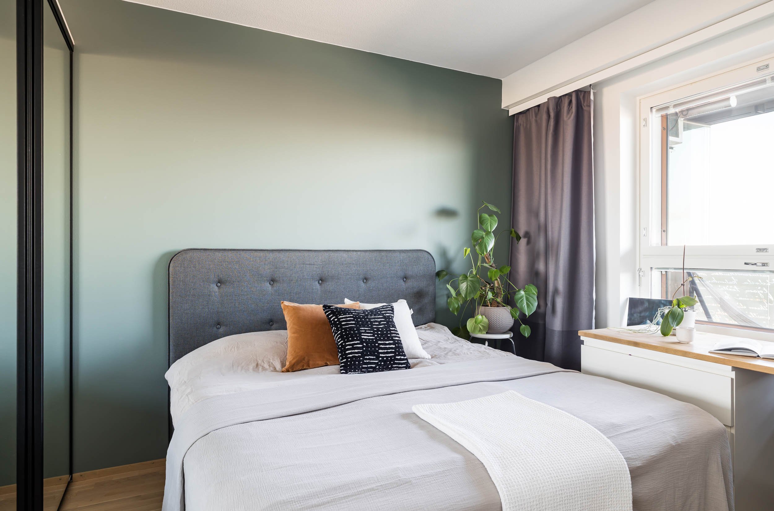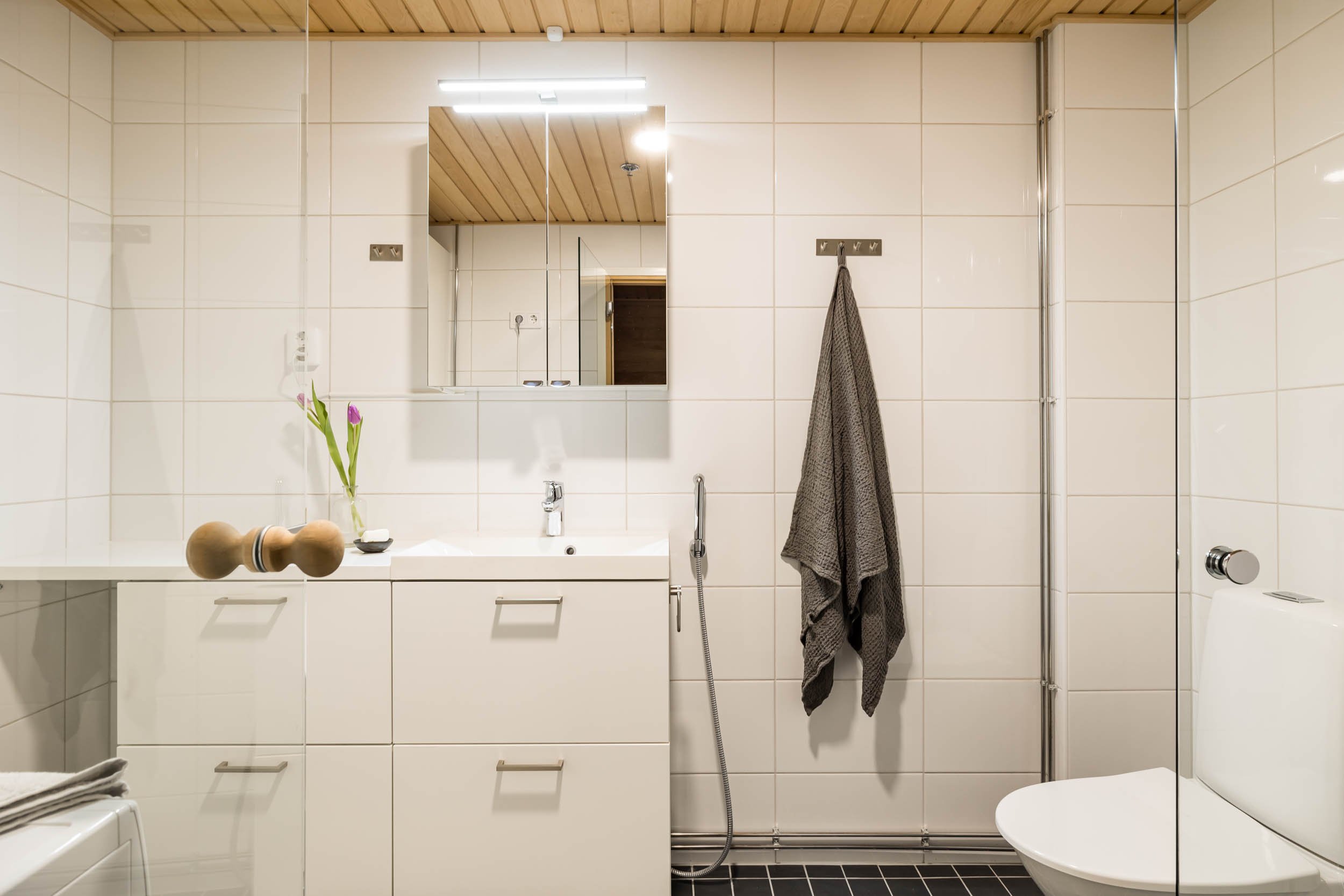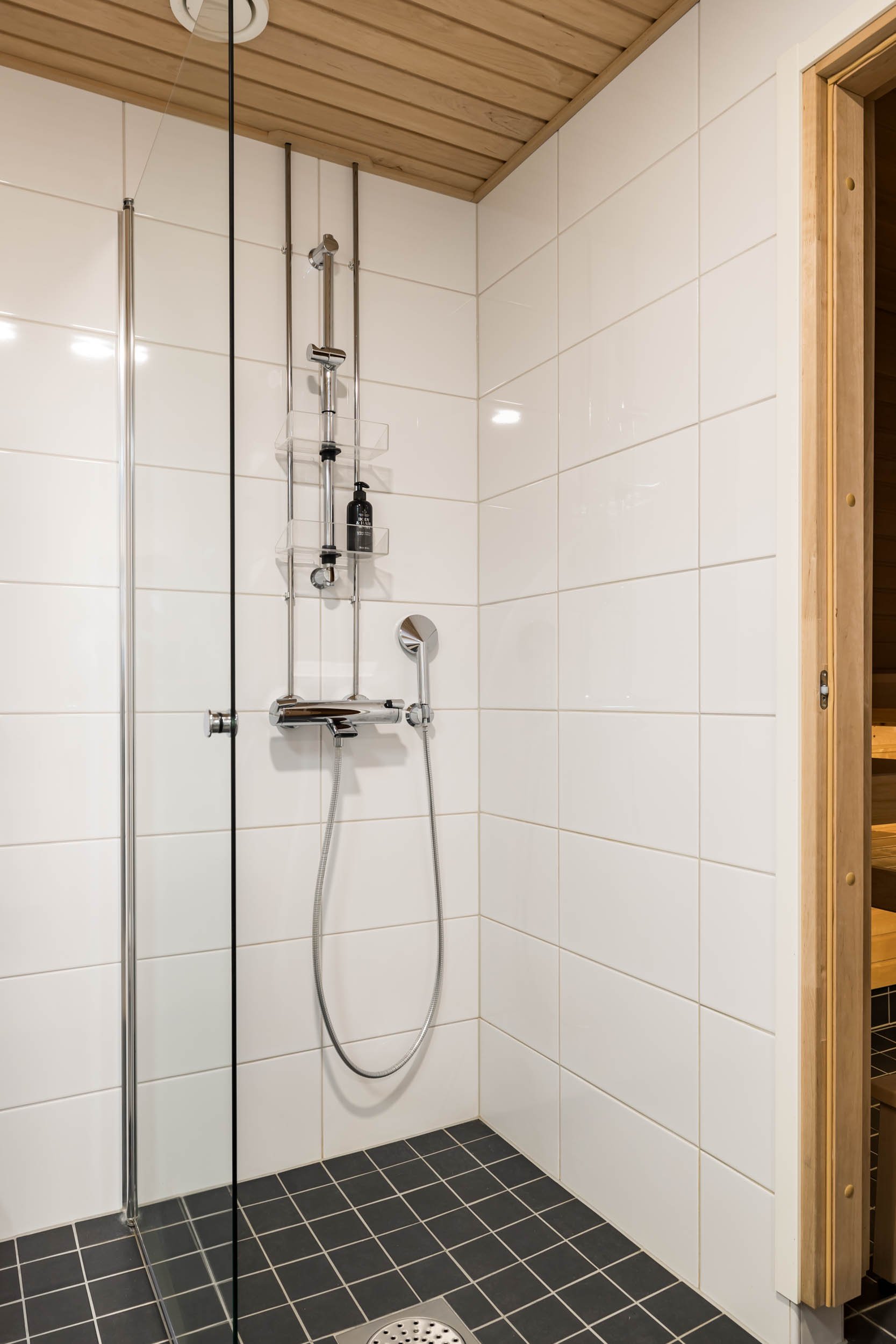 Makuuhuoneen puolella maisemat jatkuvat järvelle päin, ja säilytystilaa löytyy suuresta liukuovikaapistosta. Kylpyhuoneessa on kaikki mukavan arjen elementit: paikka pesutornille, lattialämmitys, säilytystilaa sekä oma sauna, joka on keskimääräisen kaksion saunaa isompi.