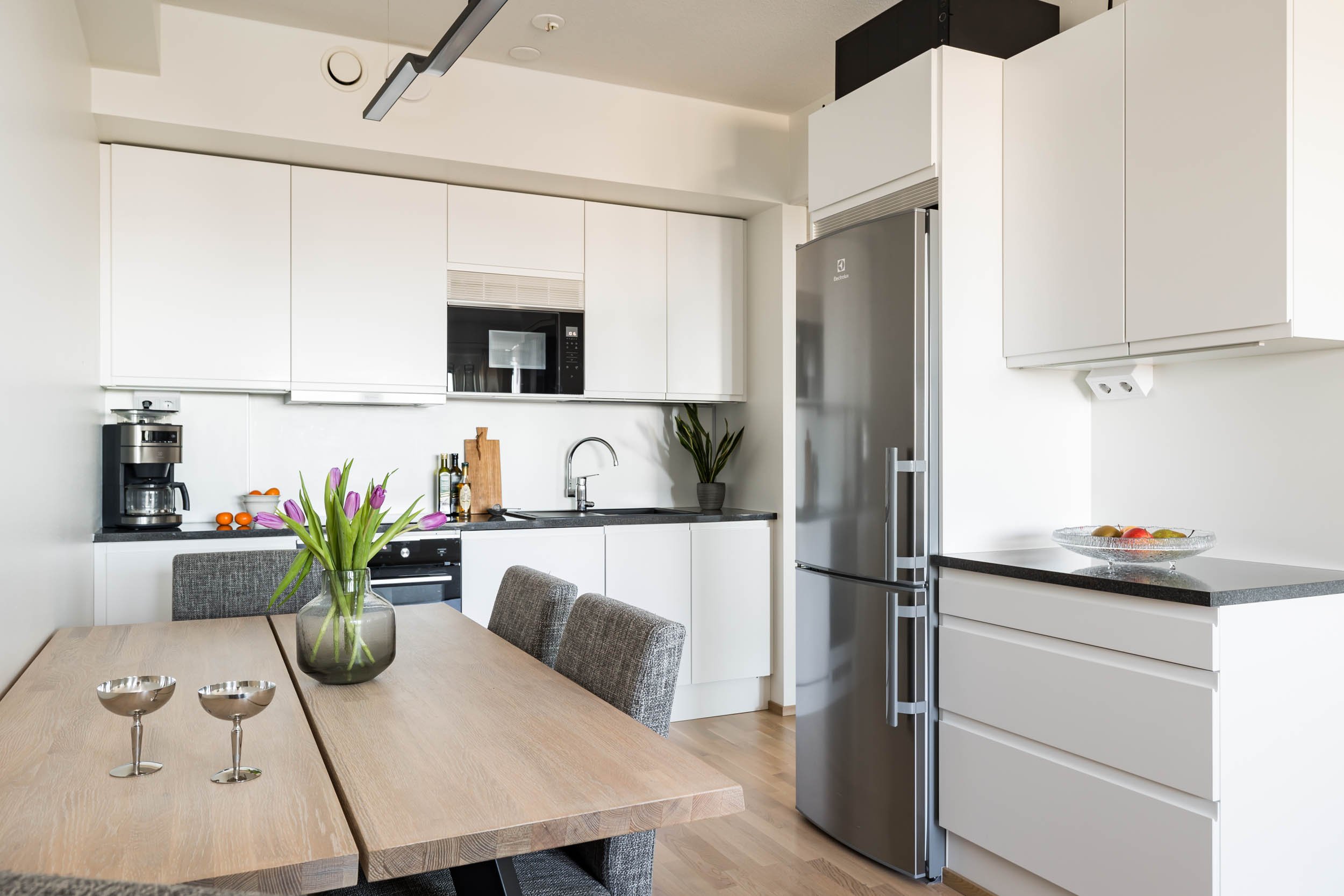 Asunnon 54 neliötä jakautuvat avaraan olohuoneeseen, makuuhuoneeseen järvinäköalalla, keittiöön sekä kylpyhuoneeseen saunalla. Avara olohuone yhdistyy saumattomasti modernin keittiön kanssa, jossa on integroidut kodinkoneet.