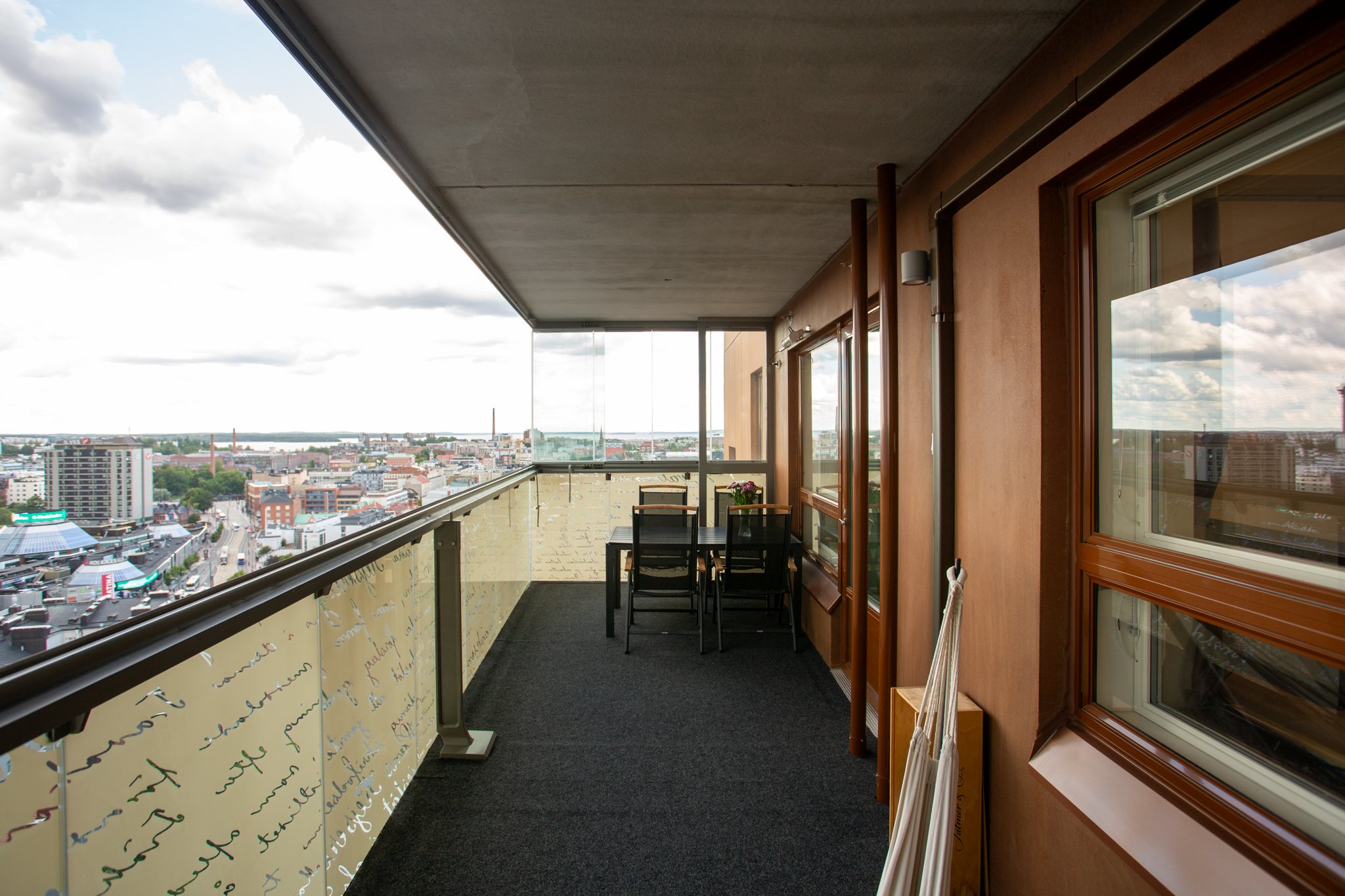 Olohuoneesta on käynti tilavalle lasitetulle parvekkeelle, jossa maisemat lunastavat viimeistään odotuksensa. Parvekkeella on lisäksi parvekelämmittimet pidentämässä sen käyttöaikaa pitkälle syksyyn. Kesähelteillä itse asunto pysyy viileänä olohuoneessa sijaitsevan ilmalämpöpumpun ansiosta.
